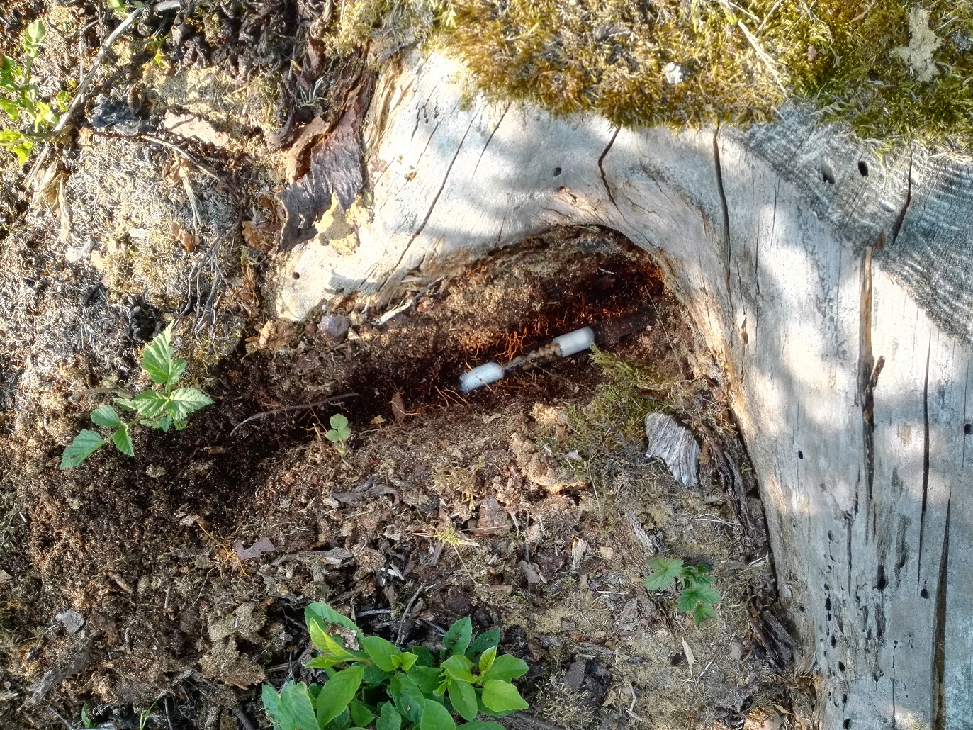 Der Strunk ist ideal erhöht. Somit kann sich kein Regenwasser sammeln. Ich ziehe im weichen Boden mit einem Stock eine ca 10 cm tiefe Rinne und platziere das Reagenzglas dicht am Strunk.