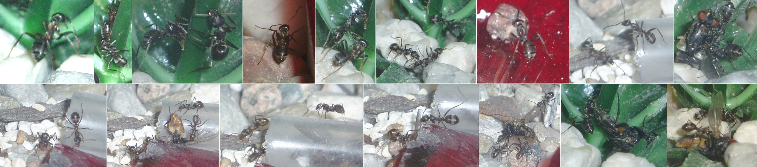 Brut sind nur selten ausserhalb des Nestes zu sehn. Diese "größeren" (ja eigentlich "normal" großen) Arbeiterinnen haben weniger Probleme Nahrung zu transportieren oder mit Gewalt durch das Eingangsröhrchen zu zerren, wenn es einer zu schwierig wird, kommen nach einger Zeit meist andere und helfen beim transportieren oder zerlegen zB größere Fliegen auch teilweise vor dem Transport. Diese Hilfe scheint sich jedoch mehr zufälllig zu ergeben, nach einiger Zeit stoßen einfach mehr und mehr Arbeiterinnen auf die Futterstelle. Ich konnte nicht bewusst beobachten, dass Arbeiterinnen dafür direkt rekrutiert wurden. Vielleicht war es auch durch Pheromone koordiniertes Teamwork, das kann ich natürlich nicht beurteilen^^. Maximal habe ich 5 Arbeiterinnen zur gleichen Zeit beim Transportieren einer Fliege beobachtet.