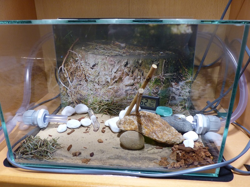 Die Arbeiterinnen graben dort jedenfalls mittlerweile zu 4 oder 5. Ein sehr großes Nest können sie dort aber nicht machen! Trotzdem hat sich schon ein staatlicher Hügel Sand vor dem Eingang gesammelt.