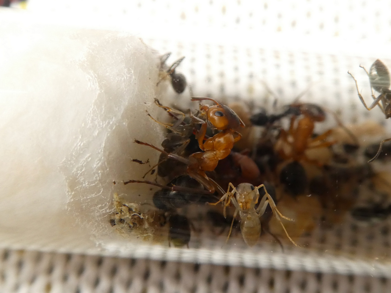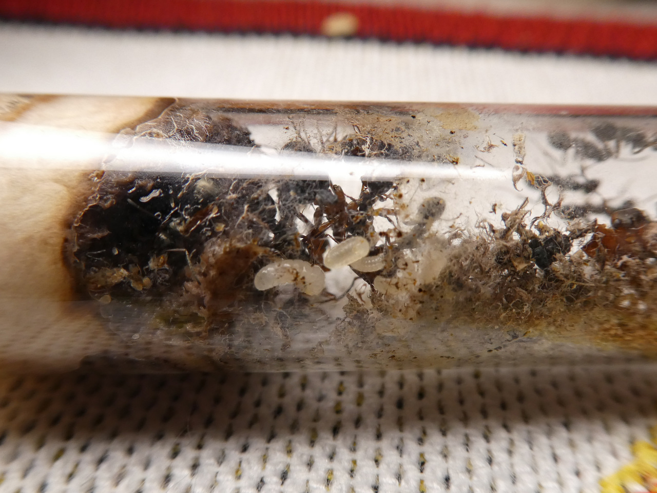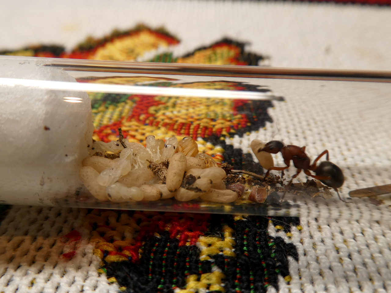 Ich schüttete der Gyne die Puppen direkt vor die Nase und nachdem sie erstmal alles vorsichtig mit ihren Fühlern beschnüffelt hatte, fing sie an, sie ein bisschen zu ordnen, was ich schonmal als Zeichen wertete, dass sie die Puppen annahm. Ich dachte mir, ein Tropfen Zuckerwasser tut ihr sicher gut und aus irgendeinem Grund kam ich auf die geniale Idee, sie direkt mit einer Kanüle zu füttern. Das mag bei anderen Ameisen funktionieren aber in diesem Fall war das keine gute Idee.