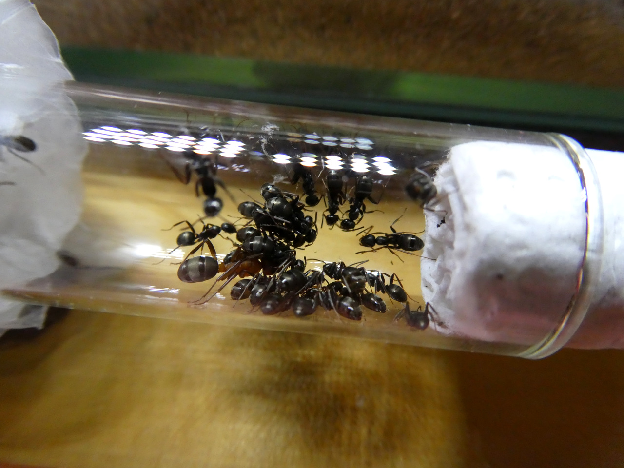 Ameisen-Fan 1 riet mir, das Reagenzglas nicht zu kühl zu lagern und aktuell haben sie es bei 24°C oben auf dem Schrank recht gemütlich. Wenn der Dachboden sich durch die Sonnenstrahlung aufheizt, wirkt die Decke wie eine Heizung.