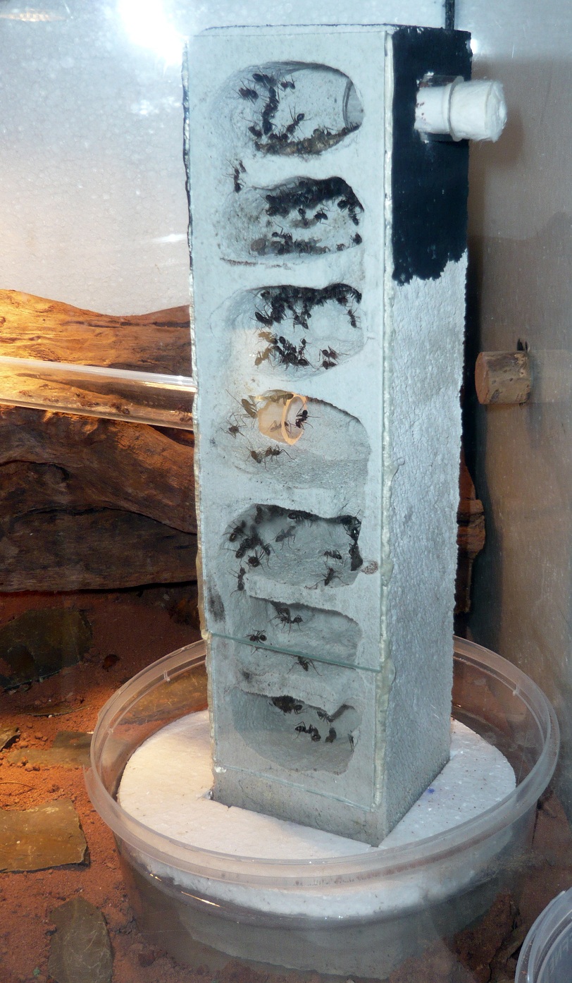 Die ersten Arbeiterinnen lugten hervor und begannen, die Wände der Plastikbox zu erklimmen. Das war keine leichte Übung für die Cataglyphis. Obwohl die Wände leicht perforiert waren, rutschten sie oft ab oder kamen nur schwer vorran. Damit ist das Glas des Aquariums ein weiterer Ausbruchschutz. Zur Unterstützung habe ich dann Zweige an und in die Box gesetzt. Nun war der Weg frei und zwei mutige Pionierinnen wagten sich in die Arena. Der Erkundungstrip endete allerdings schon nach 10cm. HONIG! Ich dachte, sie könnten eine Stärkung nach der langen Reise per Post gut gebrauchen. Recht gehabt!