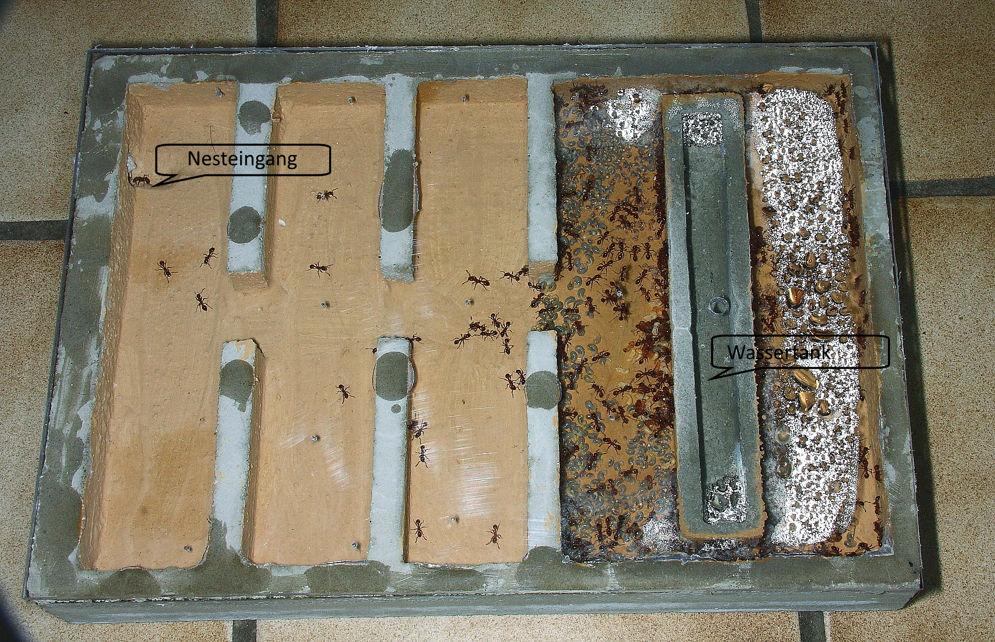 Rechts ist der Wassertank, den ich bald mal wieder füllen muss, diese Ameisen lieben feuchtere Nestbereiche.