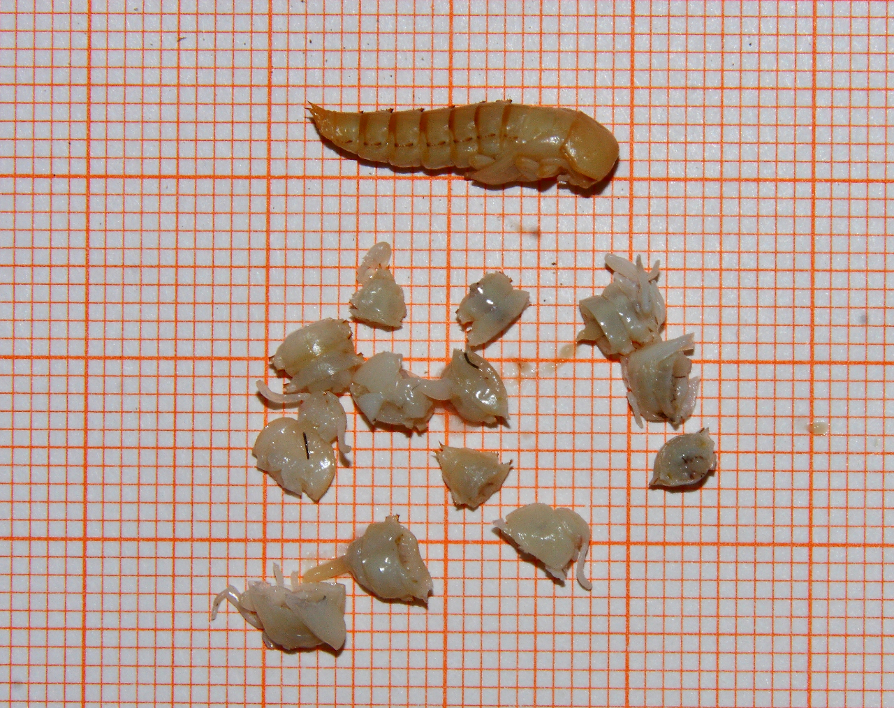 Eier, Larven, Puppen deren Anzahl erhöht sich sichtbar.