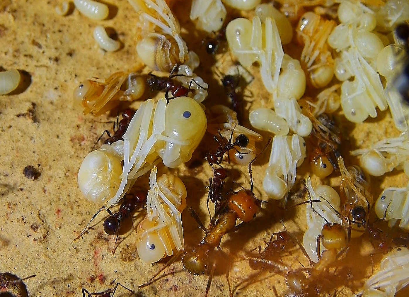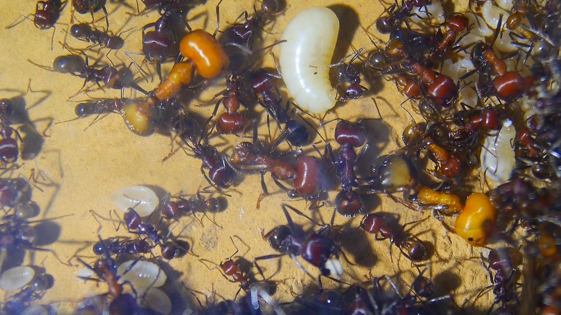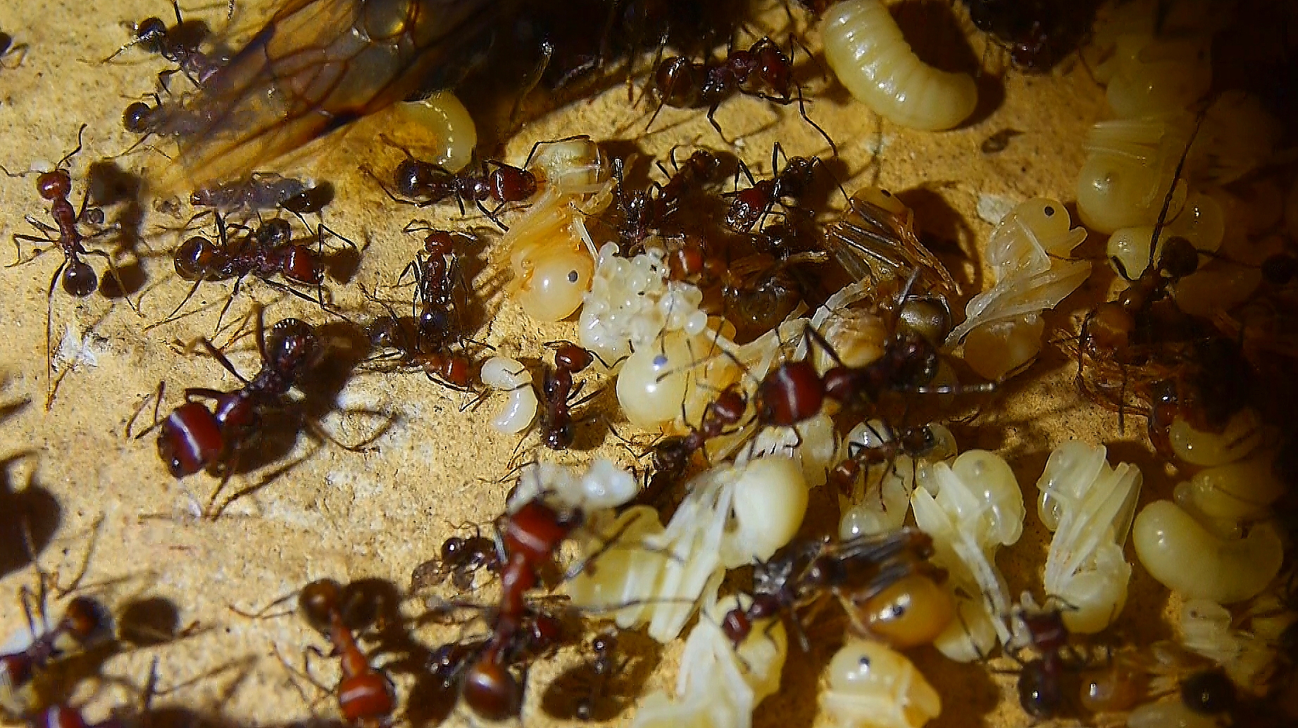 Mittlerweile gibt es unzähligeLarven , Puppen und eine erhöhte Anzahl an schlüpfenden Arbeiterinnen, ihr Nestbloch füllt sich wieder.