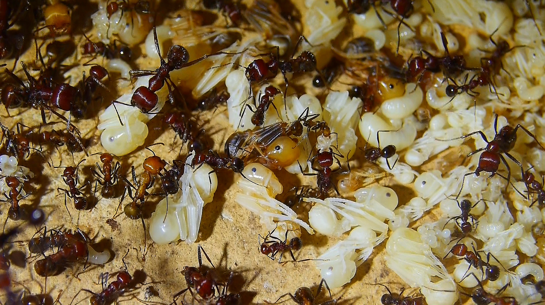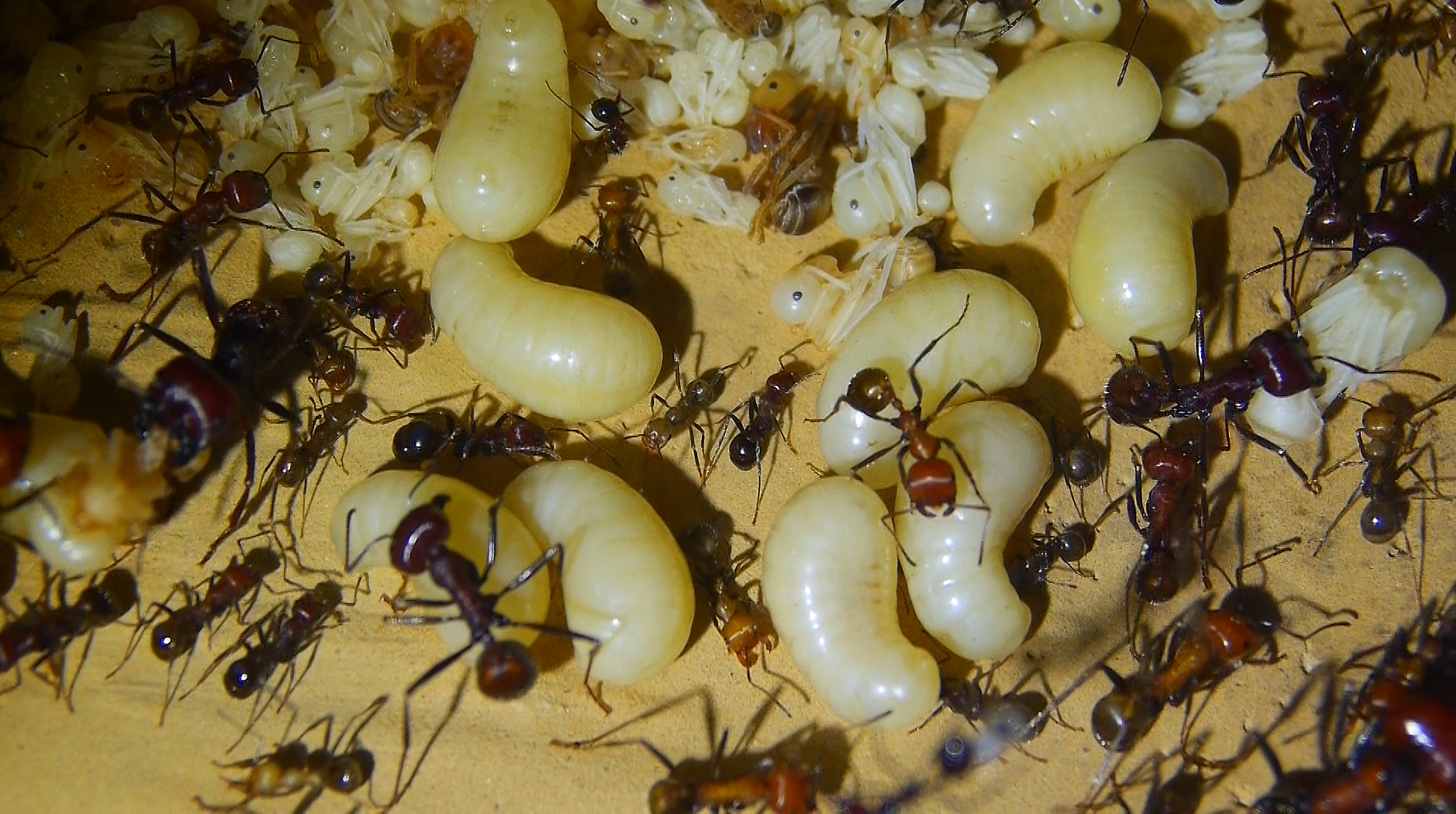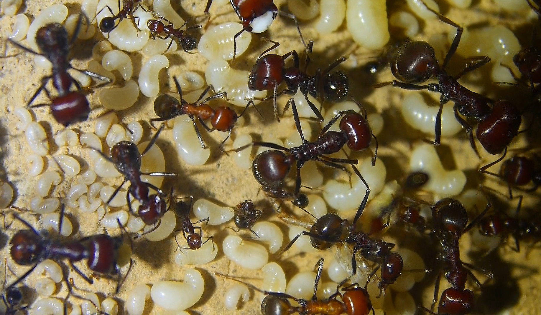 Mittlerweile gibt es unzähligeLarven , Puppen und eine erhöhte Anzahl an schlüpfenden Arbeiterinnen, ihr Nestbloch füllt sich wieder.