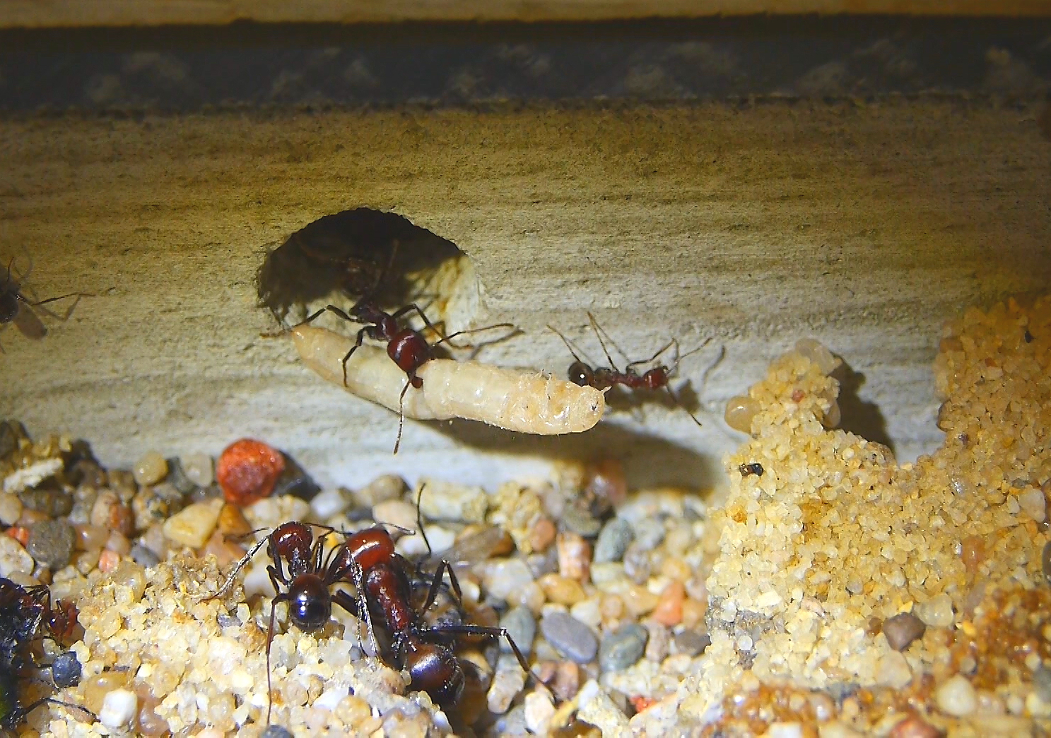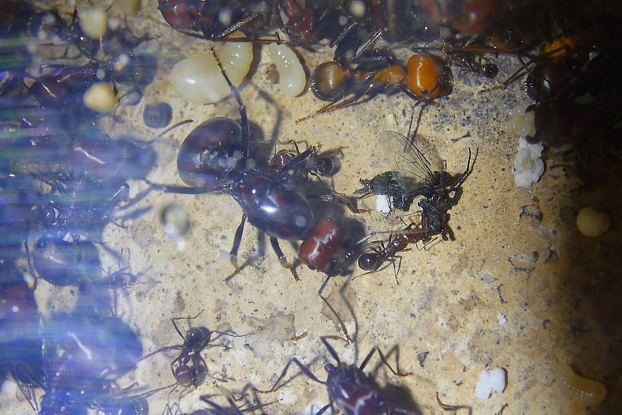 Habe es mal beobachten können, dass sie in größerer Anzahl schlupfreife Fliegenpuppen eingetragen haben, das war vielleicht ein Spaß, leider ist mir das Video nicht gelungen.