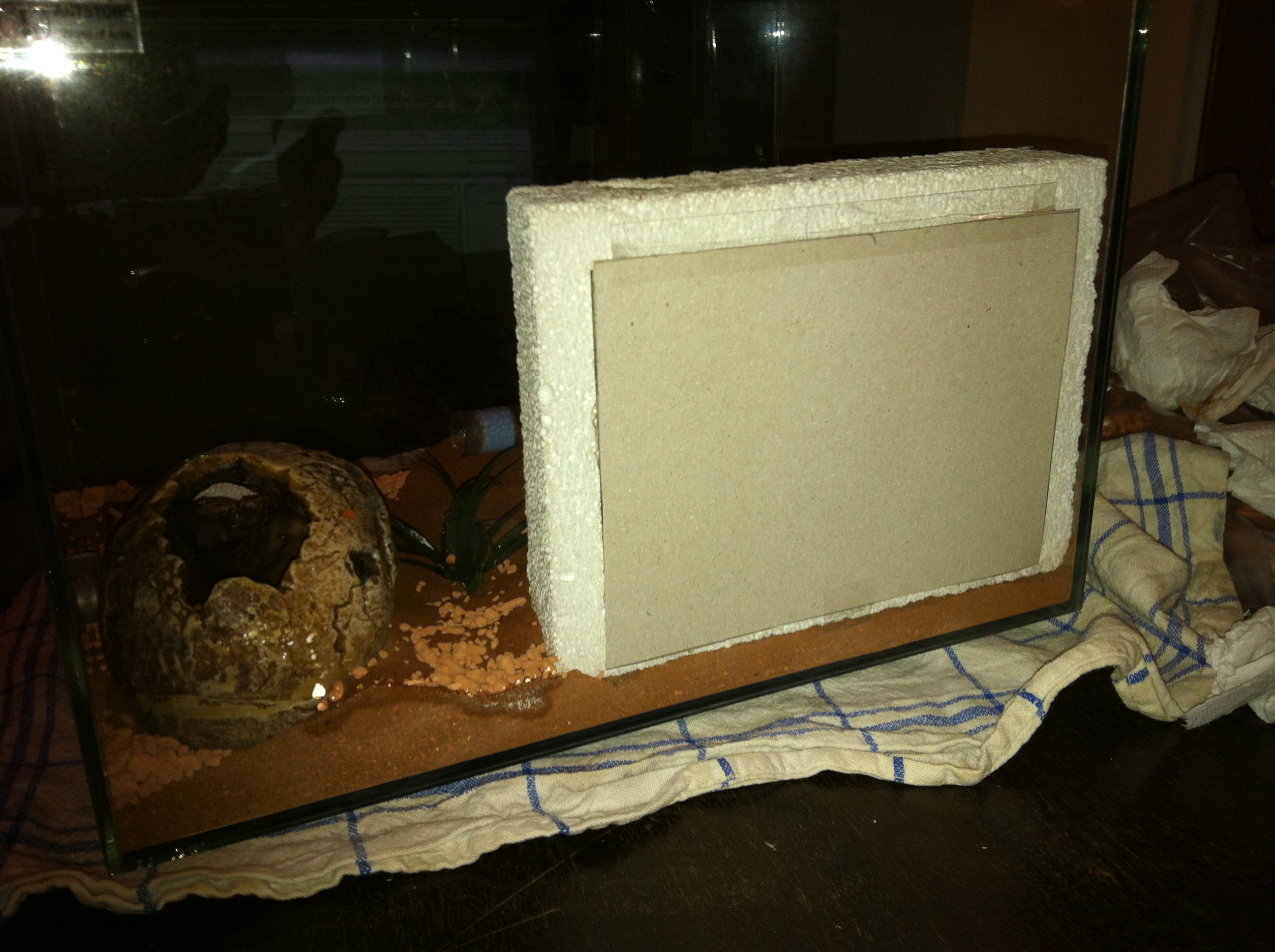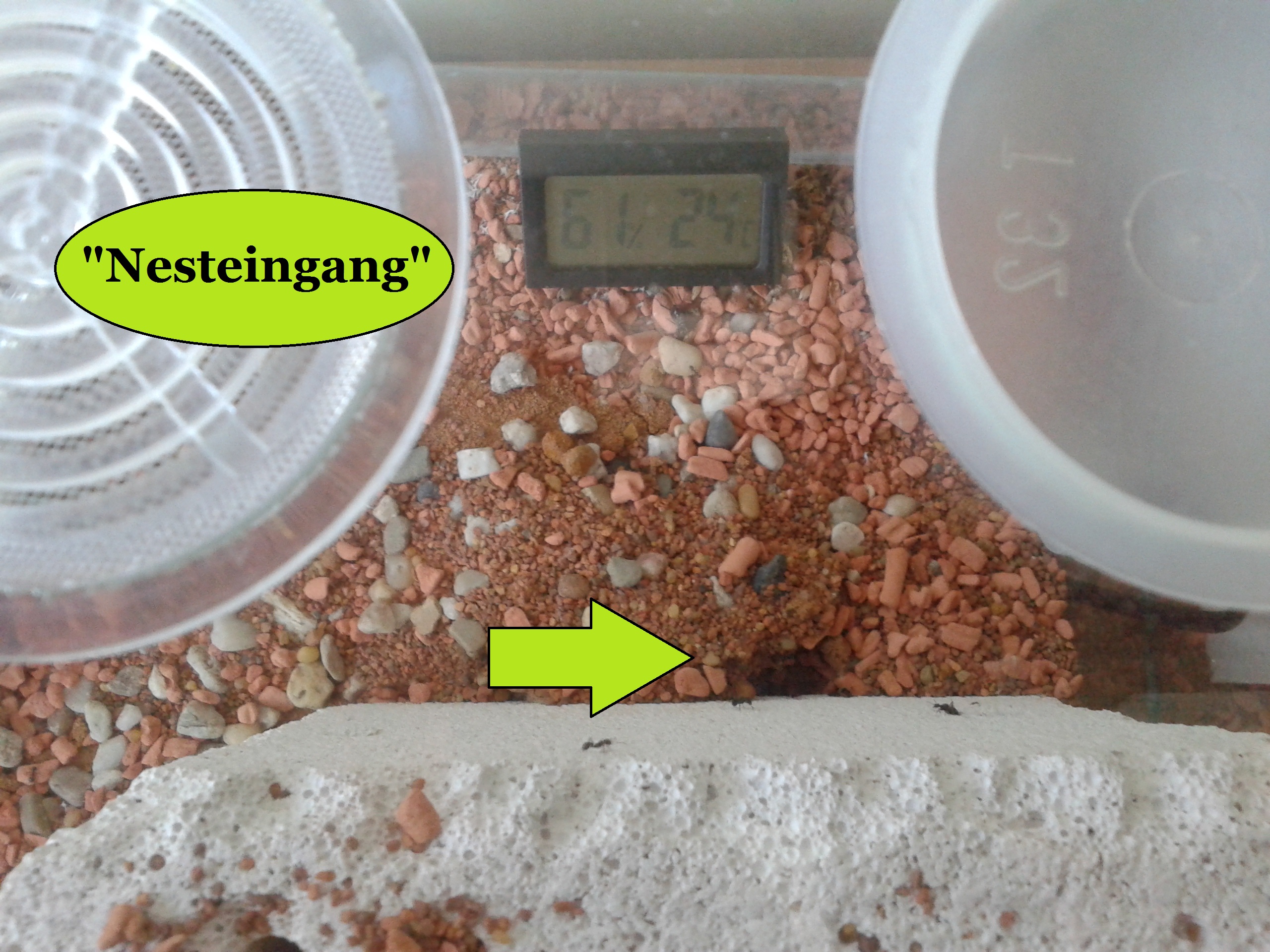 Das ist das selbstgegrabene Nest von der Kolonie. Wirklich gefallen tut mir das allerdings auch nicht. Der Stein sollte ursprünglich mal entfernt werden, sobald ich ein externes Nest anbiete. Das externe Nest soll zum selbstständigen Nestbau anregen, Becken mit Sand, Seramis und Heizmatte - aber erst im nächsten Jahr. Hier werden oft Puppen gelagert, ob das mit der Wärme der Heizmatte in Verbindung steht? Bestimmt! :P