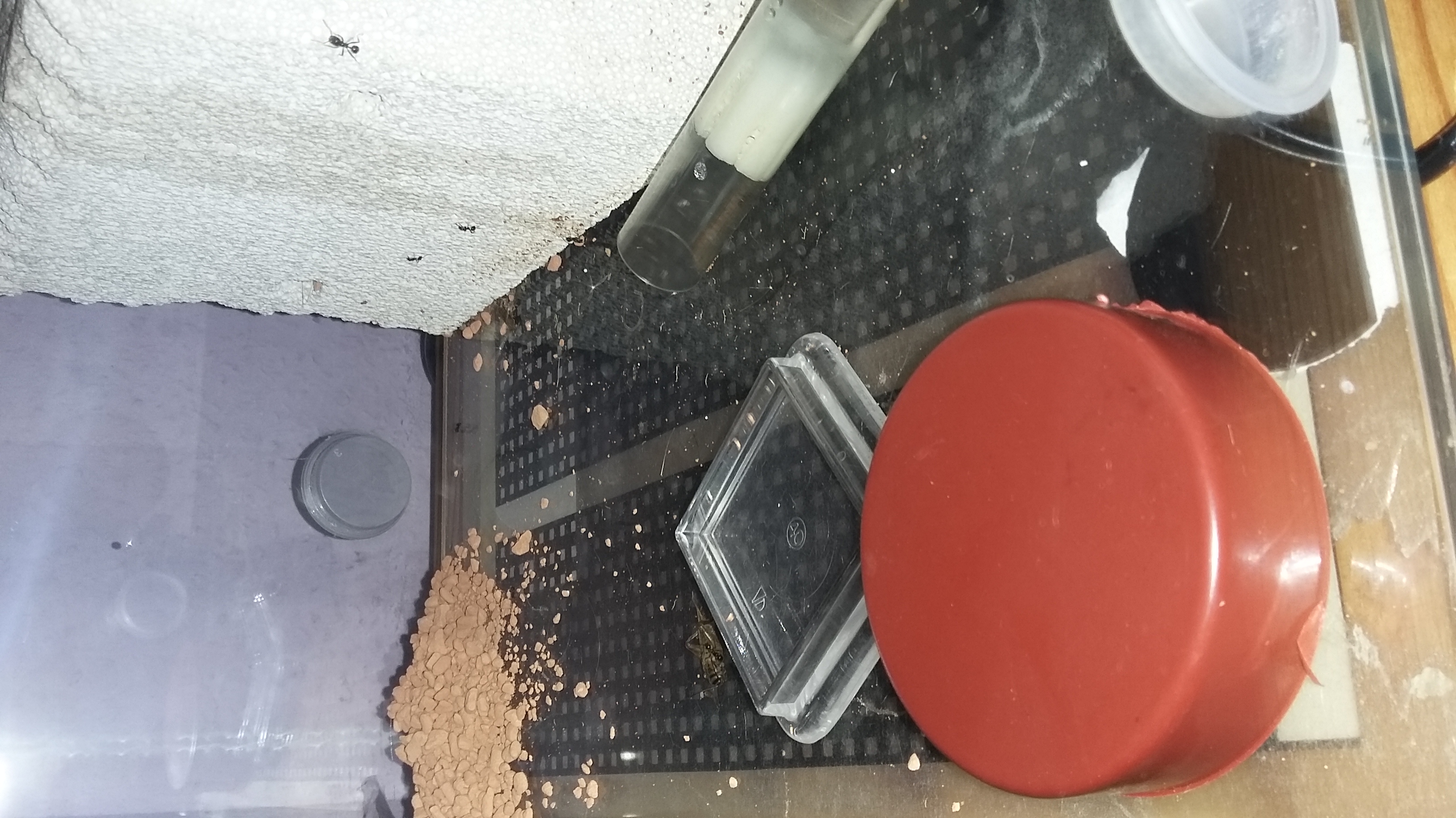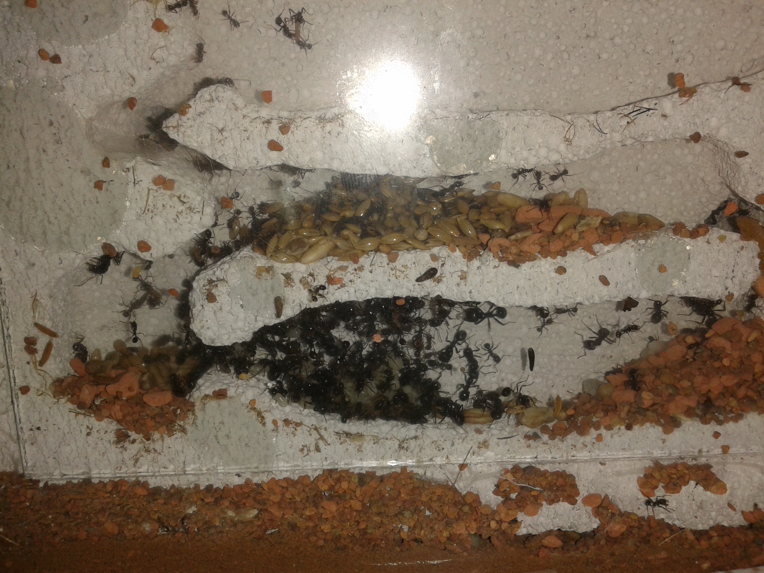 Die Messor barbarus entwickeln sich weiterhin sehr gut. Momentan verzichte ich auf Zugabe weiterer Samen/Körner und reiche alle 3-4 Tage ca. 4-5 kleine Heimchen (die Steppengrillen werden gar nicht angenommen und werden unverwertet auf den Müll transportiert). Das ist natürlich keine Böswilligkeit, der Samenvorrat scheint mir aktuell aber ausreichend groß zu sein. Die Temperaturen sind ein wenig niedriger geworden, tagsüber herrschen in dem Becken um die 23-24 Grad und eine LF von 60 %. Gelegentlich schalte ich noch die Heizmatte an um eine kurze Sonnenperiode zu simulieren, ob mir das nun gelingt oder nicht sei mal dahingestellt, geschadet hat es derzeit nach meinen Beobachtungen auf jeden Fall nicht.
