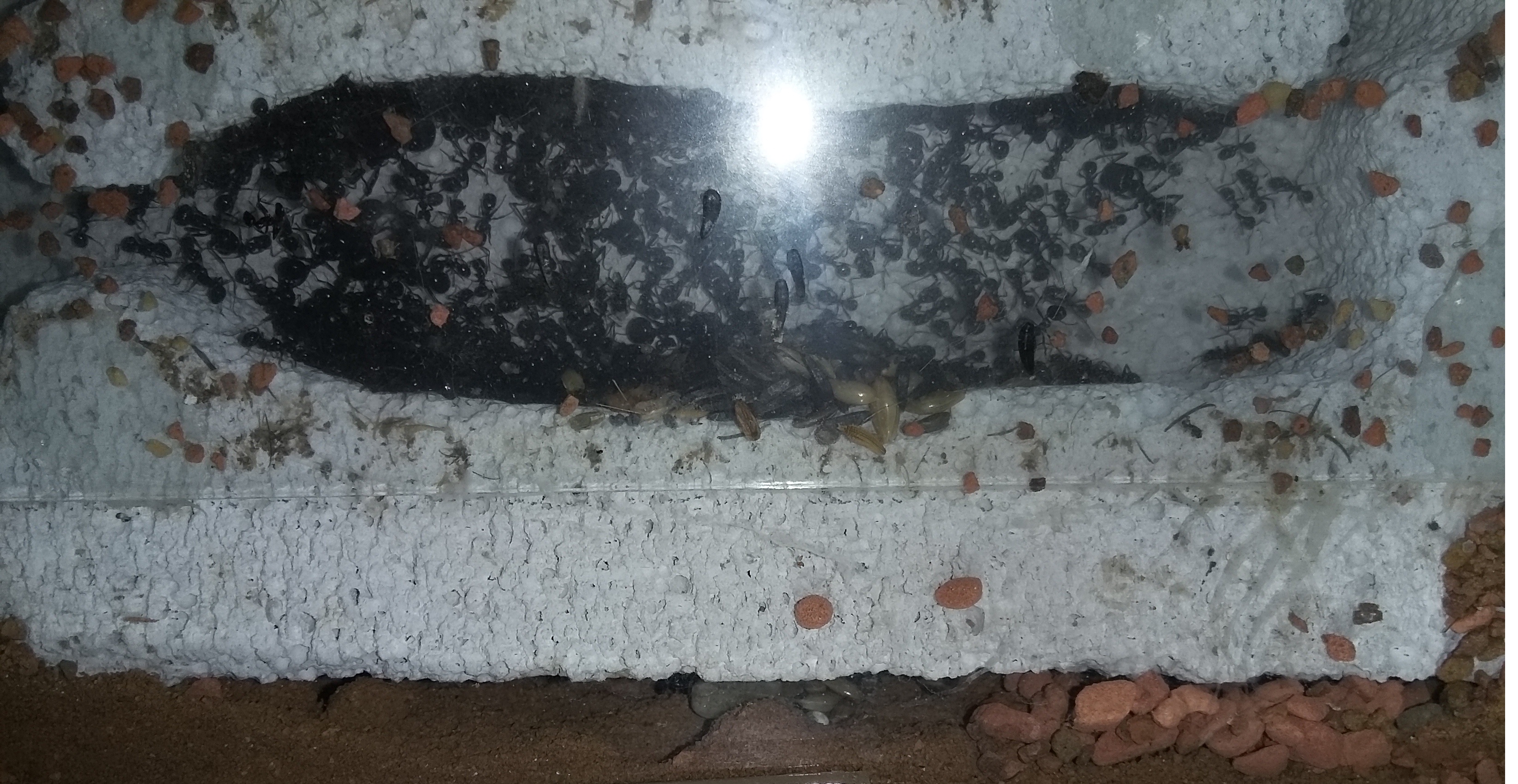 Zu meiner Überraschung waren gut 20 Ameisen unter dem Y-Tong, sodass man sagen kann, dass die Kolonie auf jeden Fall in der Winterruhe auch ordentlich zugelegt hat. Sicher nicht so aktiv wie im Sommer, trotzdem wenig, aber konstante Brutaufzucht. Die Heizmatte wird jetzt aber einige Stunden wieder in Betrieb genommen.