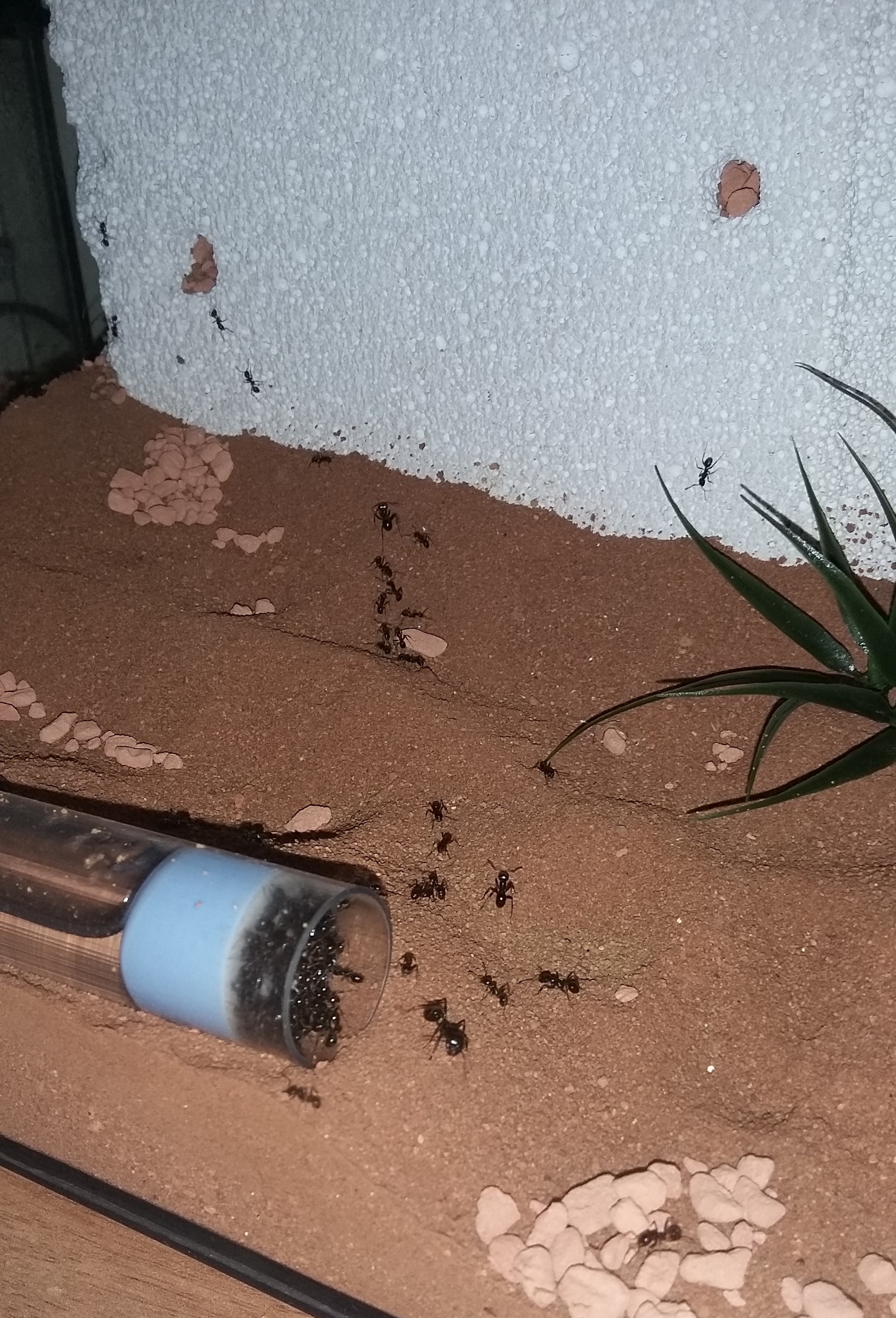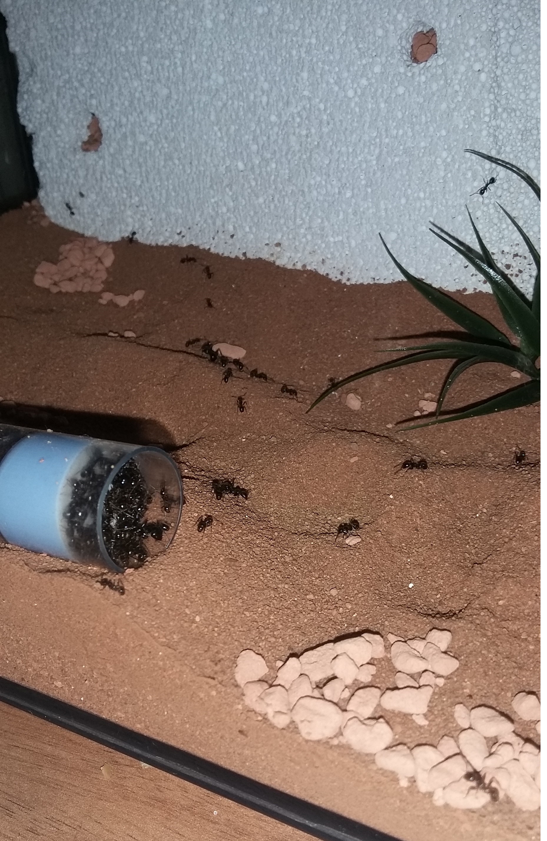Momentan haben die Ameisen 3 Nester, wovon eins immer gut bevölkert ist und 2 wenig, das geschieht oft im Wechsel. So scheint aktuell der Y-Tong die Wohnstube zu sein. Bei anderer Wetterlage, Heizmatte und Befeuchtung wird umgehend geräumt. Hier schonmal 2 der besagten Nester.
