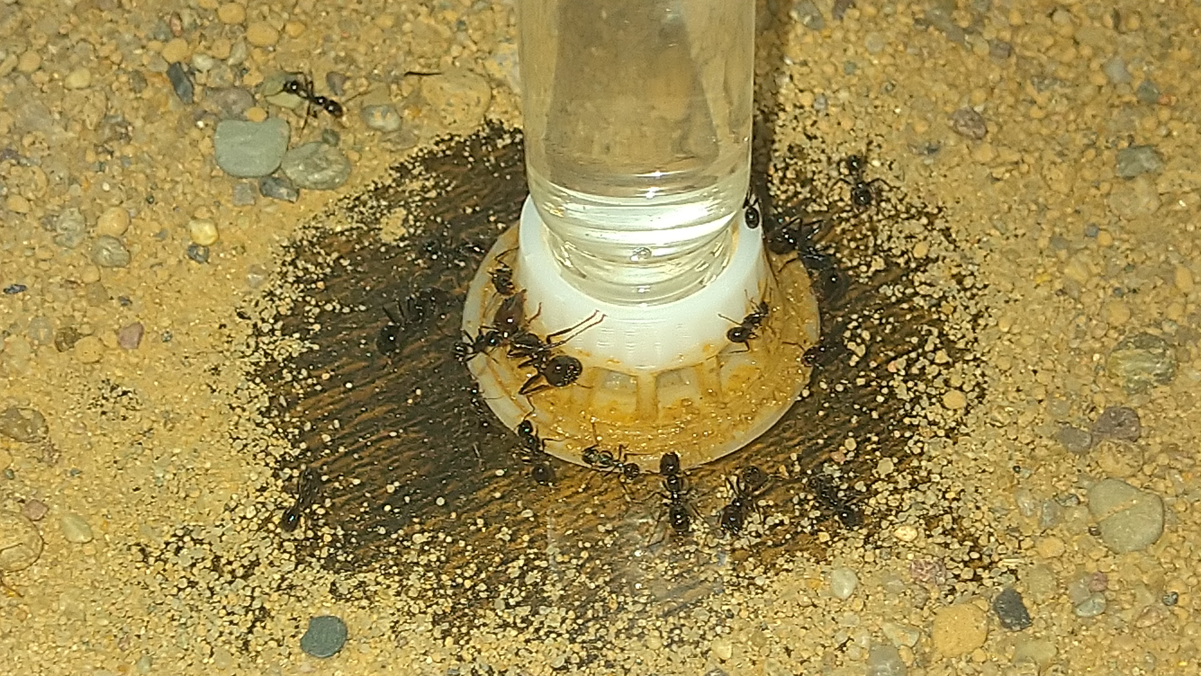 Ein gutes Beispiel ist die Tränke. Wo andere Arten einfach ihrenNektar oder Wasser trinken. Müssen Messoren alles mit feinem Sand bekleben so das der untere 3D gedruckte Teil leicht feucht wird. Von da trinken sie dann. Das Bild ist nicht so gut, man erkennt aber wie der Sand am Spender glänzt von der Feuchtigkeit.