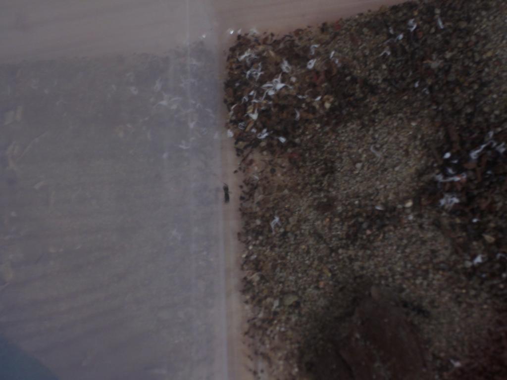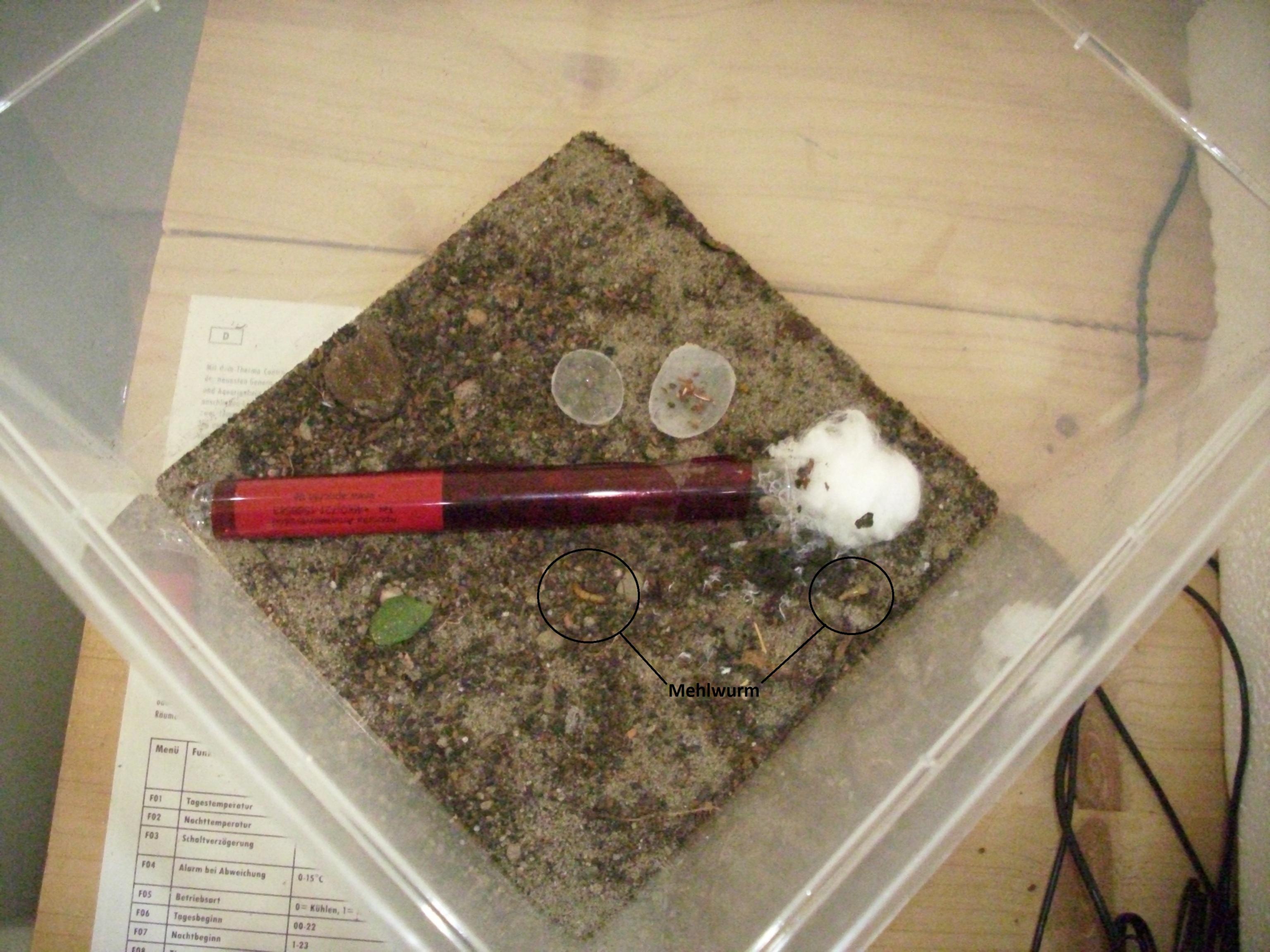 Heute morgen war der Mehlwurm nicht mehr auf dem Platz. Die beiden HÀlften des Mehlwurms wurden durch den BehÀlter getragen und liegen nun nÀher am RG.