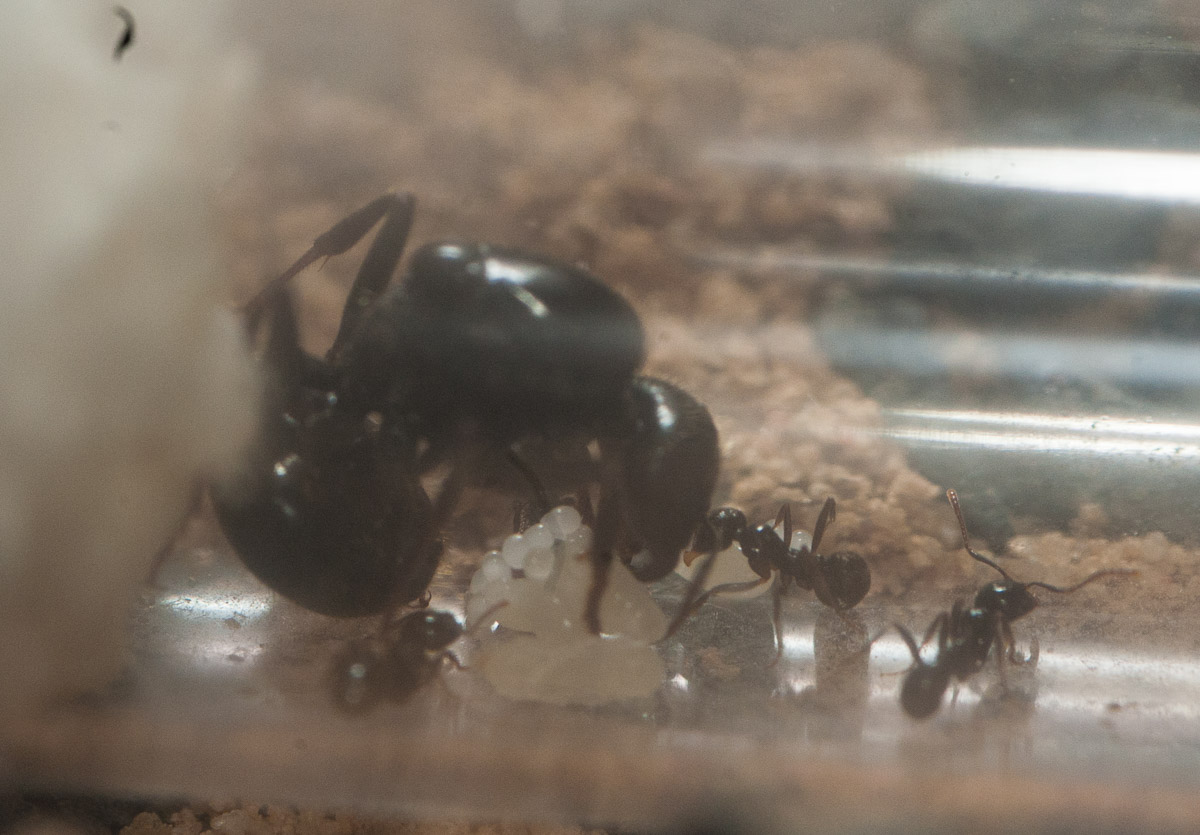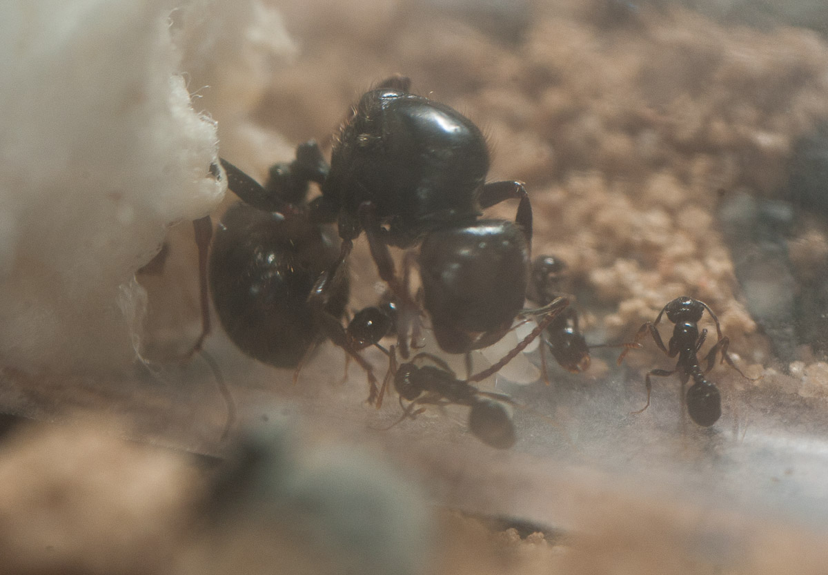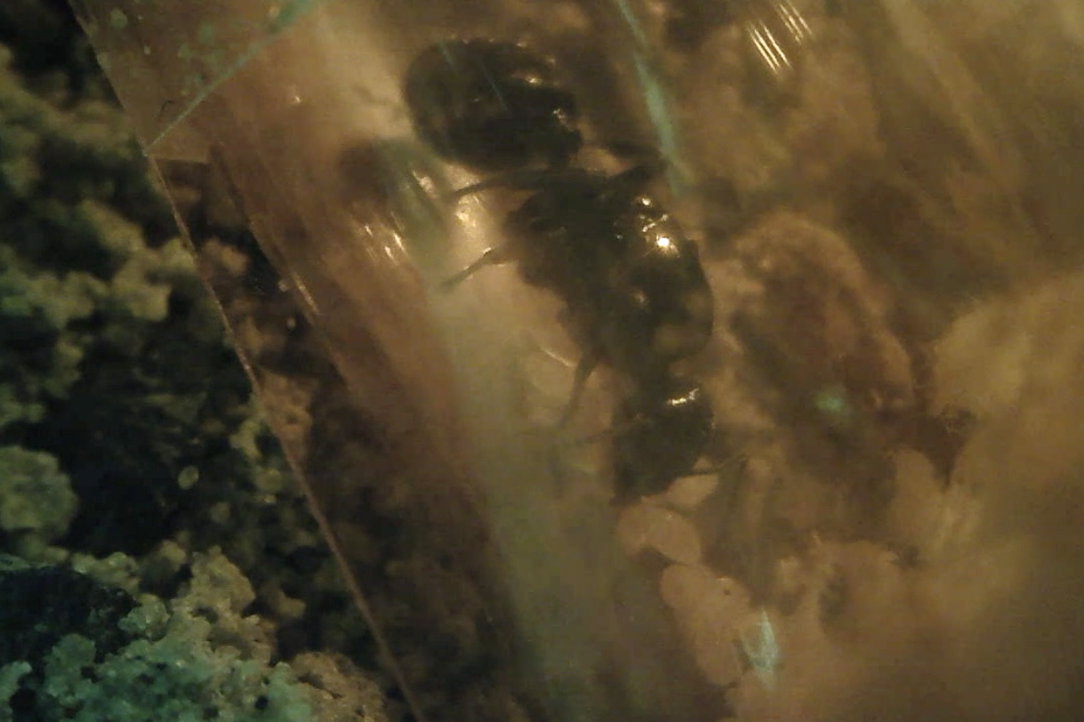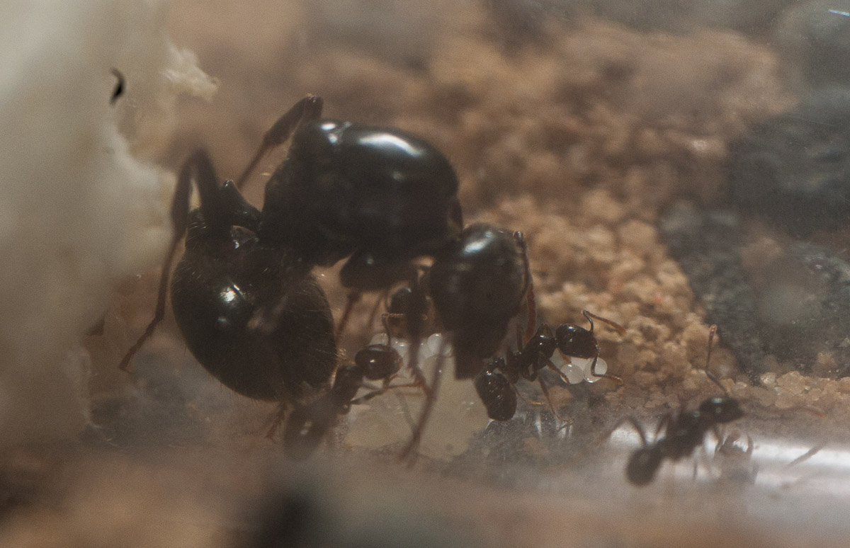 Die Arbeiterinnen habe ich bisher noch nie drauĂen gesehen. Wenn es dunkel ist kommt dieGyne aus dem Reagenzglas, wandert umher oder buddelt teilweise kleine Löcher.