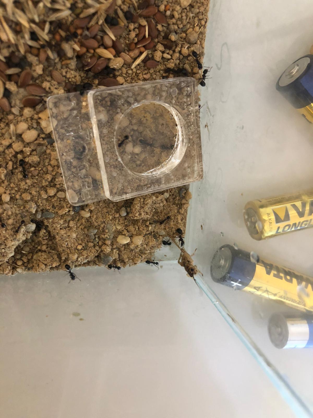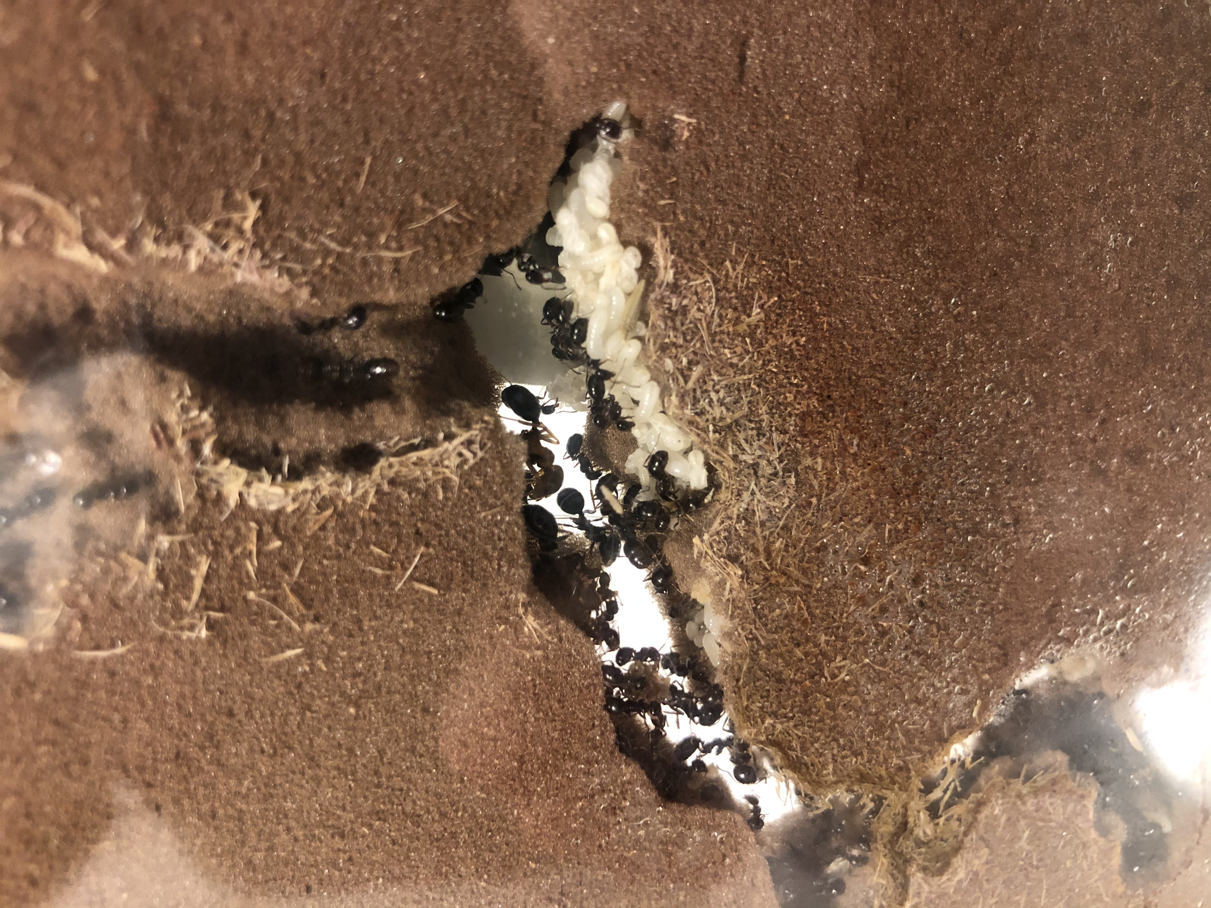 Au den Bilder sind die Ameisen im Reagenzglas, sowie der Umzug in das Nest zu sehen. Soweit ich mit erinnern konnte habe ich damals, ich weiĂ man sollte das nicht tun, etwas nachgeholfen sie zum Umzug zu bewegen. Ich hatte ein Loch in das dig fix Material gepresst und die Ameisen aus dem Reagenzglas geschĂŒtttelt.