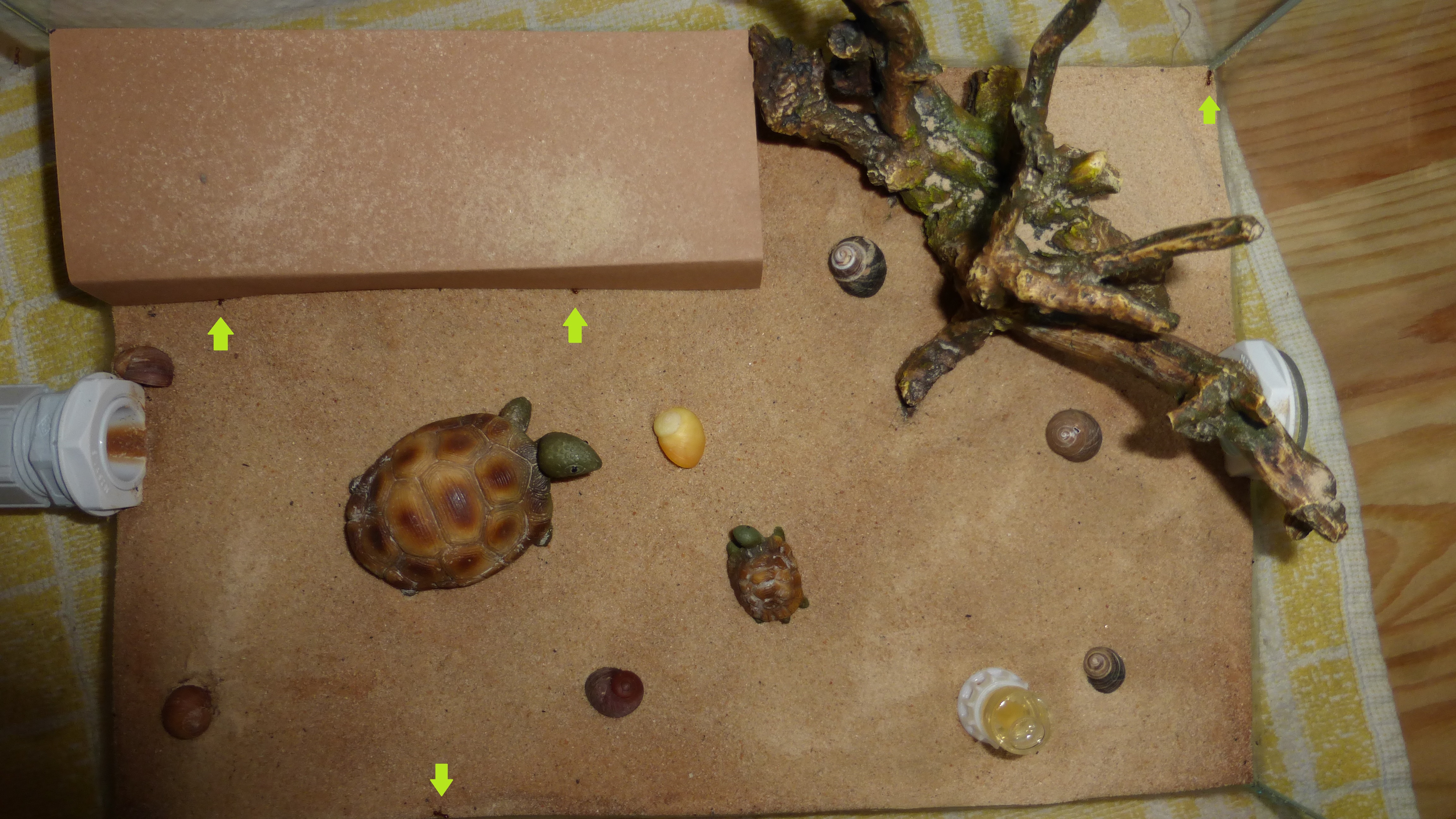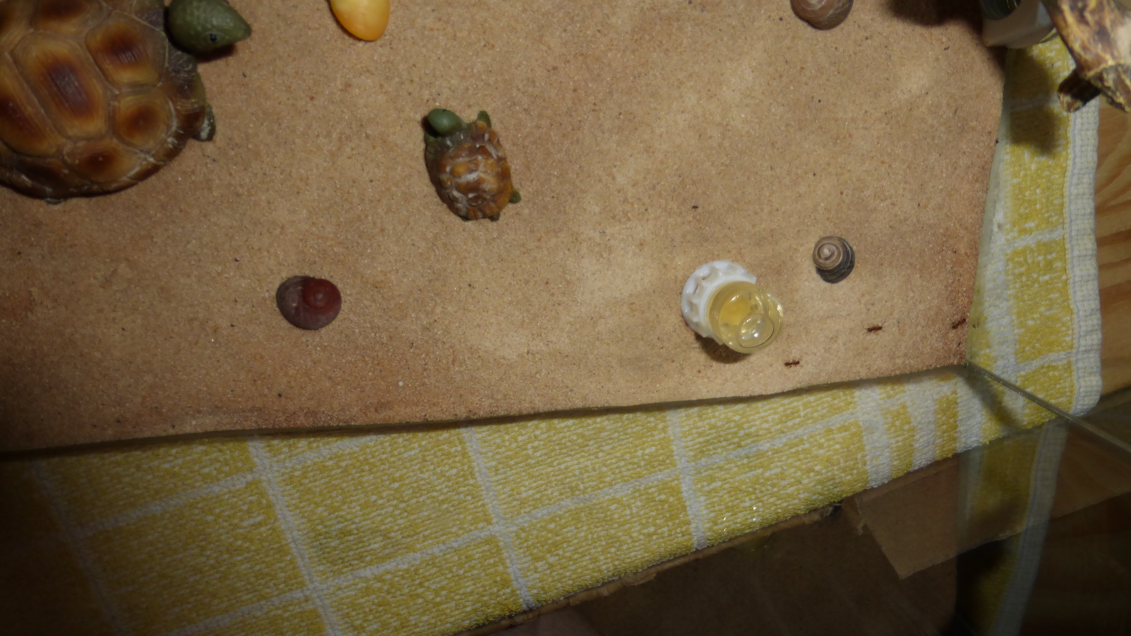 Als Dekoration hab ich ein paar Muschelschalen, Schneckenhäuser und eine Art Kunstbaum/Wurzelstück aus Resin benutzt, sowie ein paar alte Schildkrötenfiguren, die in der Dose lagen, in der die Muschelschalen waren.