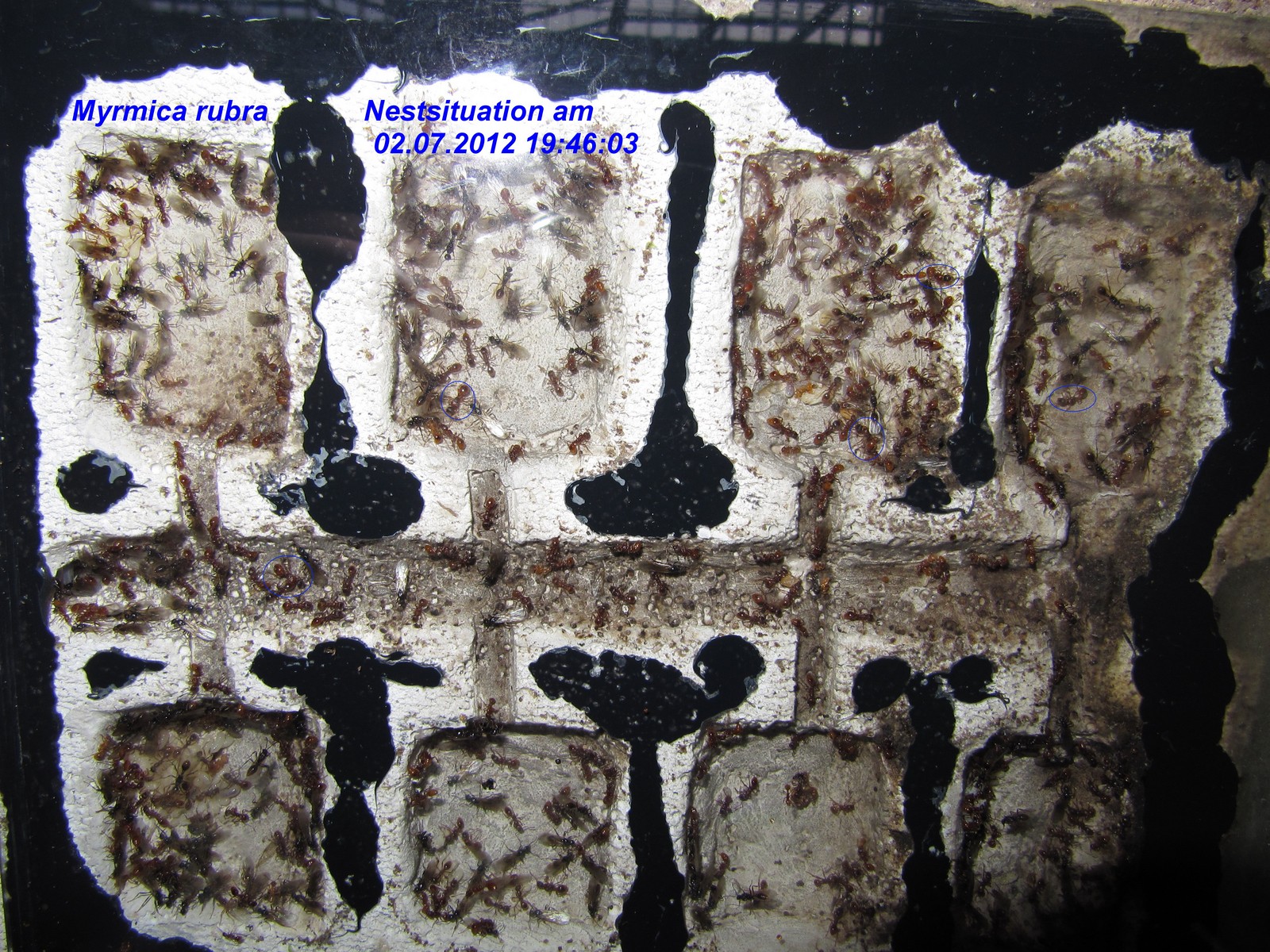Mitte August habe ich durch einen Fehler Wasser in die Nestkammer des Schlauchnests gedrückt, ohne dies gleich zu bemerken. Bei meinem nächsten Kontrollblick war der Schlauch zu meinem Erstaunen verlassen und voller Kondenswasser. Die Suche nach dem Verbleib der Kolonie brachte vorerst kein Ergebnis. Weder im RG noch im Ytong, welcher eine noch unbesetzte Kammer hatte, war die Kolonie anzutreffen. Sie muss zu dieser Zeit ihr Unterkommen im Erdteil der Arena gefunden haben und zumindest einen Teil der dort gründenden Kolonien übernommen haben. Als sie nämlich Anfang September wieder, diesmal im Ytong auftauchte, war die Anzahl der Arbeiterinnen und Bruteinheiten überraschend hoch (Video 3).