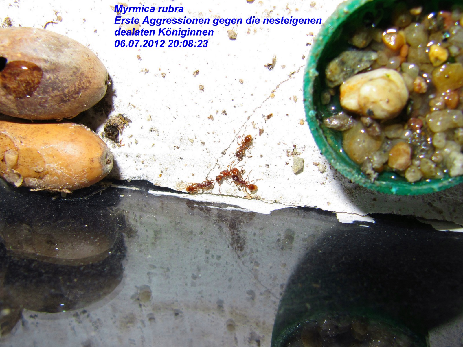 Zunehmende Aggression der Arbeiterinnen gegen die vermeintlich adoptierten Königinnen ab 06.07.2012 Ab diesem Zeitpunkt musste ich in der Arena immer häufiger diese Bilder (Bilder 1 und 2)) sehen.