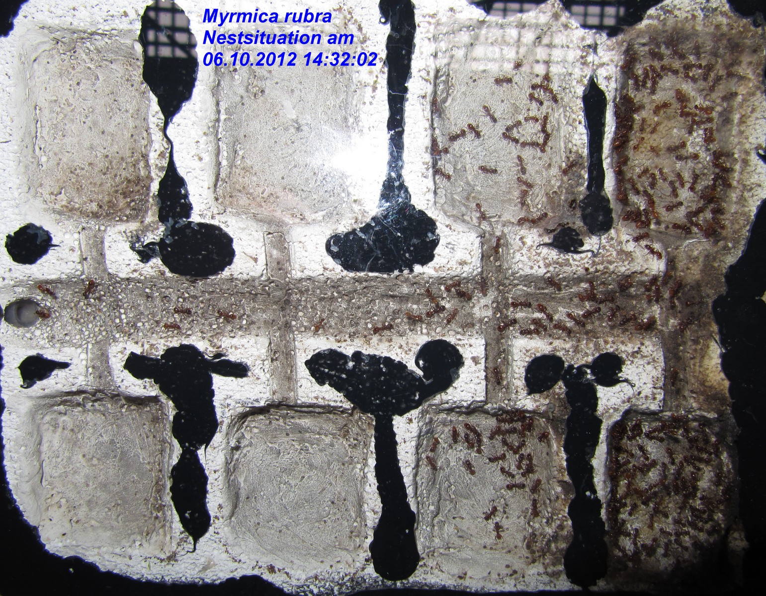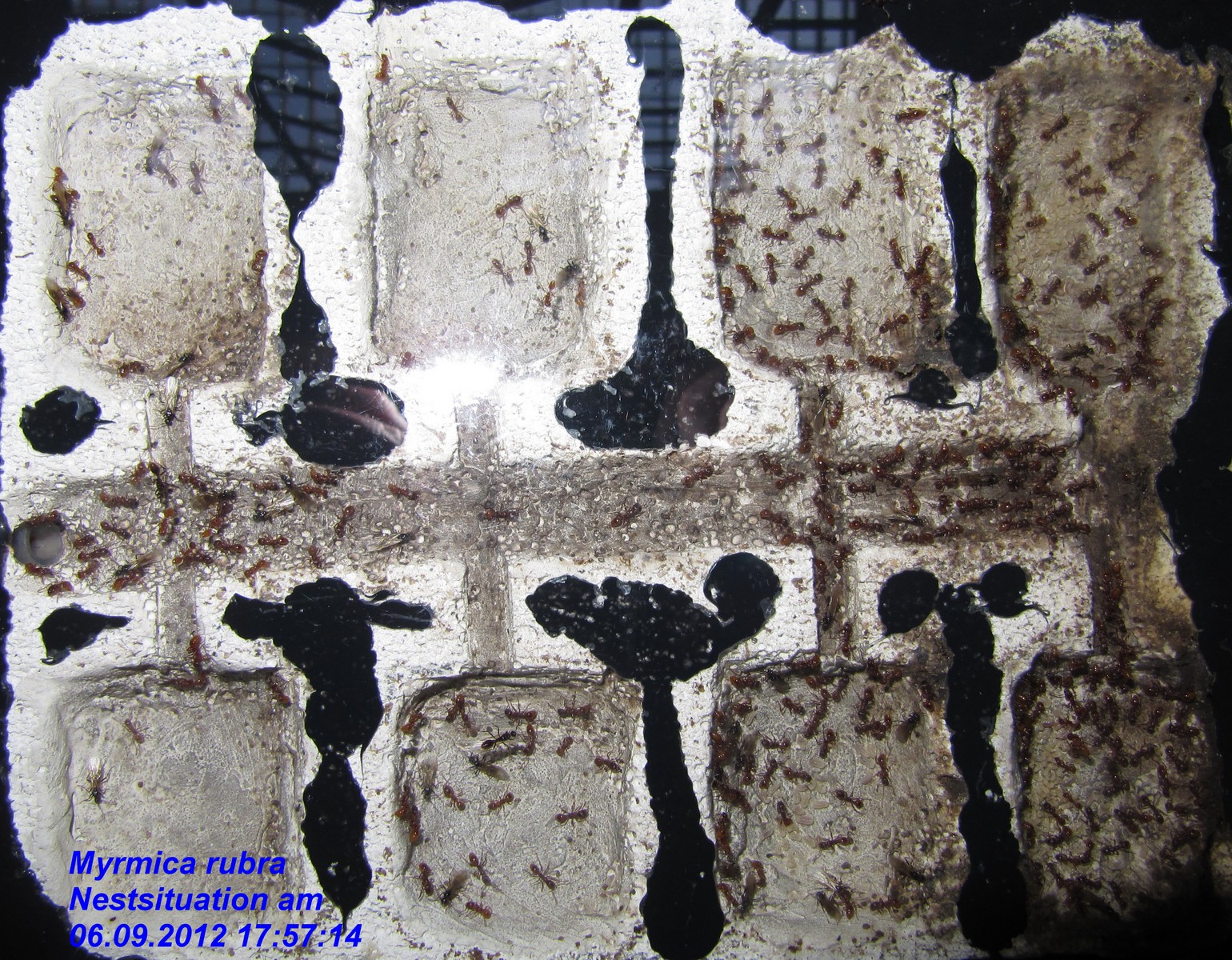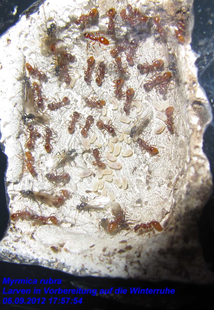Königinnen, die ich in der Arena sehen konnte, aus der Arena gesammelt und in eine neue Arena mit mehreren RG`s und einem angeschlossenen Porenbetonnest gegeben. So wurden nach und nach mehr als 30