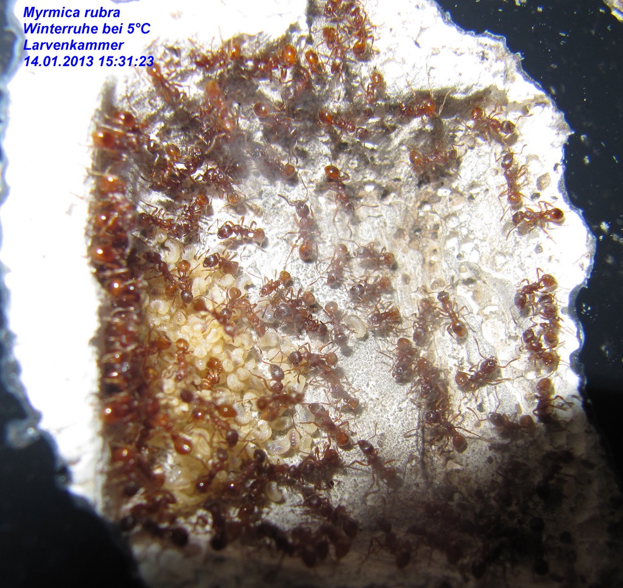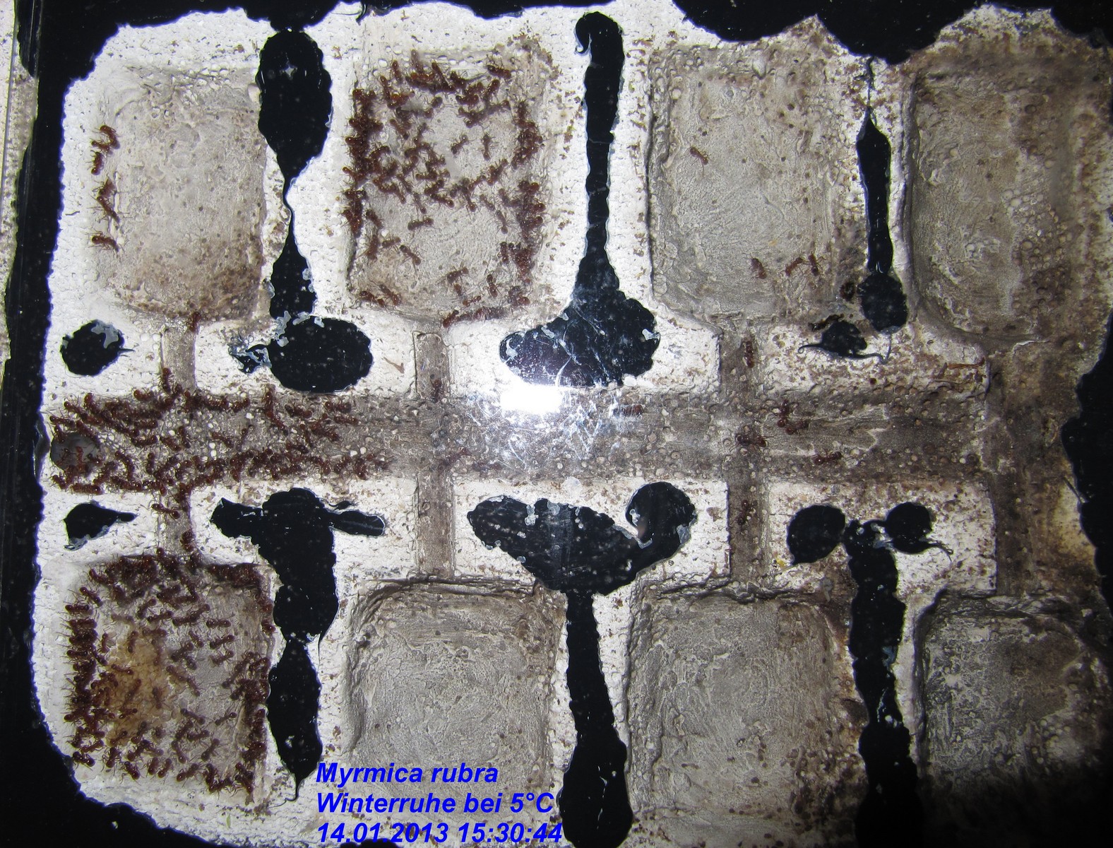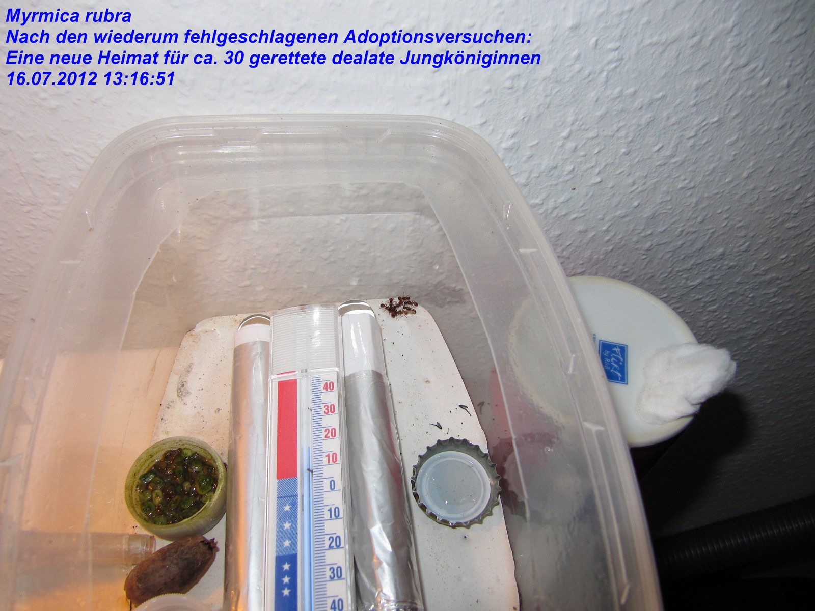 Königinnen, die ich in der Arena sehen konnte, aus der Arena gesammelt und in eine neue Arena mit mehreren RG`s und einem angeschlossenen Porenbetonnest gegeben. So wurden nach und nach mehr als 30