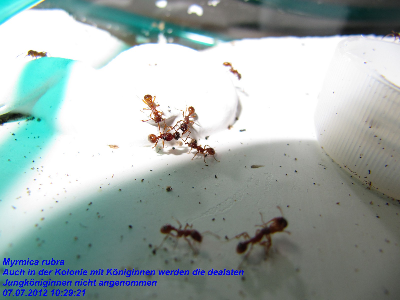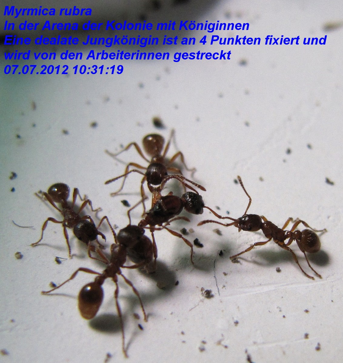 Königinnen in der Arena zu sehen, die von den Arbeiterinnen zuerst mit sanfter Gewalt aus dem Nest gezerrt worden waren und später fraglos durch die in den Bildern zu sehenden Streckgemeinschaften der Arbeiterinnen getötet worden wären.