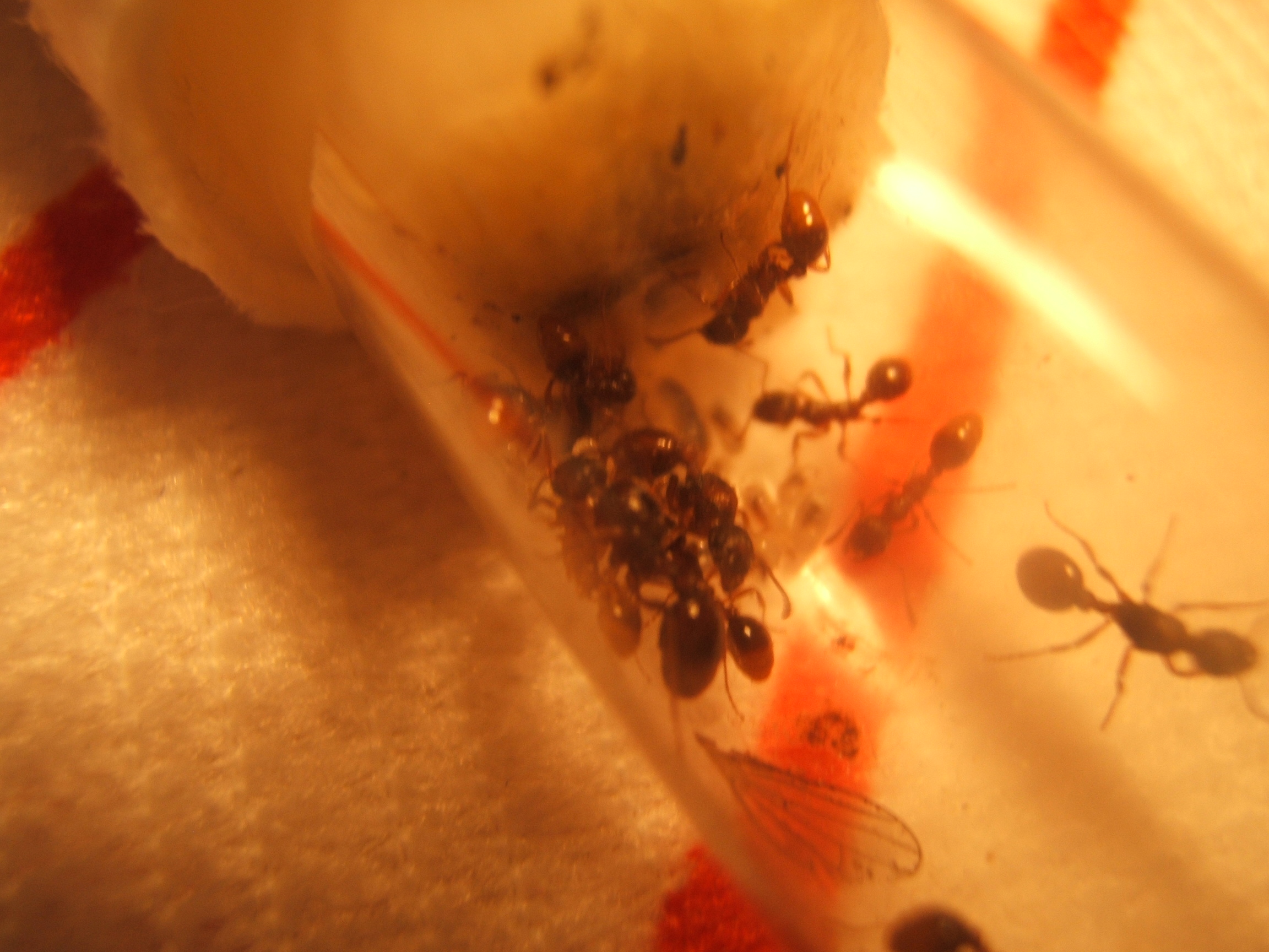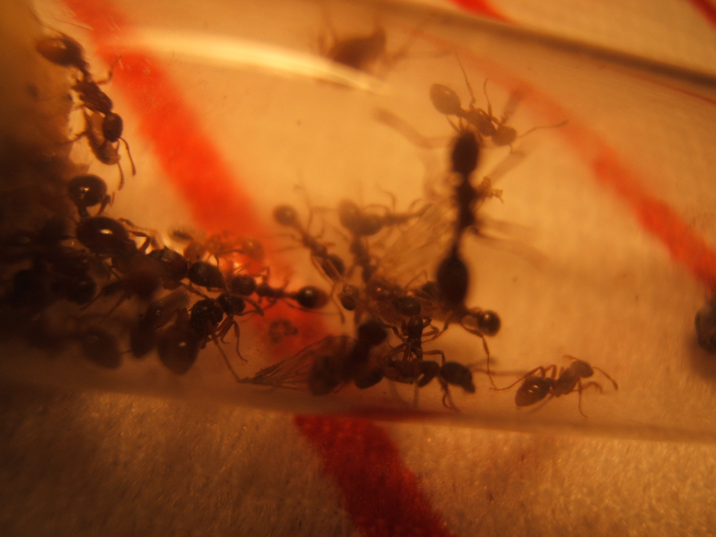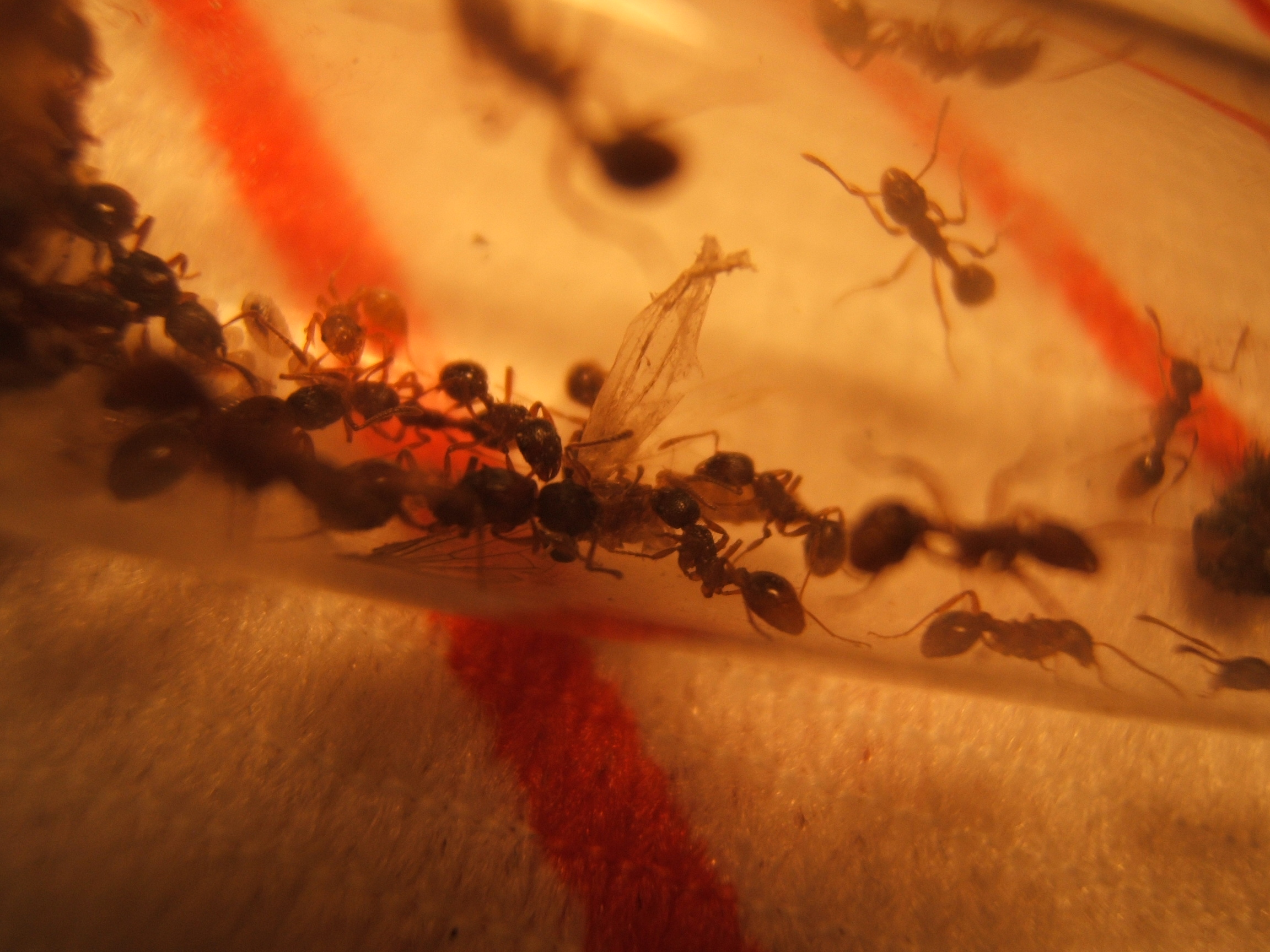 Hey Leute ich weiß nicht ob ich es noh schaffe zu Posten ohne Bilder zu hinterlassen.Mit Hilfe von Skazi hab ich die Bilder etwas bearbeitet.hoffe es gefält euch!Auf den Bildern Seht ihr wie sie einen kleiner Falter zerlegen den ich heute morgen gefangen hab.Auf den anderen seht ihr von mir die entpuppte Ameise!Ja es muss heute morgen gewessen sein den gestern Abend war sie noch eine