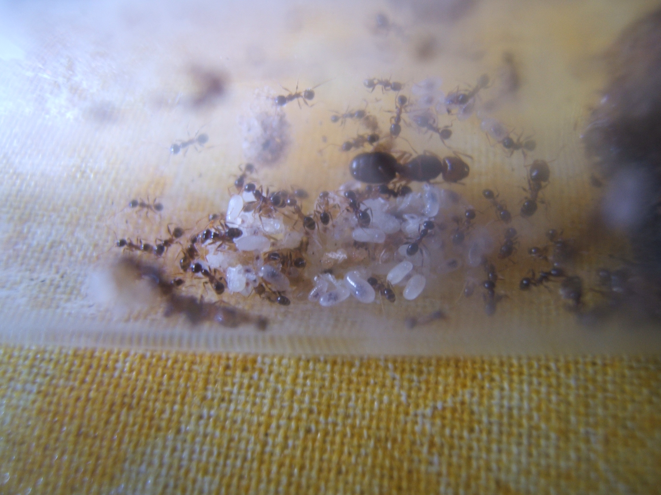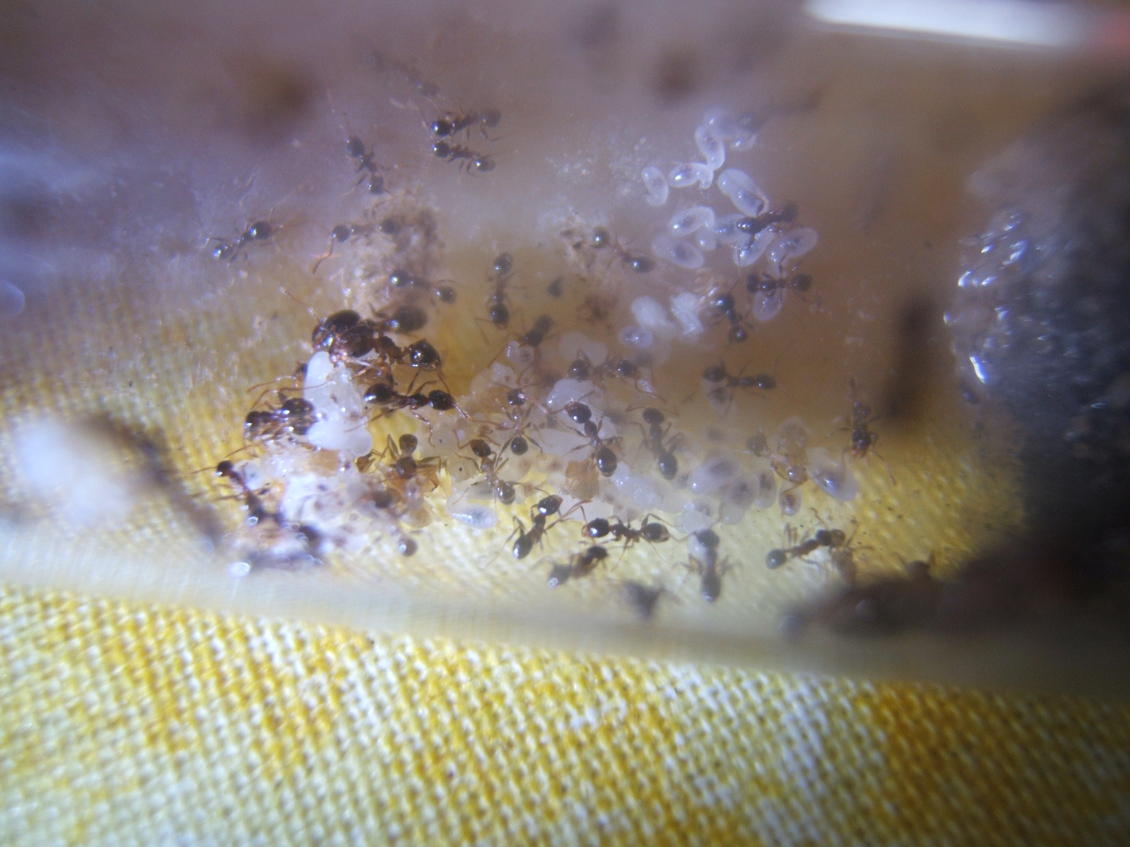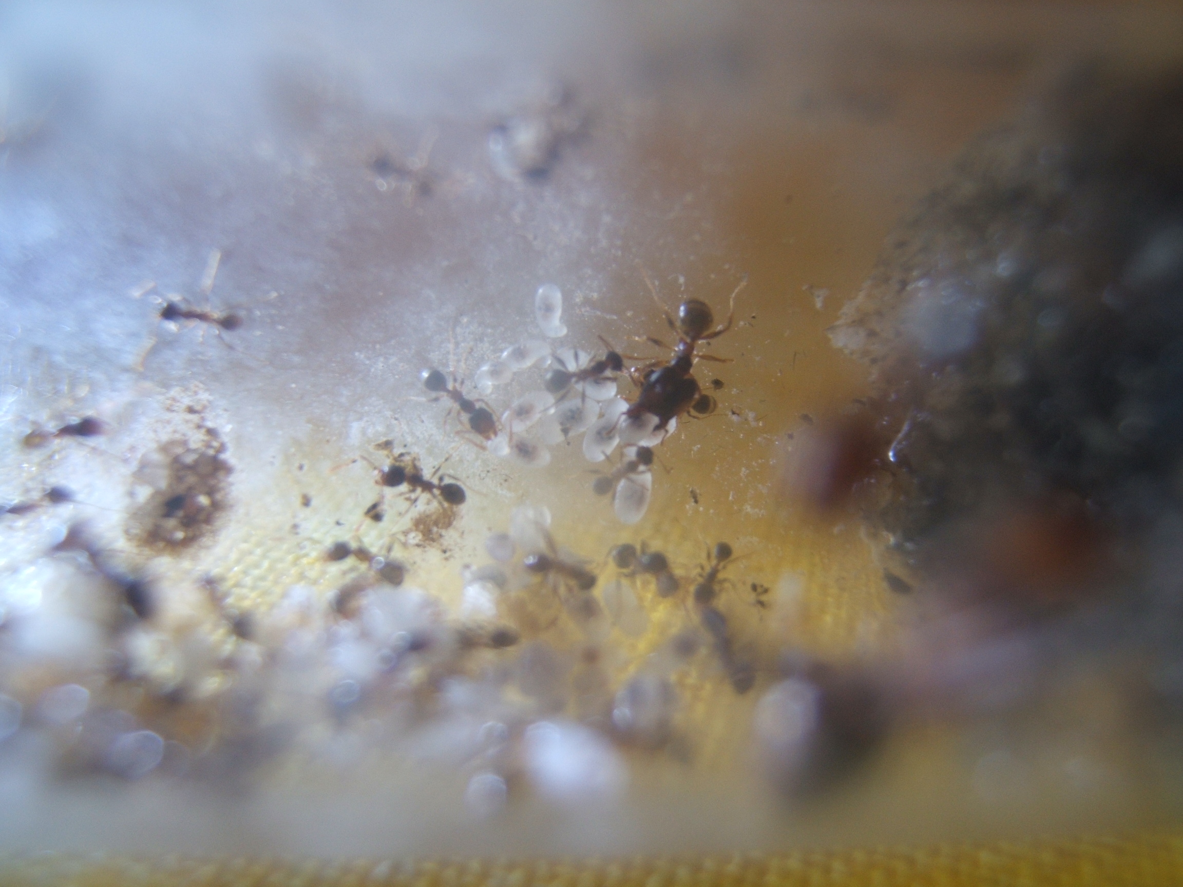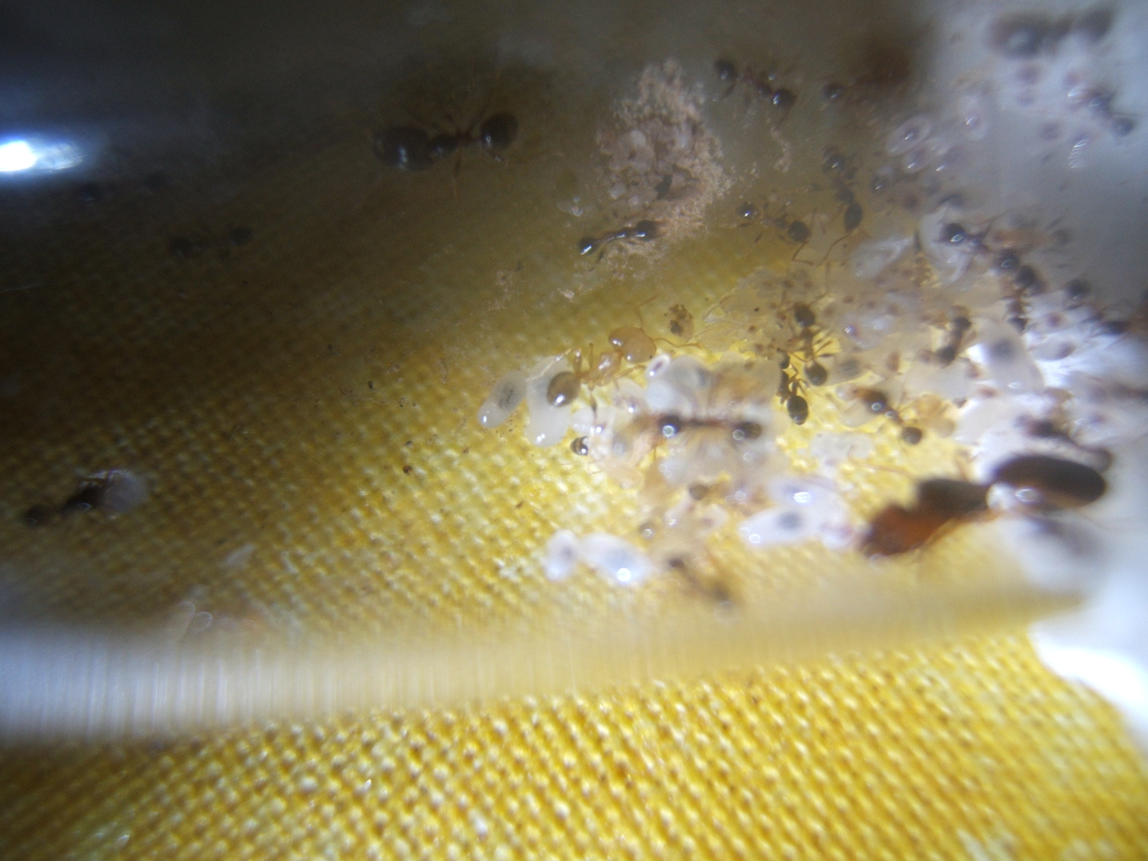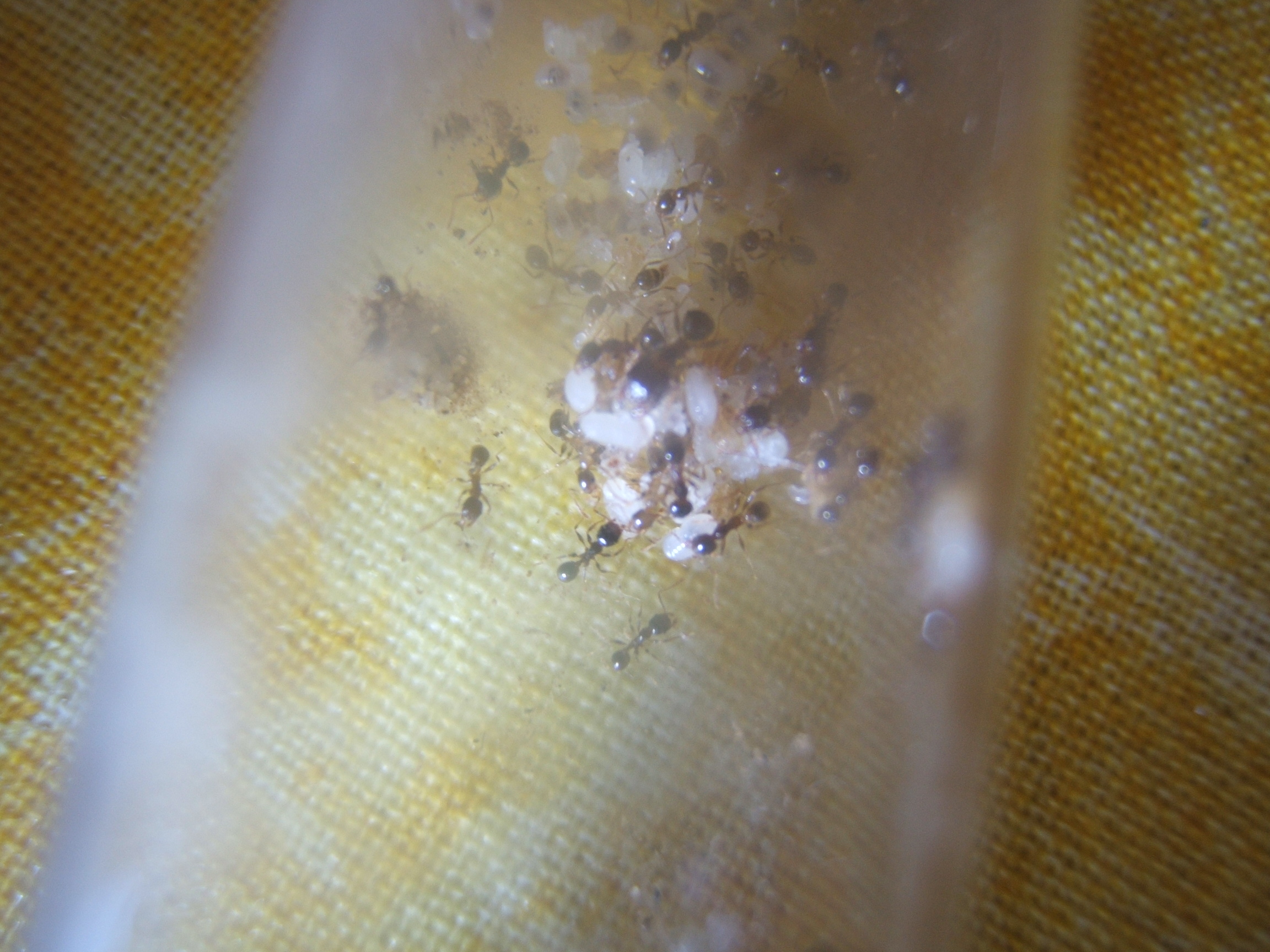 Sie haben eine seltsame Formation angenommen.Vorher war die Kolonie schön am Reagenzglas Boden verteilt.Nun sitzen sie schon fast auf einander und das auch an der Decke!Vorher waren sie auch mal an der decke aber die ist nun schön bepflastert mit Arbeiterinnen.