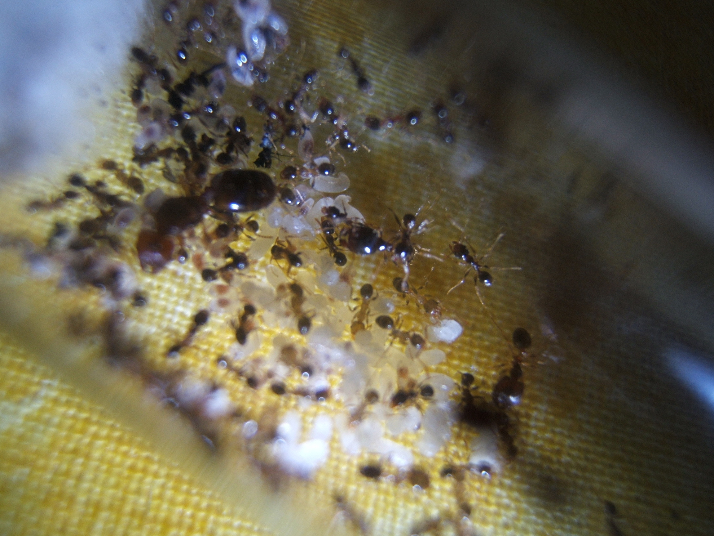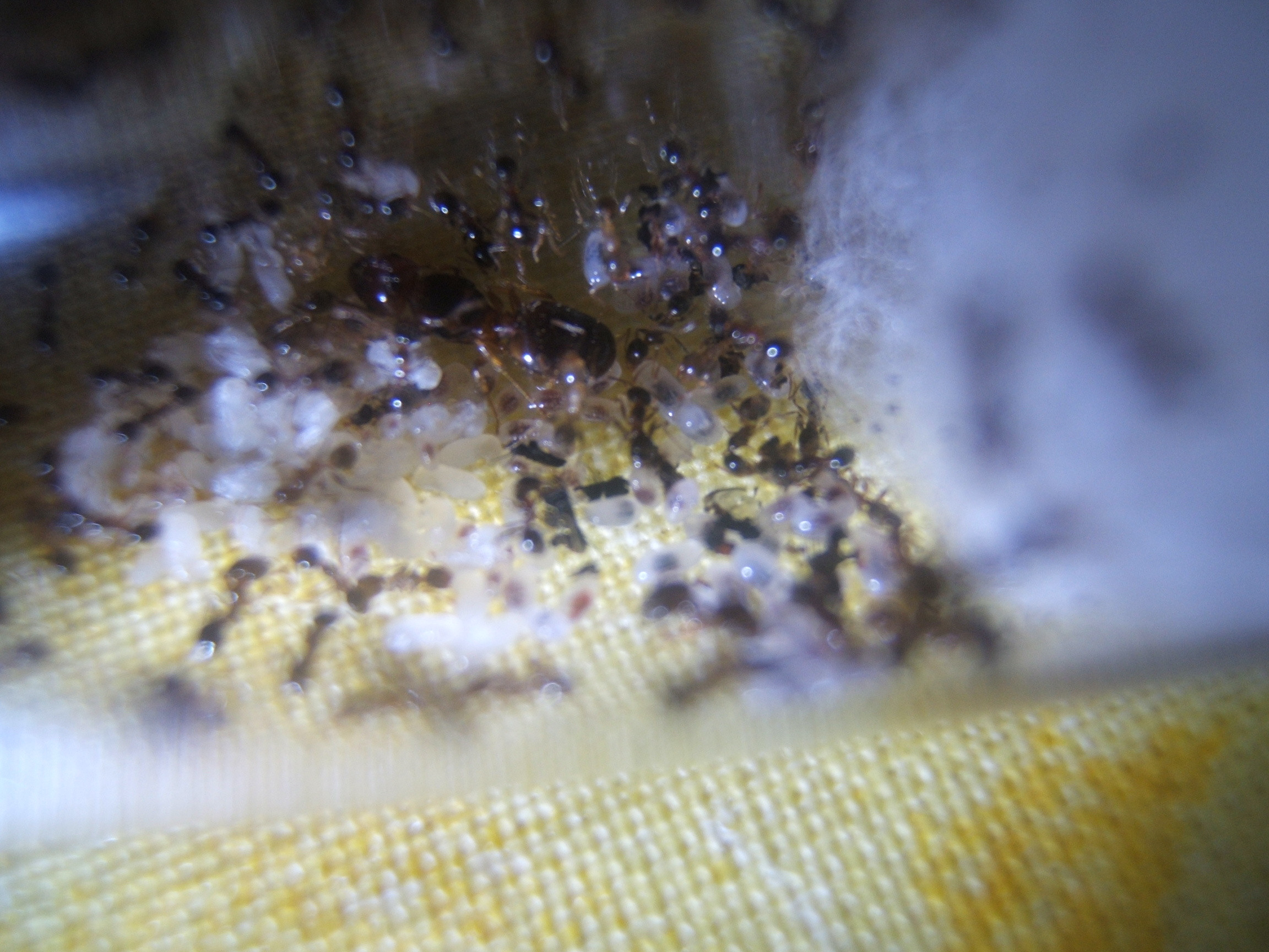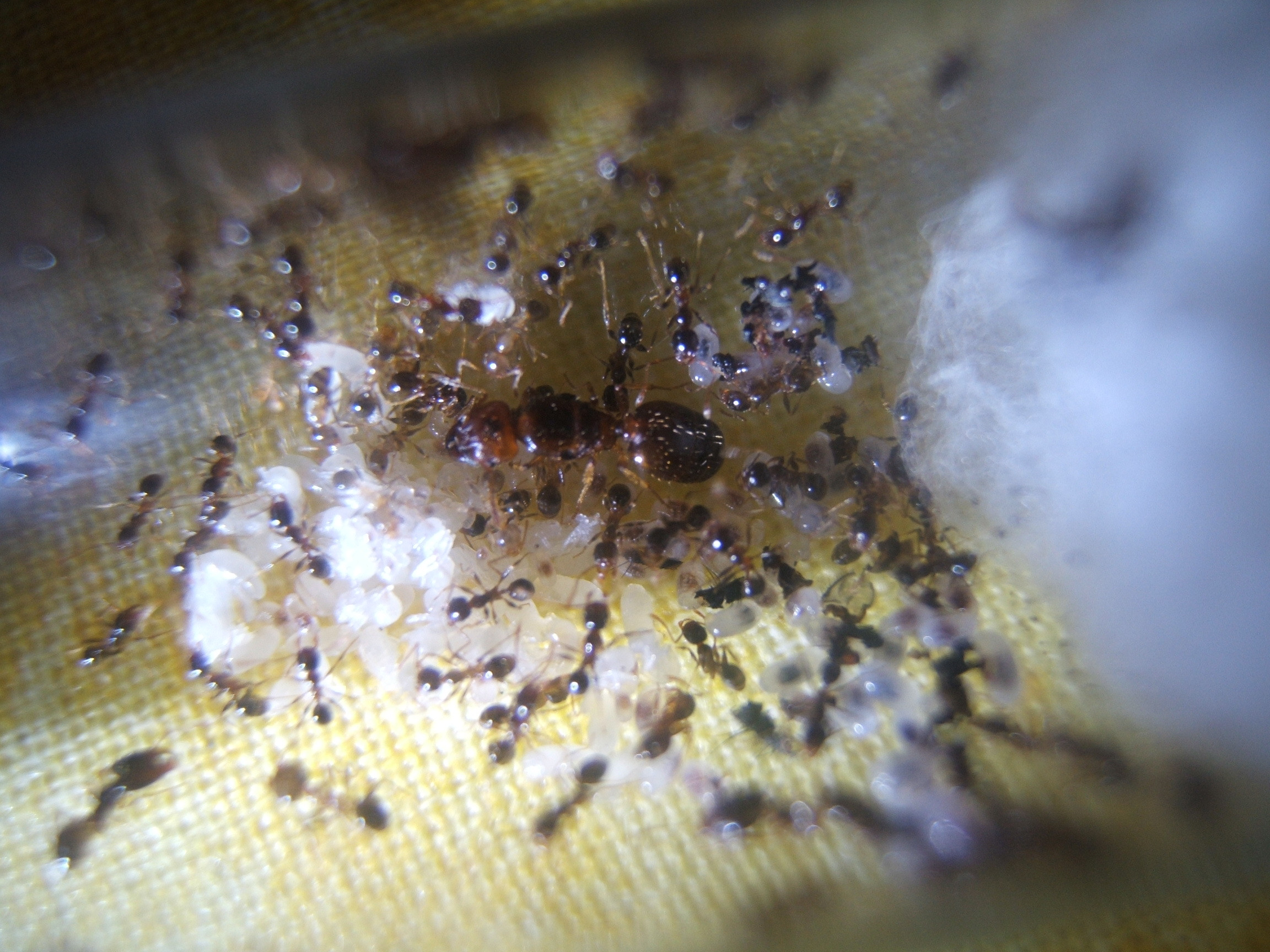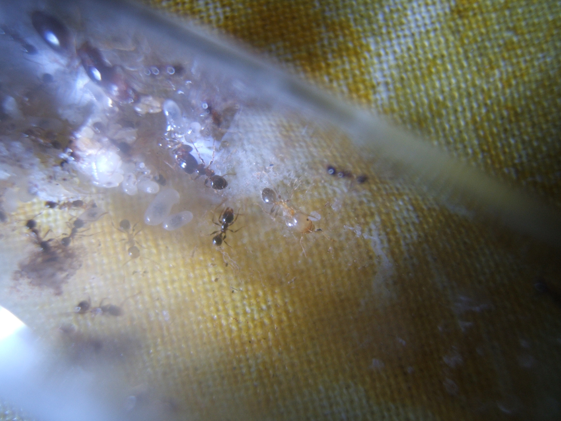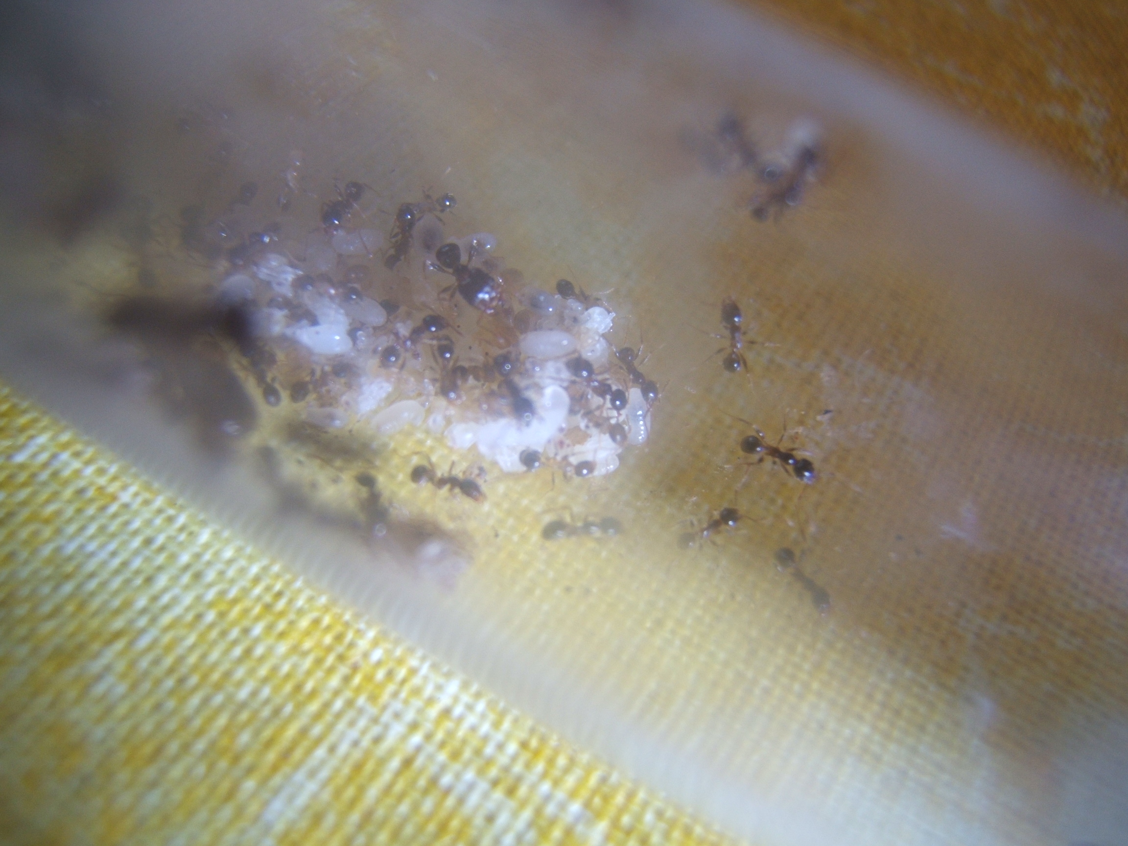 Sie haben eine seltsame Formation angenommen.Vorher war die Kolonie schön am Reagenzglas Boden verteilt.Nun sitzen sie schon fast auf einander und das auch an der Decke!Vorher waren sie auch mal an der decke aber die ist nun schön bepflastert mit Arbeiterinnen.