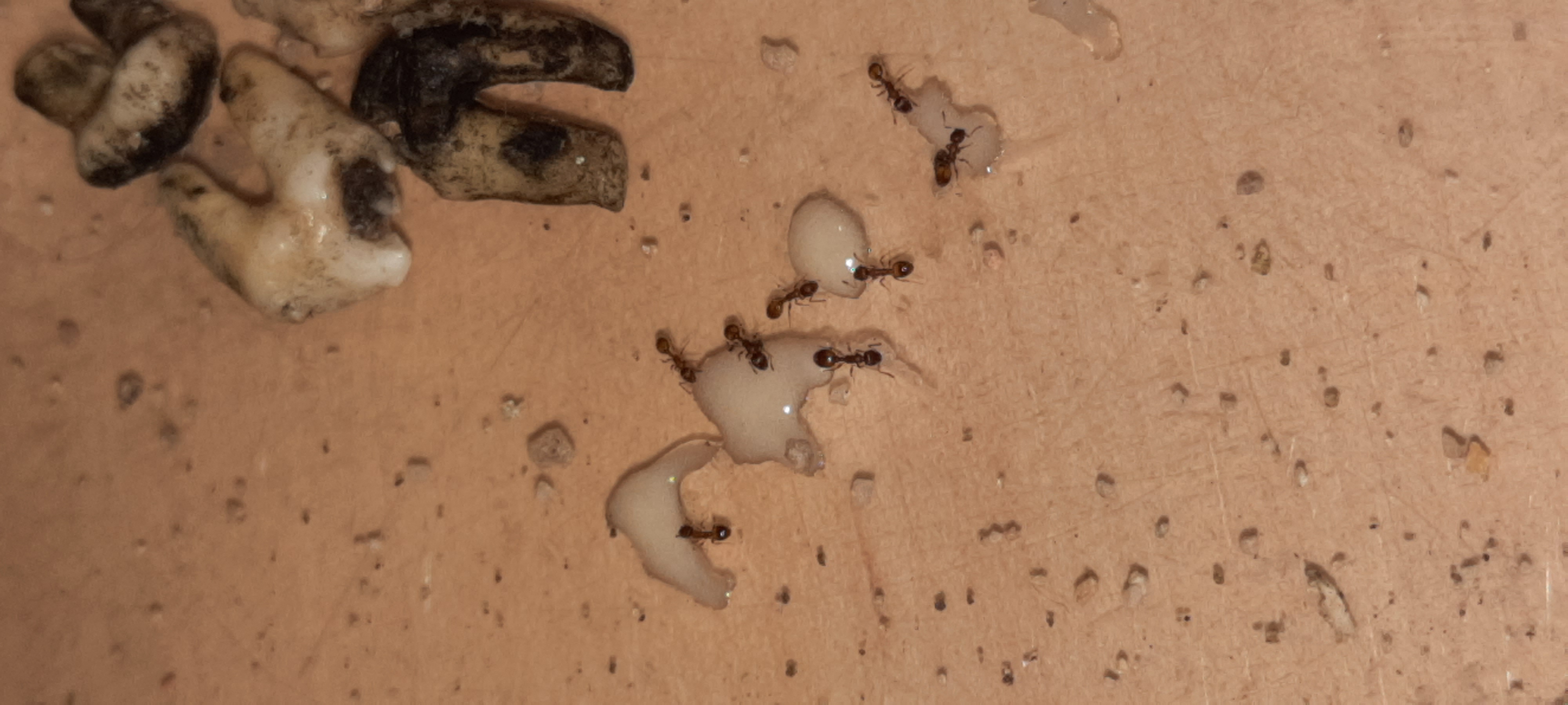 Da ich ja das gesamte Formicarium erhielt, baute ich es als solches wieder zusammen: Kiefer in die Halterung gesteckt und im Becken positioniert, Wassertank zum Rand geschoben und gleich einen passenden Platz gesucht. Dann gab es auch noch gleich Cremehonig-Tröpfchen hinterher, die nach rund 30min sehr gut besucht wurden. Es war wirklich erfreulich, wie schnell diese Ameisen der Situation wieder Herr wurden und mindestens acht Arbeiterinnen zum Honig schickten, mindestens Zwei am scouten waren, eine Müll herumschleppte und rund drei Ameisen den Eingang bewachten. Einfach klasse!
