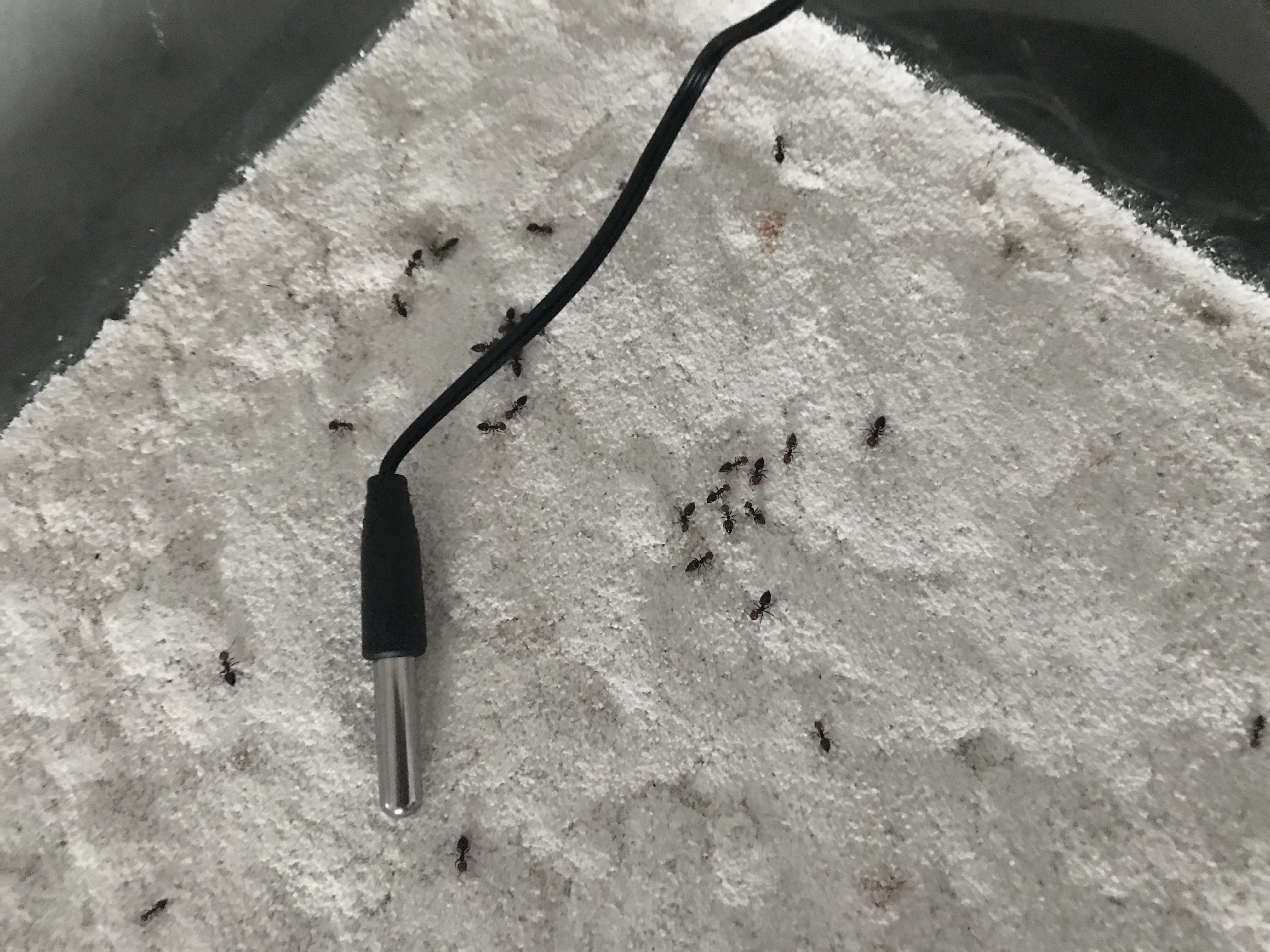 Gekauft habe sie Ende 2018, wenn ich mich recht erinnere waren es da die Königin + 5-10 Arbeiterinnen. Sie waren dann auch direkt in der Winterruhe und ich habe die Zeit genutzt um ihnen eine Arena vorzubereiten. Diese besteht aus einem Glaskasten vom Antstore. Als Bodengrund habe ich eine weiße Sand-Lehm Mischung genutzt, welche ich angefeuchtet und anschließend mehrere Wochen habe durchtrocknen lassen. Entstanden ist dadurch ein super harter weißer Boden, von dem sich die Ameisen super abheben.