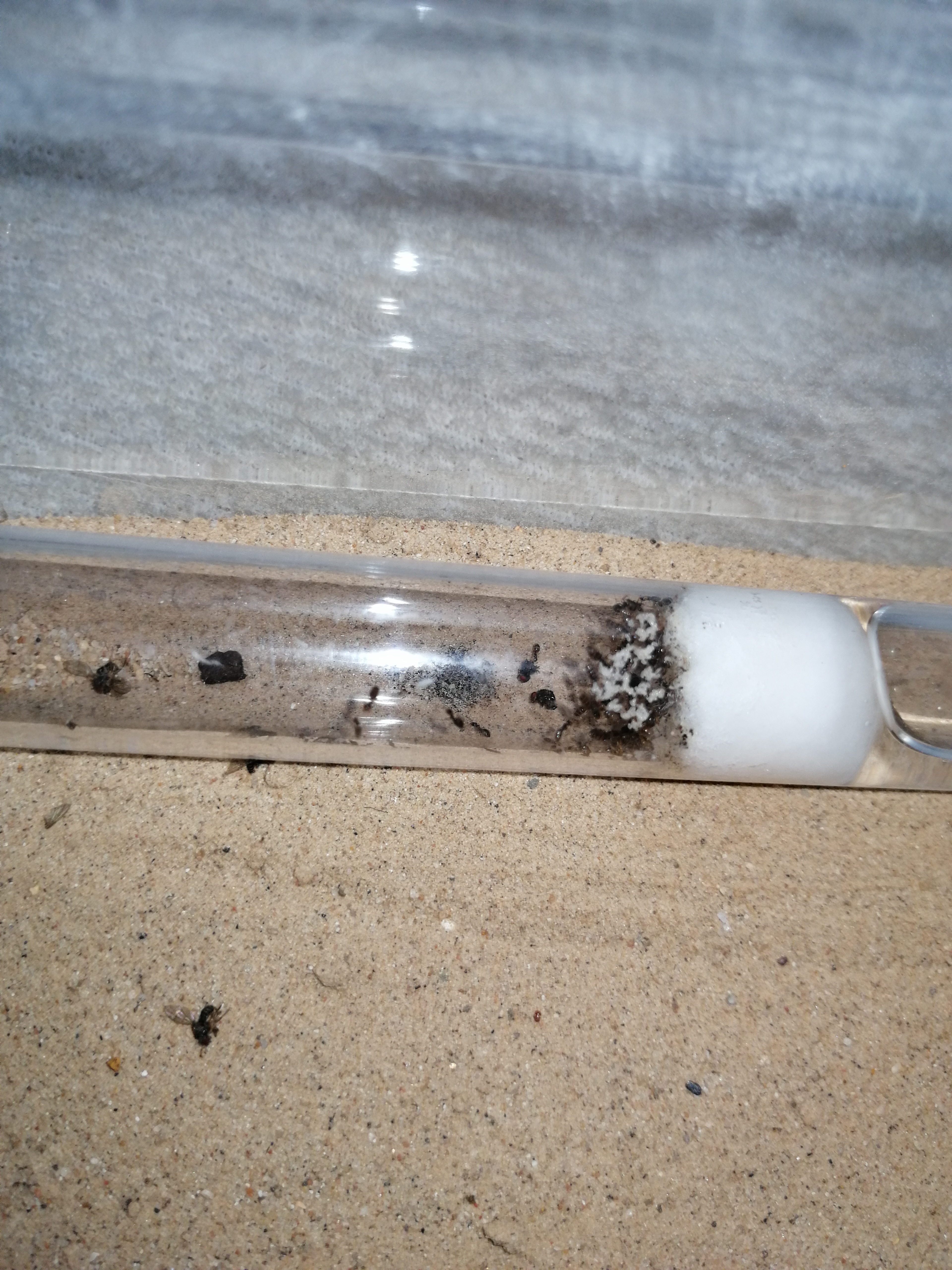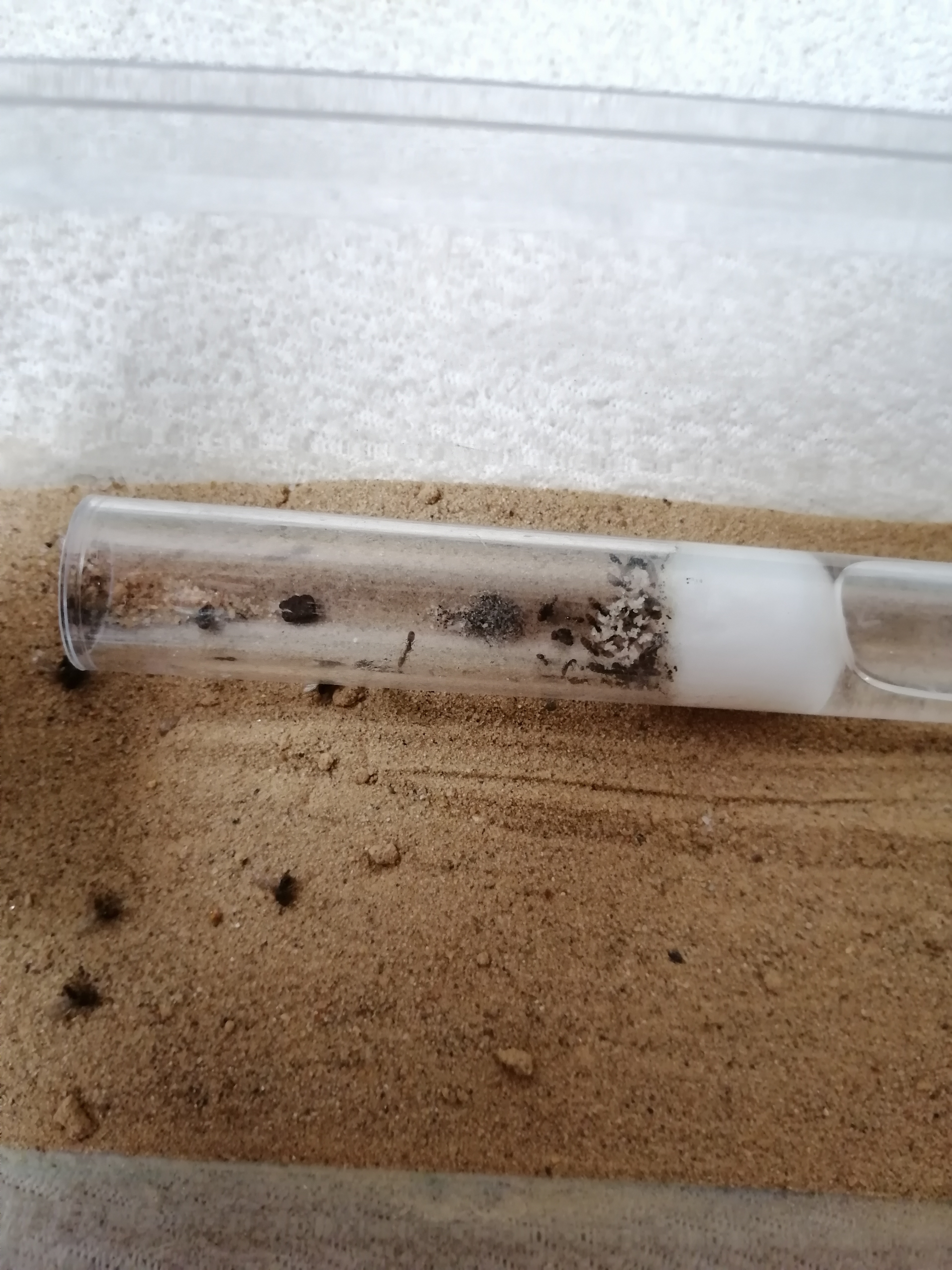Königinnen und 26 Arbeiterinnen und sehr vielen Eiern diese kommen vom recht neuen Shop pro-formica.de. Die kolonie hat als arena eine Rocher box bekommen da die dicht sind und die plagiolepis wirklich klein sind (ich halte zwar kleineres aber die sind nicht so schnell) als Boden ganz dĂŒnn sand-lehm und da habe ich das RG reingelegt und abgedunkelt. Am ersten Tag gab es erstmal Zuckerwasser und einen kleinen Mehlwurm. Donnerstag gab es dann das selbe und auch hier war die AktivitĂ€t nicht sehr hoch aber gestern habe ich Fruchtfliegen bereit gestellt und da haben sie auch einige eingetragen und heute kamen dann die ersten