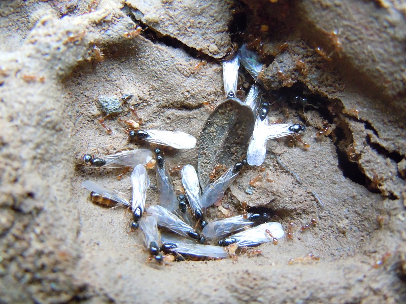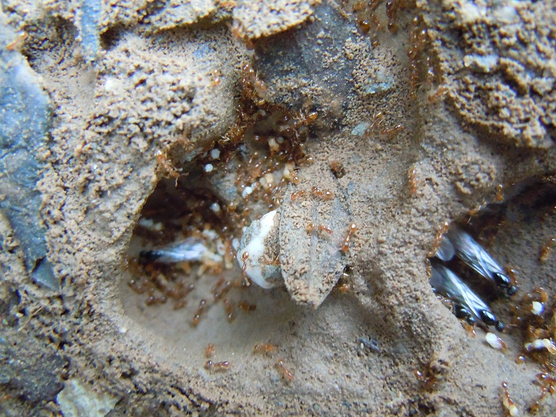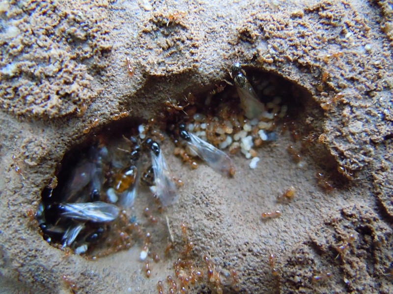 Solenopsis fugax in die Brutkammern der Nester der benachbarten Arten. Die Diebsameisen schmieren ein Sekret aus ihrer Giftdrüse auf die fremde