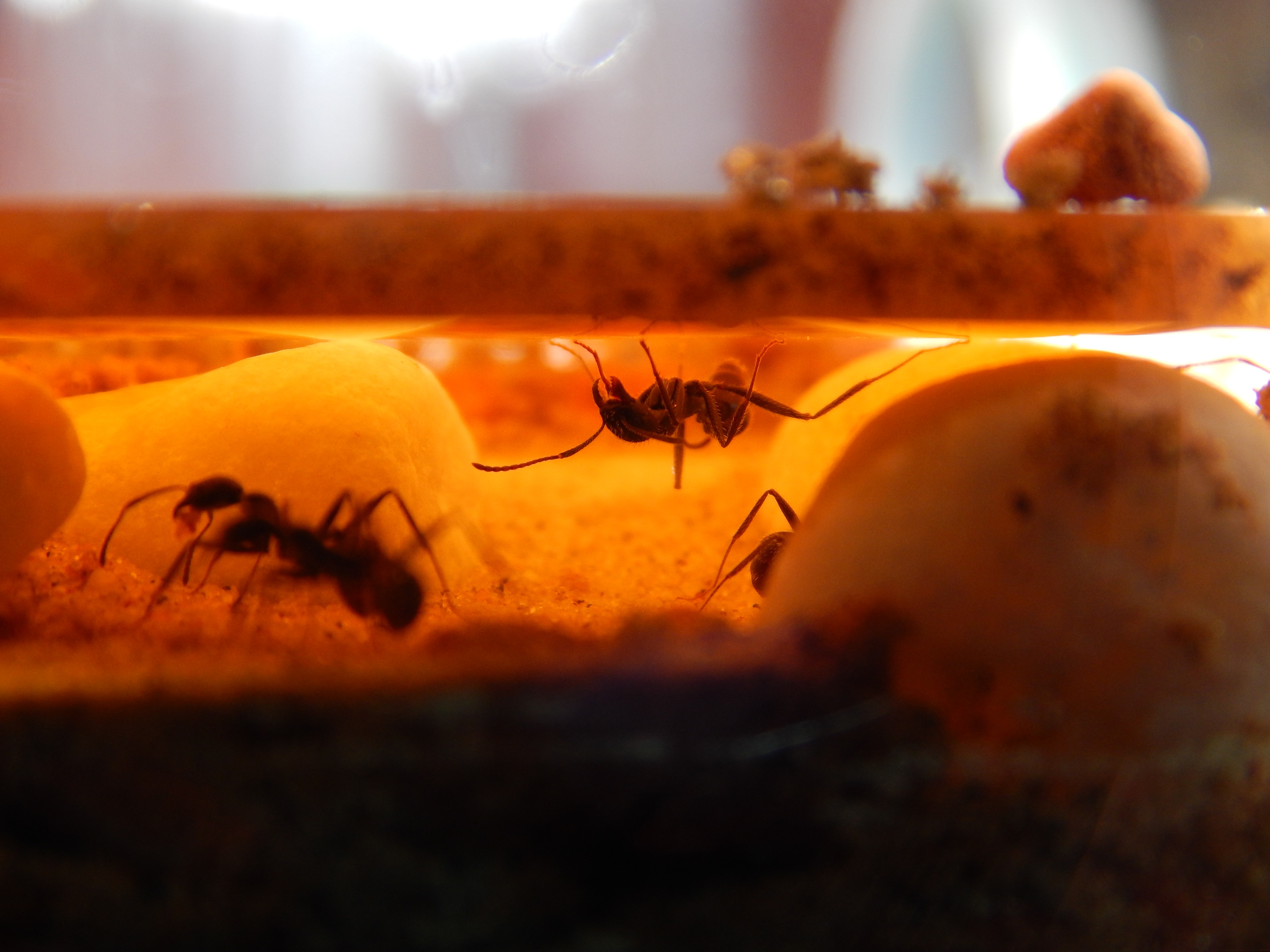 Dann vorsichtig ausgewintert und Anfang April stand die Ameisen in meinem Wohnzimmer an ihrem Platz. Eine aufregende Zeit als geduldiger Ameisenhalter sollte beginnen. Ok dachte ich mir los geht’s und da ich neuerdings eine Lesebrille brauche sah ich erstmal........ nichts.... Brille vergessen.... ah, so geht’s.....los geht’s. Blöd von mir, an alles gedacht nur nicht daran das die Ameisen so klein sind und ich nix sehe.