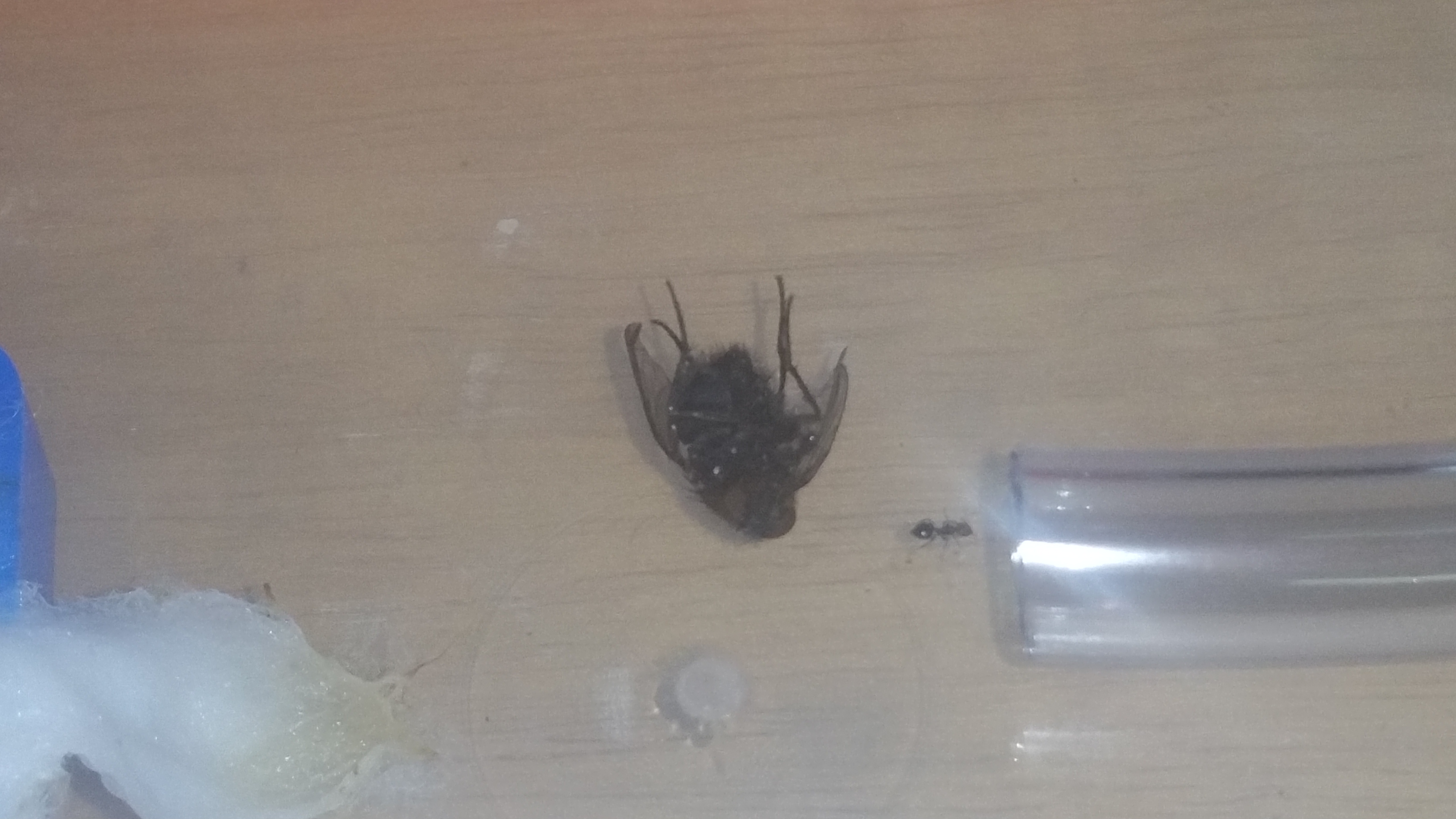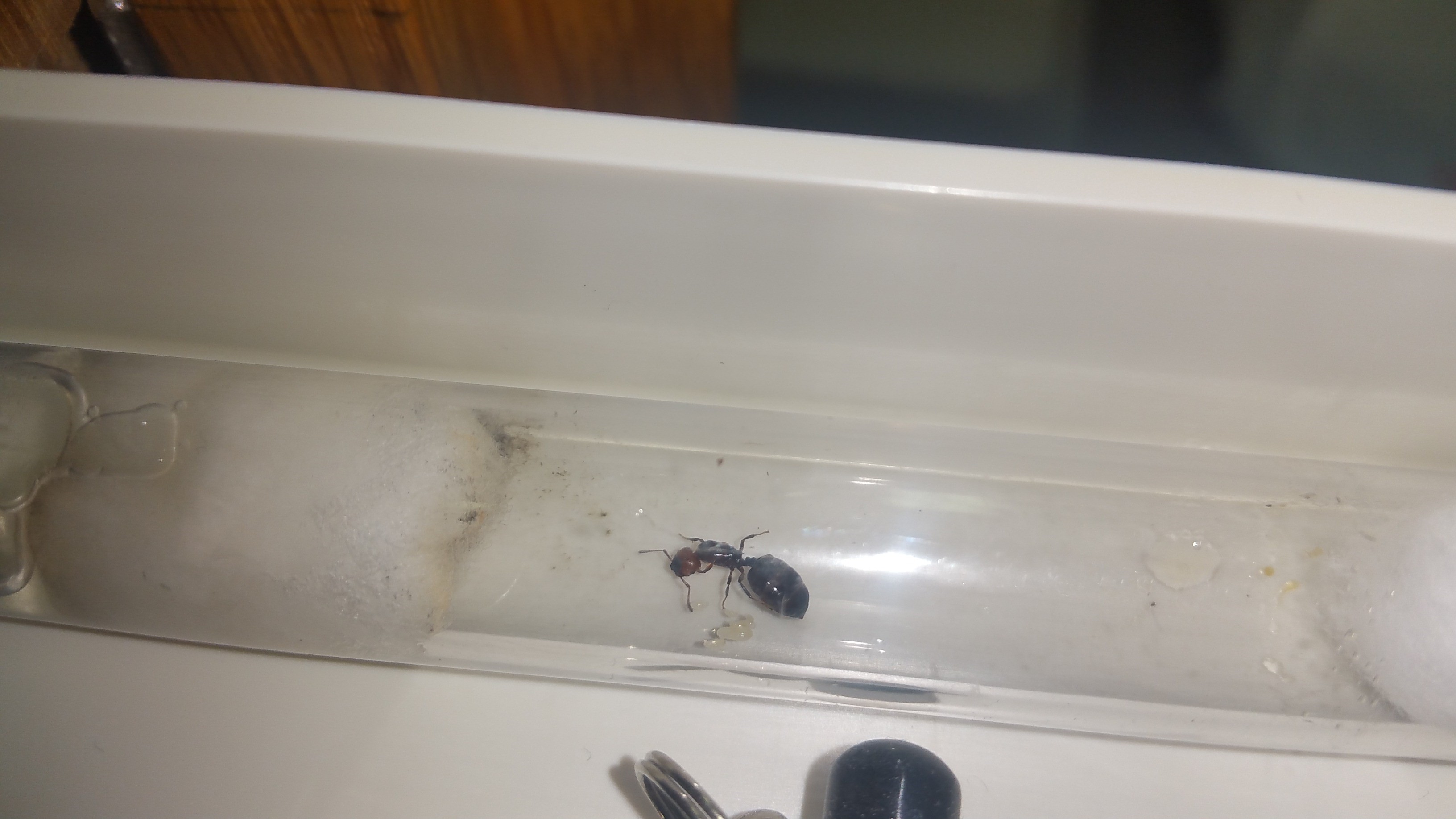 Im September war ich 3 Wochen im Campingurlaub auf Sardinien. An unserem letzten Tag vor der Abreise krabbelte da diese hübsche junge Lady über unser Vorzelt des Campers. Da ich aber schon meinen Vorrat von 4 RG ein paar Tage vorher beim Hochzeitsflug der Messor spec aufgebraucht hatte, musste ein bisschen improvisiert werden. Ich hatte von einem Fiebermesser das Schutzröhrchen (welche auf beiden Seiten Lüftungslöcher hat) verwendet, indem ich es am einen Ende mit Watte auskleidete und in einen Becher mit Wasser stellte. Aber nur so, dass die Watte sich aufsaugen konnte. Es war sicherlich nicht ganz ideal, aber wie sich nun herausstellt, hat die