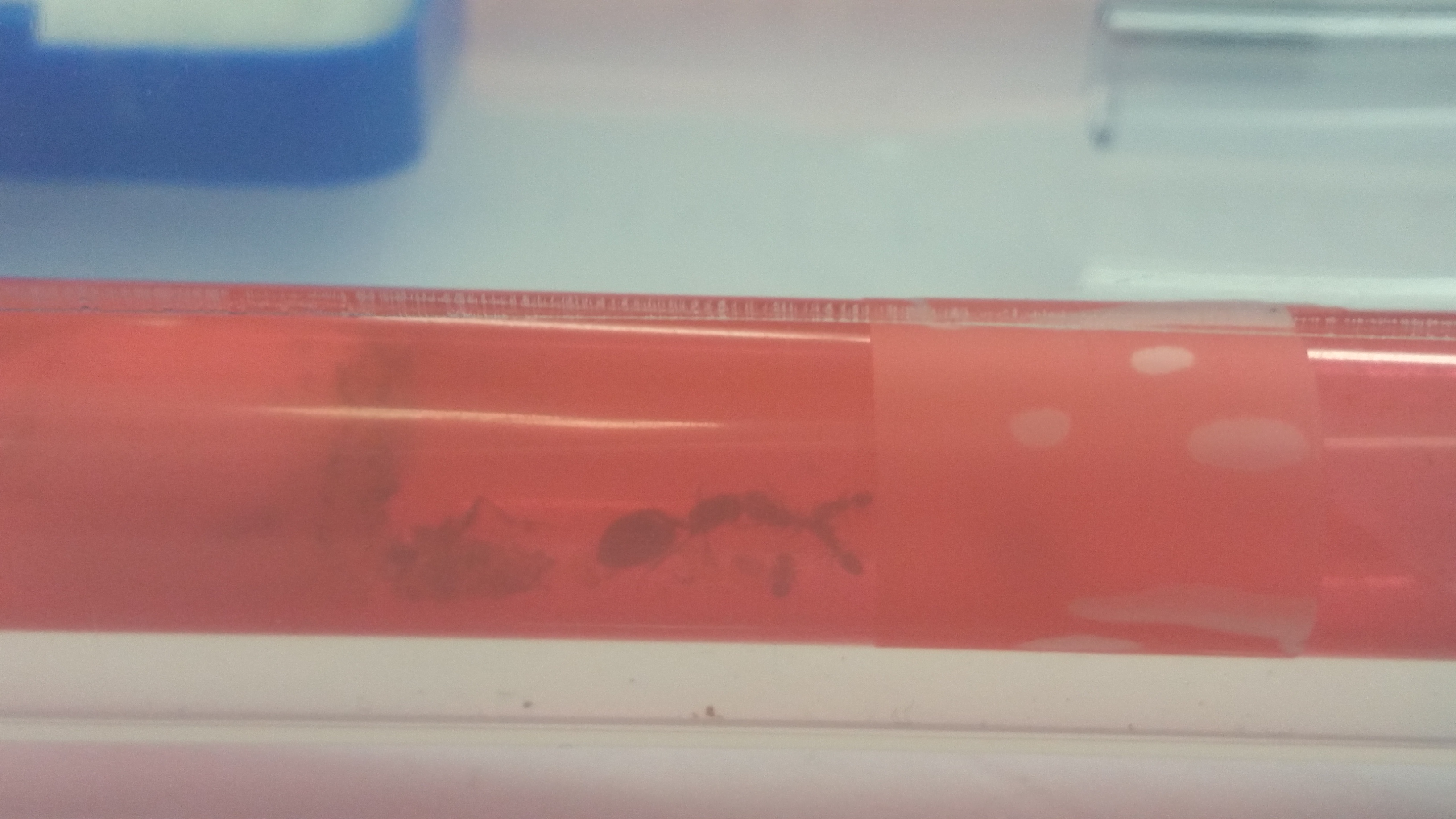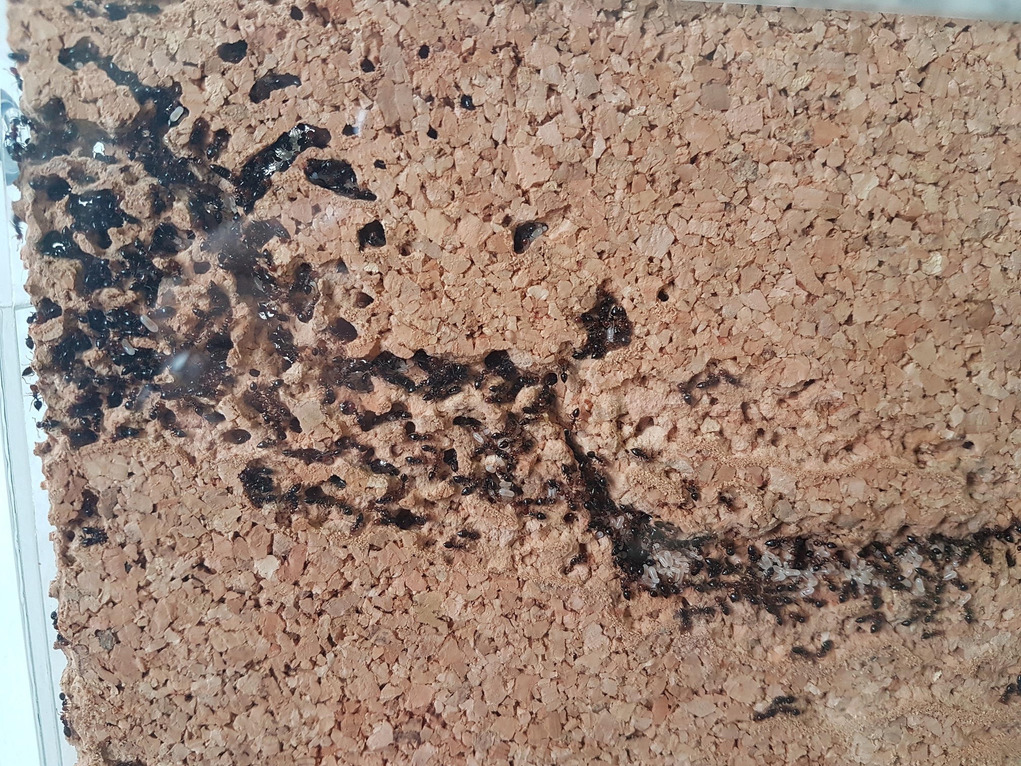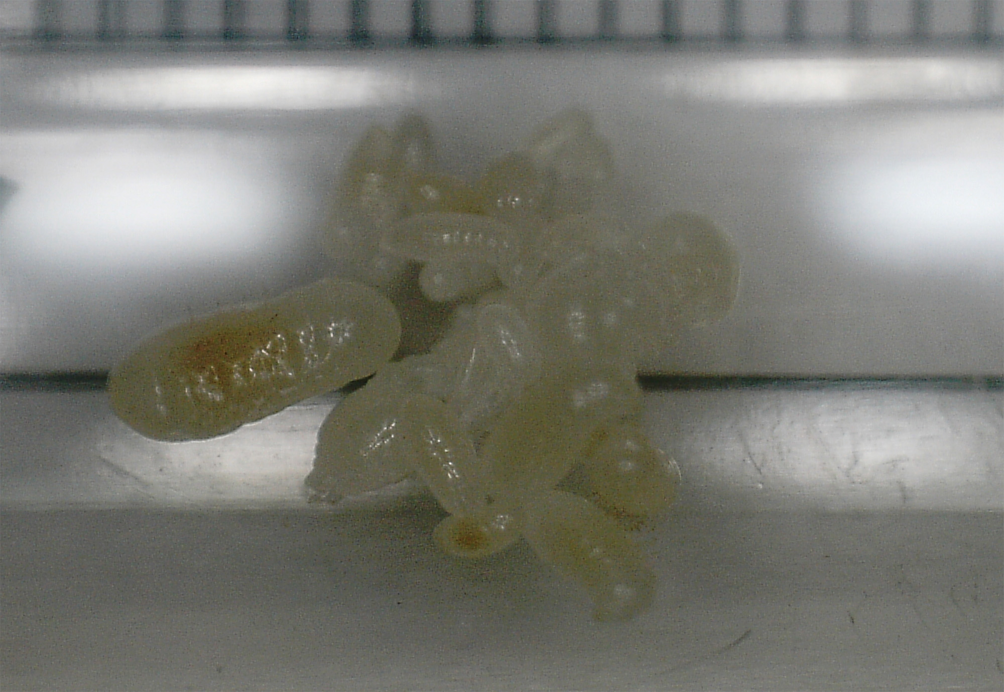 Einen Monat ist es nun her, als ich die ersten Eier entdeckt hatte. Zwischenzeitlich lag das RG in einer dunklen Schublade. Die Temperatur liegt bei 24°C. Ich habe wöchentlich einen kleinen Tropfen Honigwasser angeboten, welches immer sofort gefunden und getrunken wird. Das erste Mal war ich ein wenig perplex... der