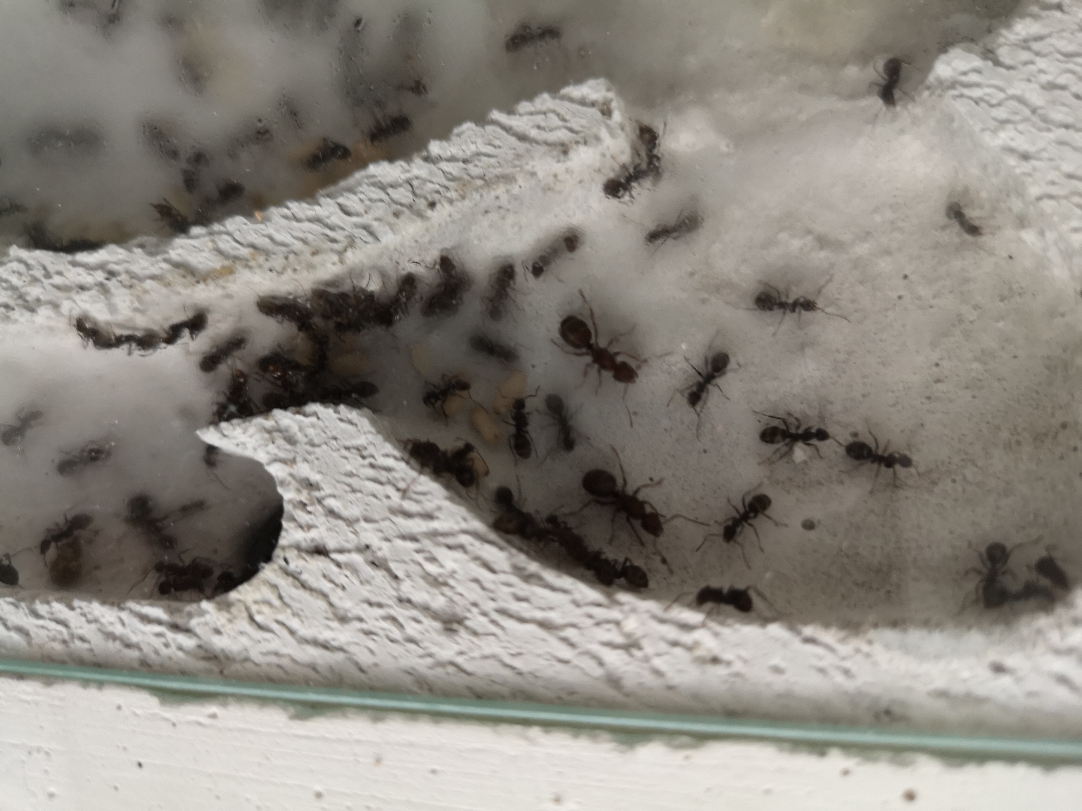Die Königin hat nun massig Eier gelegt und die Anzahl der Puppen ist mehr geworden. Diese Kolonie wird noch stark dieses Jahr wachsen. Iberoformica subrufa ist in der Lage sub-adulte Schaben ohne Probleme in ihr Nest zu ziehen und kommt super gut auch mit dem Chitinpanzer zurecht. Sie gehen auch sehr organisiert bei größeren Futtertieren vor.
