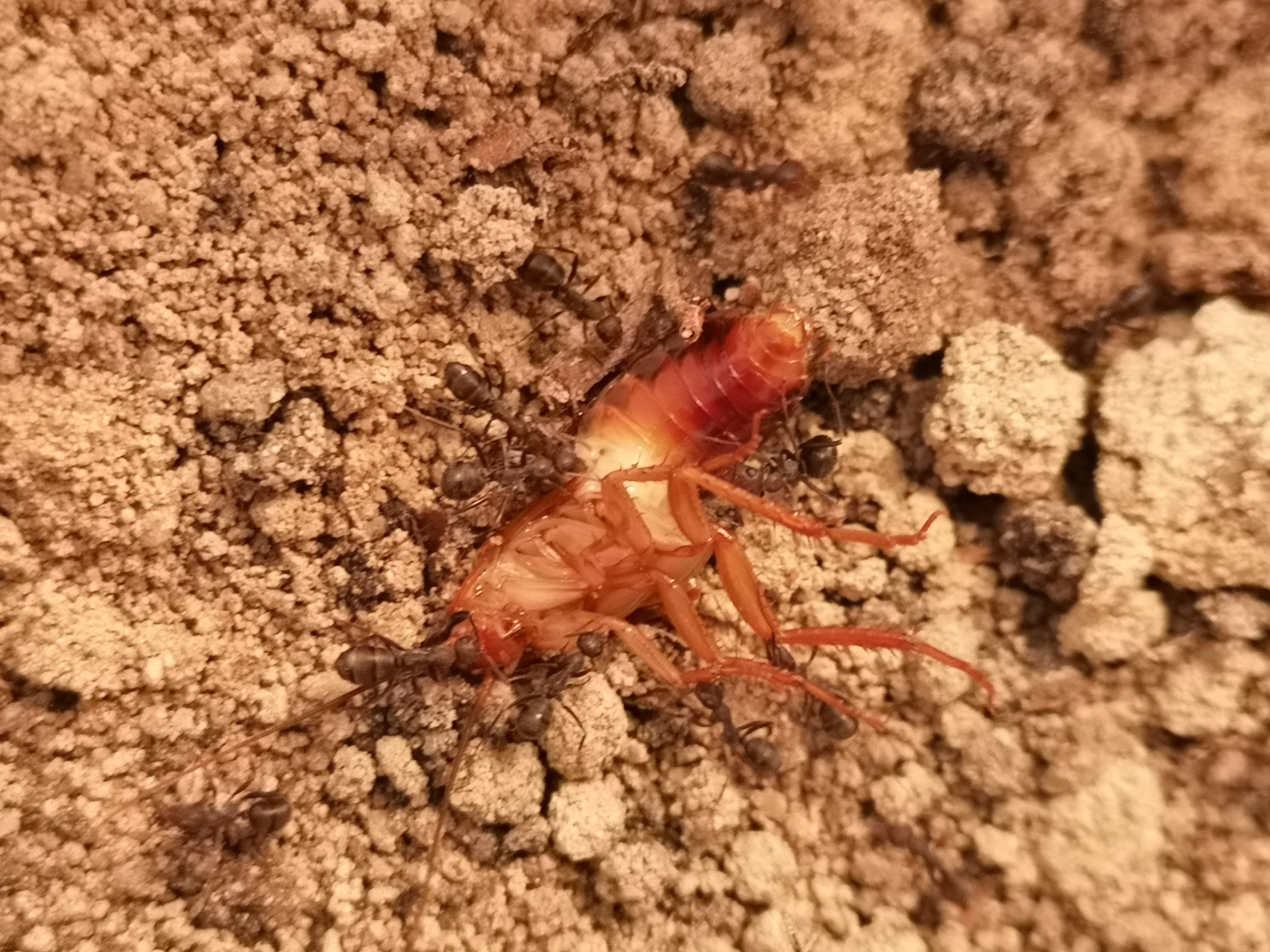 Heute habe ich eine sub-adulte Schokoschabe lebend gefüttert und war echt überrascht wie aggressiv Iberoformica subrufa ist. Sie sind bessere Jäger als ich dachte und sehr koordiniert. Eine echt coole Art.