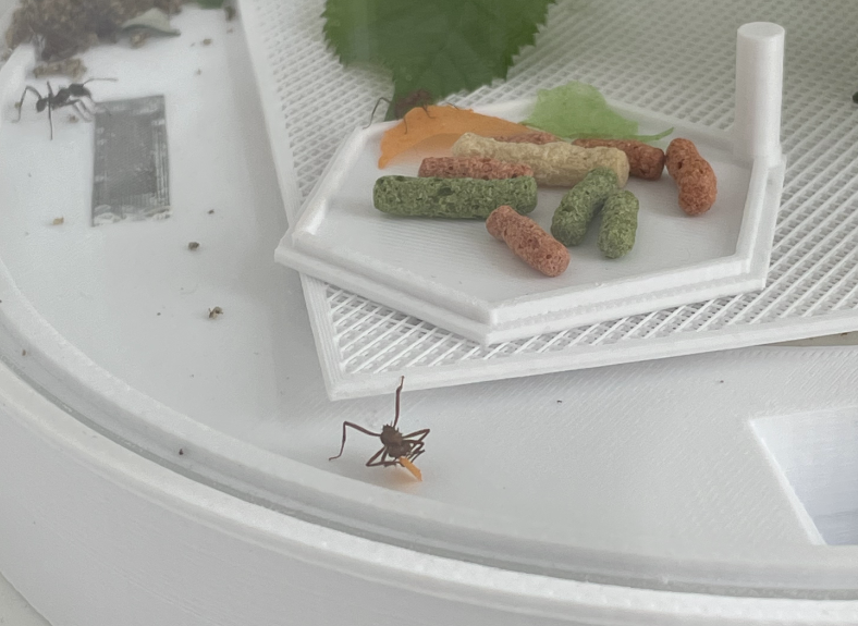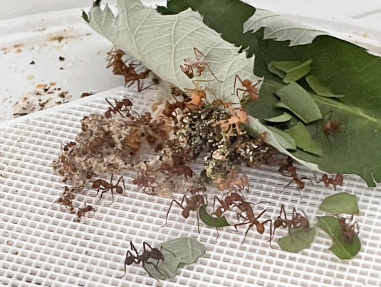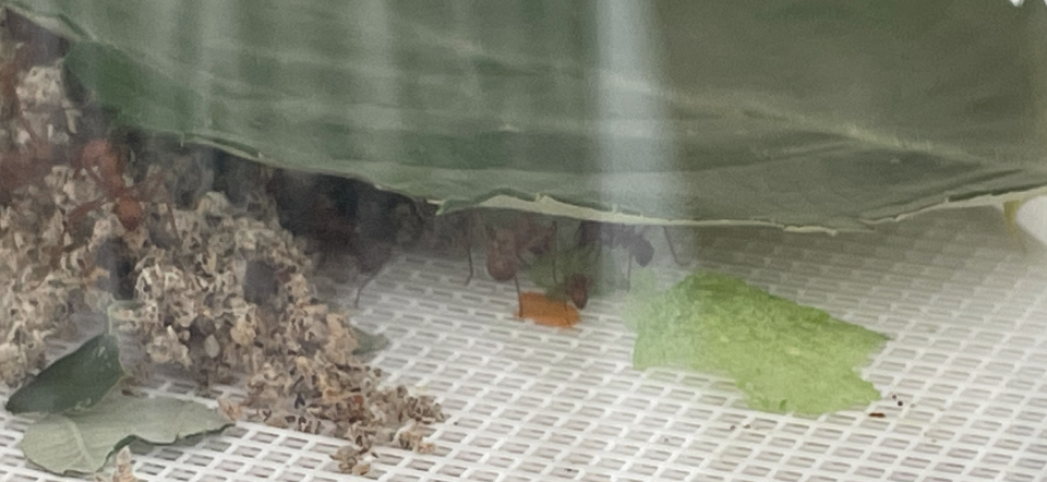 Aktuell hoffe ich tatsächlich das es die Kolonie schafft da wir inzwischen bei 8 Toten sind aber Sie haben Ihren Pilz nun zusammen gelegt und haben nur noch einen welchen Sie unter dem Blatt bauen. Habe heute auch mal das Müllbecken abgesaugt und im Futterbecken auch den Müll entsorgt. Irgendwie haben Sie die Toten im Futterbecken gelagert.