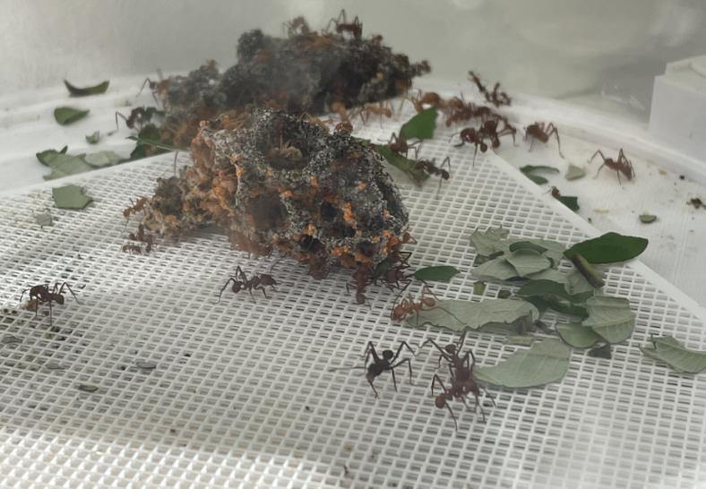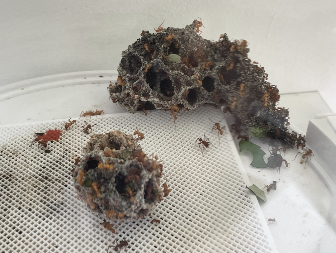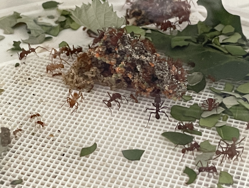 Aktuell geht es den MÀdels sehr gut. Sie haben nun angefangen auch das "alte" Brombeerblatt welches vom HÀndler mit kam und im Nest als Dach genutzt wurde zu zerschneiden. Jetzt kann man gut dieKönigin sehen und einen zweiten Pilz den Sie bauen.