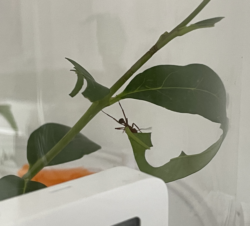 der Kolonie geht es soweit gut. Ich wĂŒrde Sie inzwischen als stabil bezeichnen d.h. der Pilz wĂ€chst und es gibt keine weiteren TodesfĂ€lle. Welche BlĂ€tter sie bevorzugen scheint sich auch zu Ă€ndern d.h. Liguster und Brombeer ist grundlegend der Hit aber gestern war Brombeer der absolute Knaller. Habe ein frisches Blatt rein und zack war es ratz fatz weg geschnippelt: Ich habe auch beobachtet wie sie ein StĂŒck von dem Ligusterstil geschnitten und zum Pilz transportiert haben.