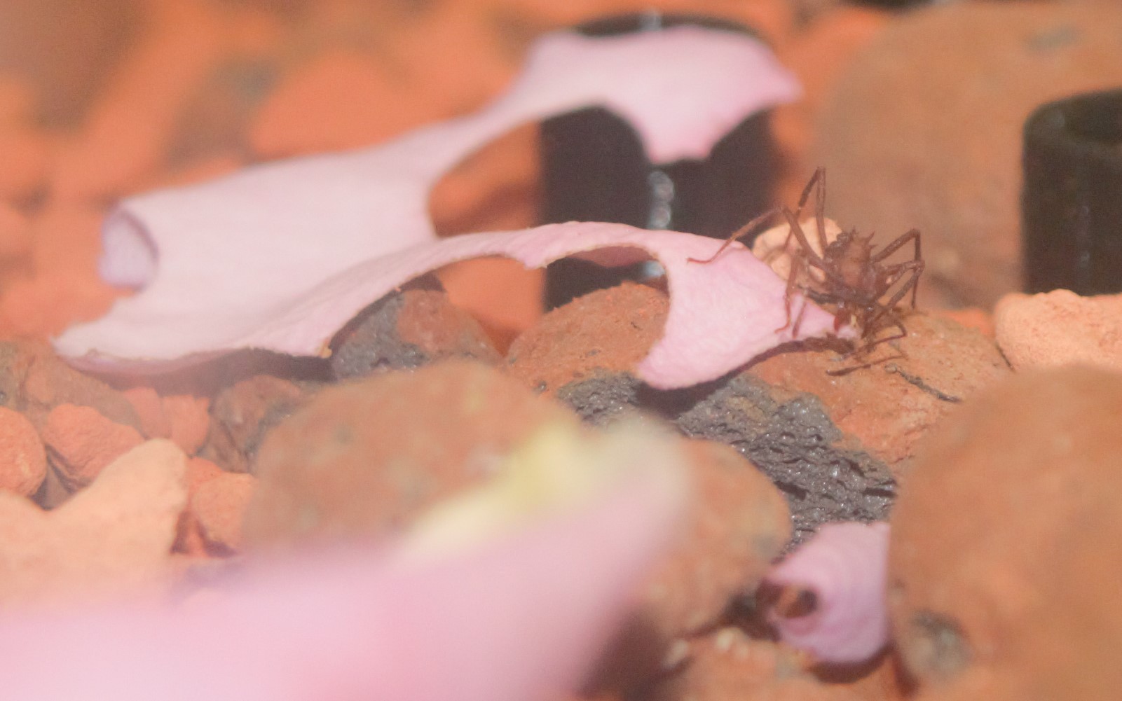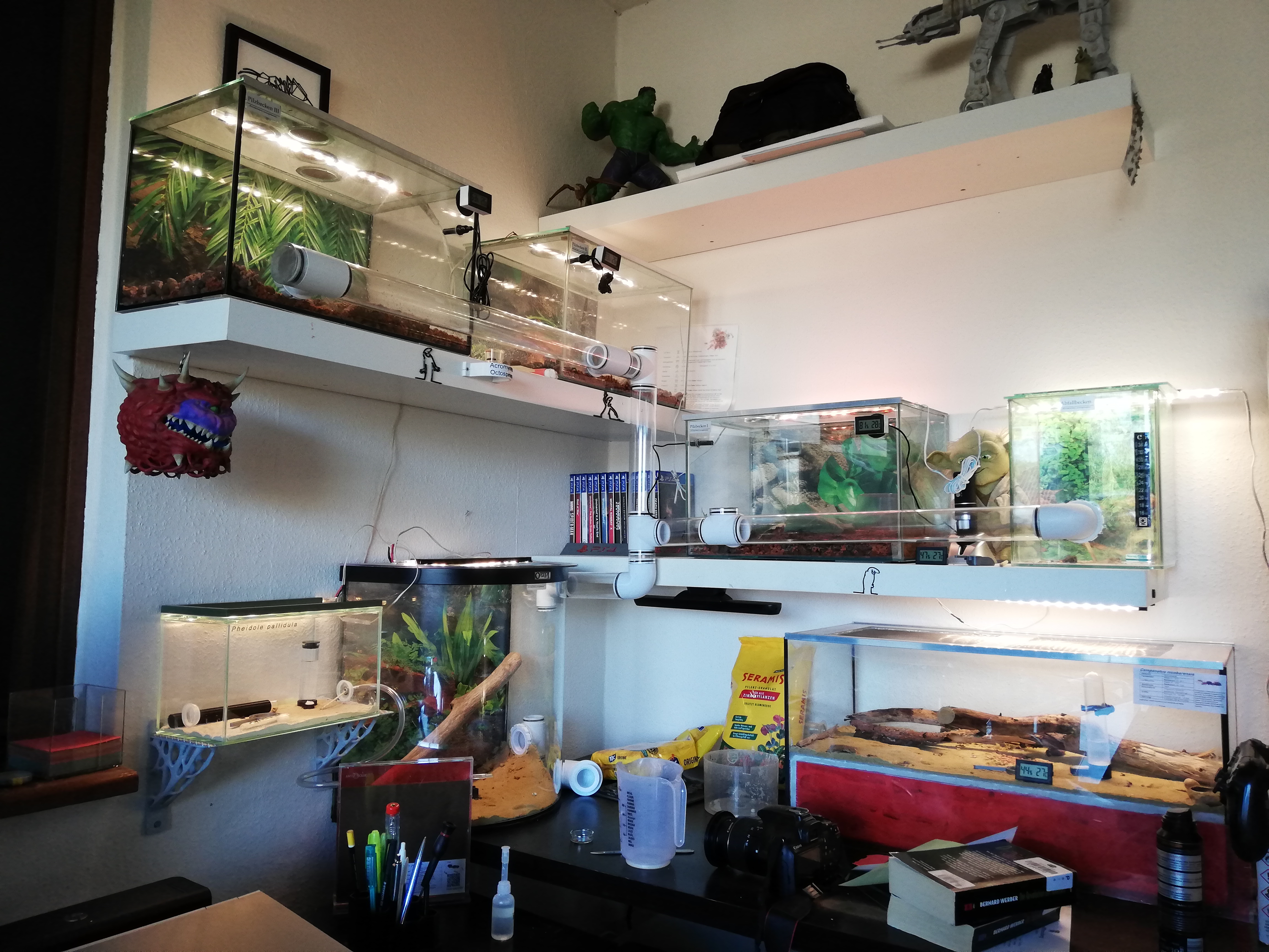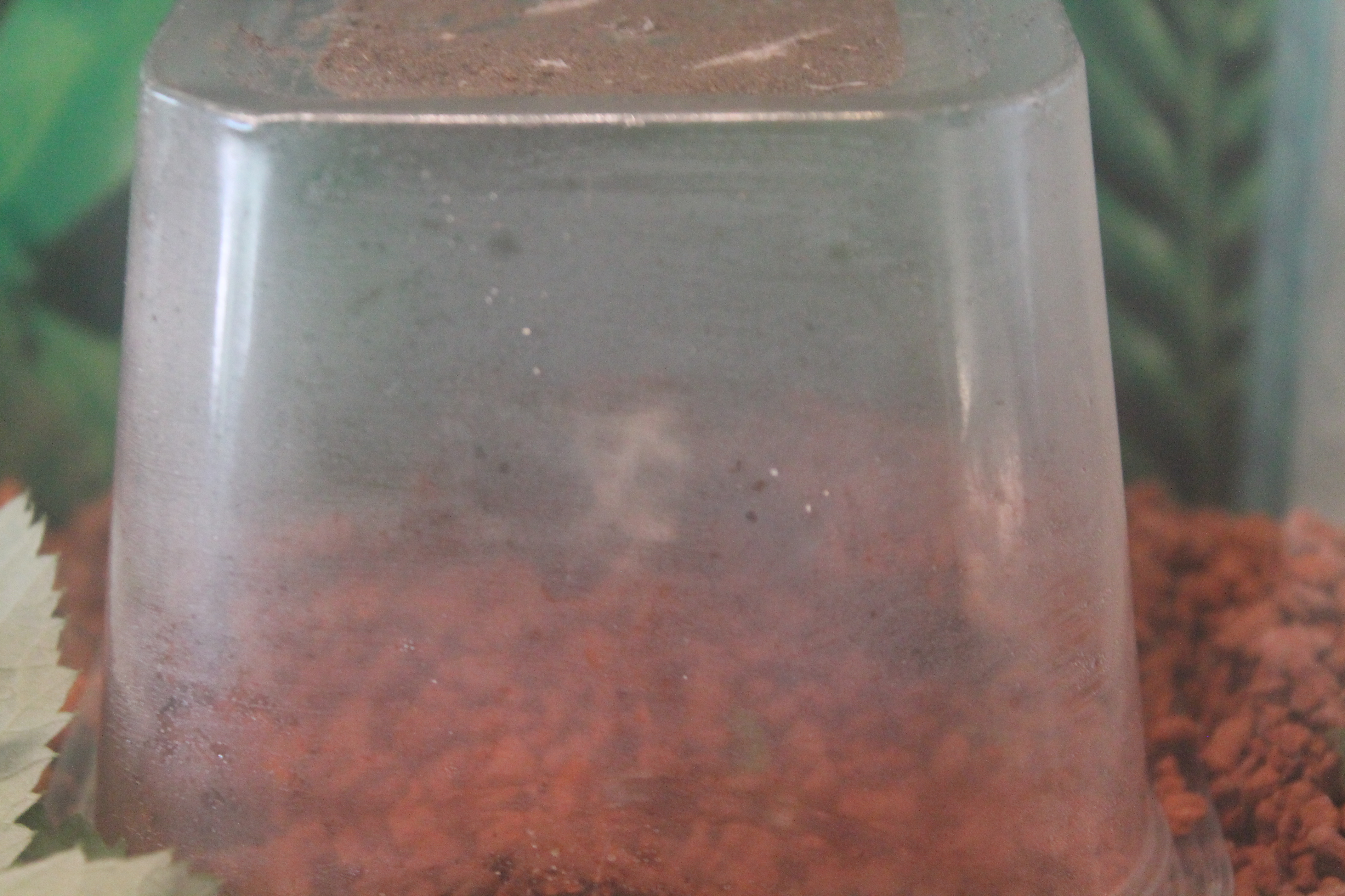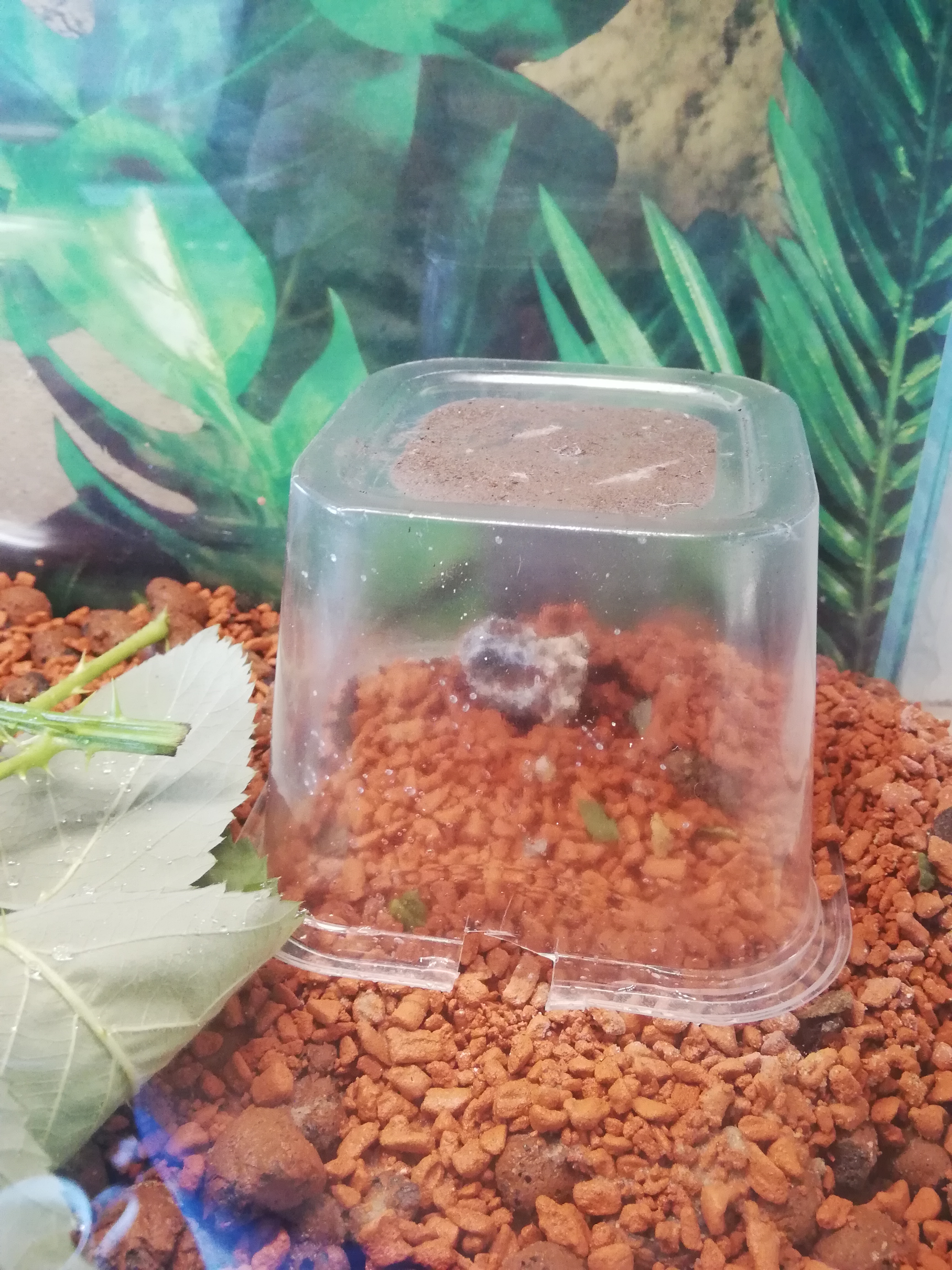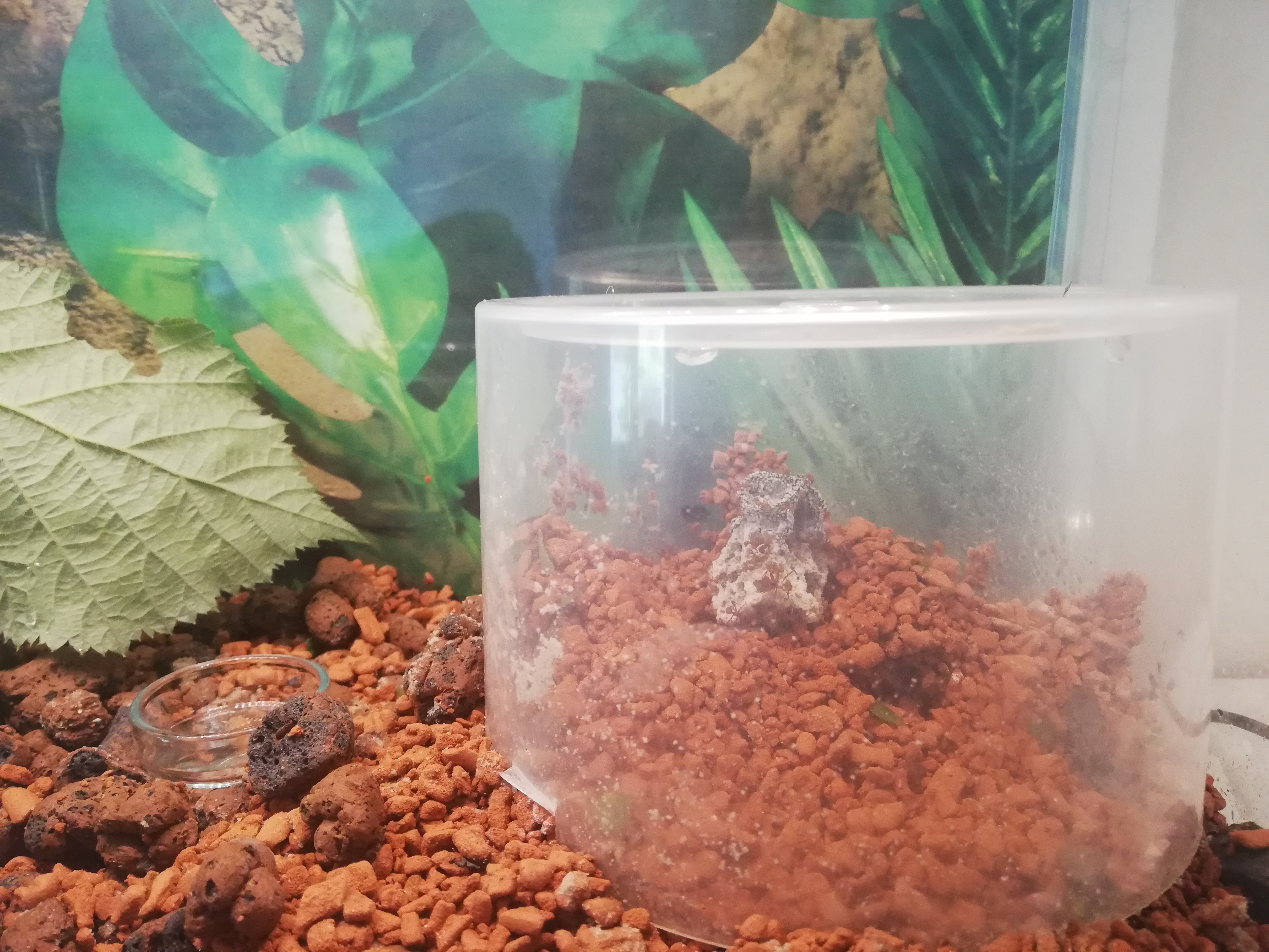 Der Pilz ist wieder umgefallen. Ok... Das ist nichts neues. Neu war mir aber, dass er gerade mal ~ 2cm x 2cm groĂź ist (nur noch). Lange Zeit dachte ich sie bauen die Seramis Steine mit dem Pilz hoch, sodass er wie eine Art schiefer Turm von Pilz da steht. Aber darunter war nichts mehr. Dabei haben sie in letzter Zeit meiner Meinung nach echt viel rein geschleppt und angebracht am Pilz. Habe jetzt die Glocke mal durch eine etwas kleinere ersetzt. Vielleicht war der Pilz zu klein fĂĽr die groĂźe Kuppel. Zur Erinnerung es war die Abdeckung einer 50er DVD Spindel.