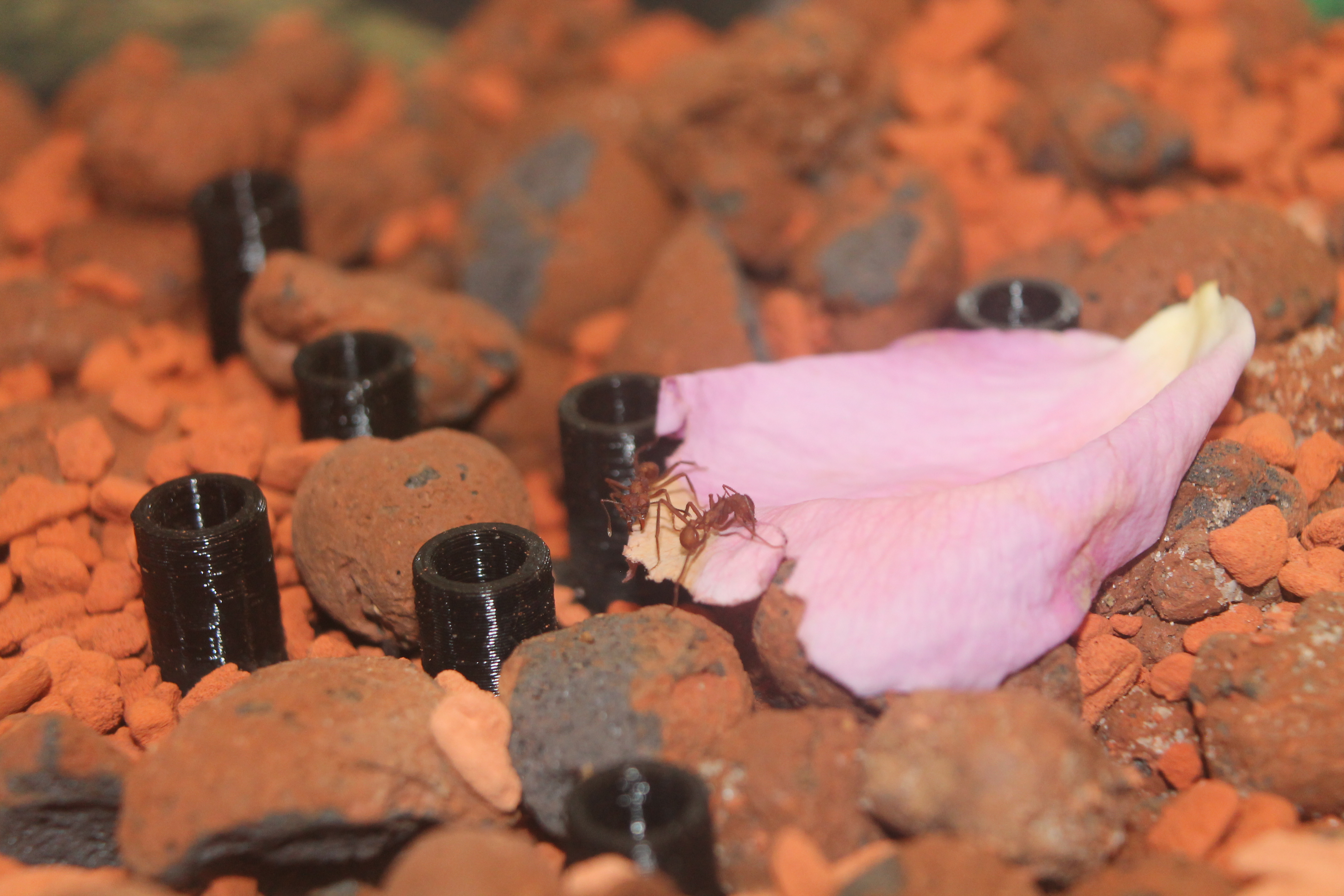 Die Herzen der Damen erreicht man am besten über Rosen! nicht Brombeer... Seitdem sie das erste Blütenblatt komplett weg geknuspert haben, das zweite was 2 cm weiter weg lag schon fast am Röhreneingang oder Nestausgang wie man will, eher ignorierten, legte ich das zweite an die Position des ersten und es wurde auch genommen. Habe dann nochmal 3 geholt und auch da gehen sie gut dran. So viele Blattstücke direkt am Pilz hatten wir auch noch nicht!