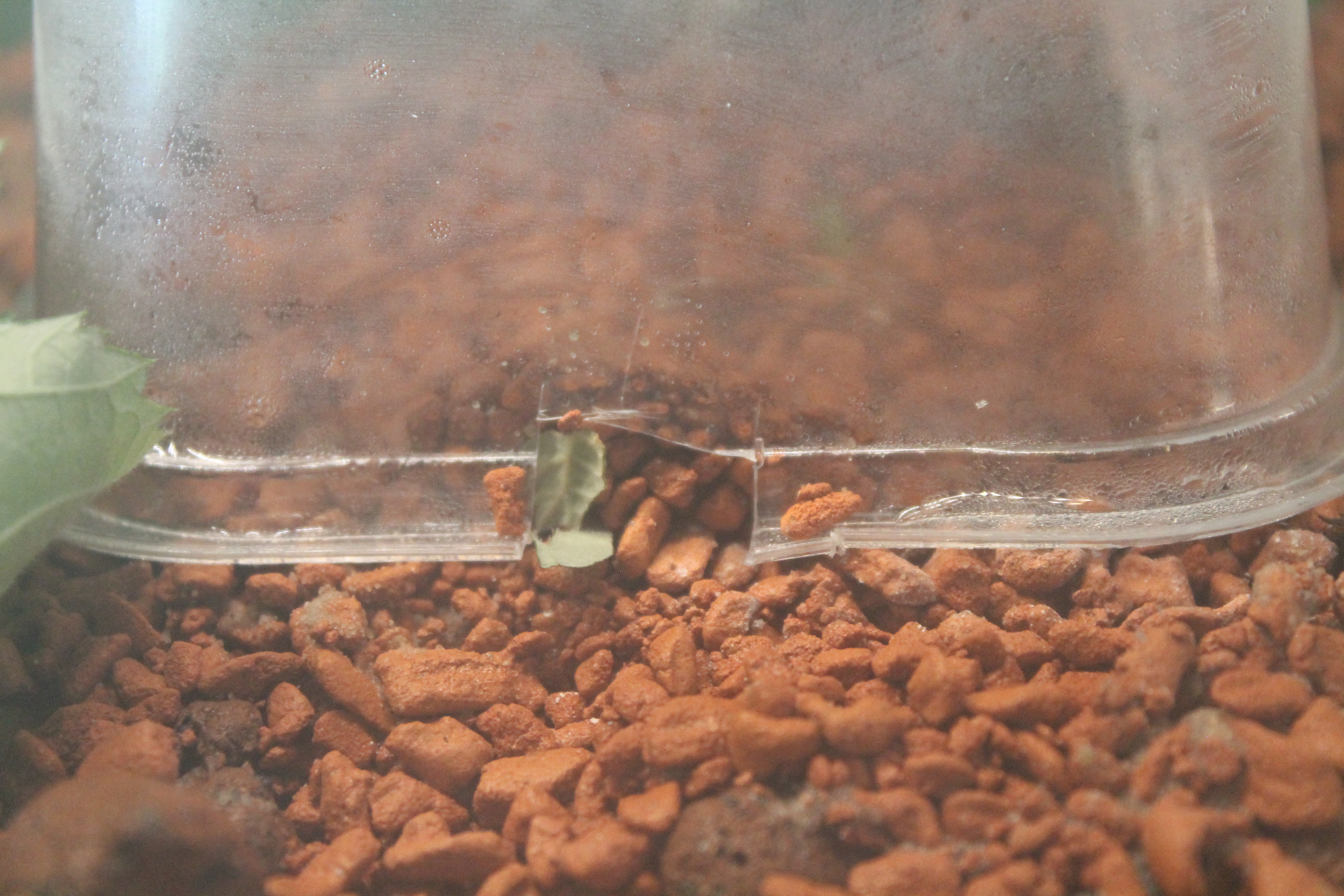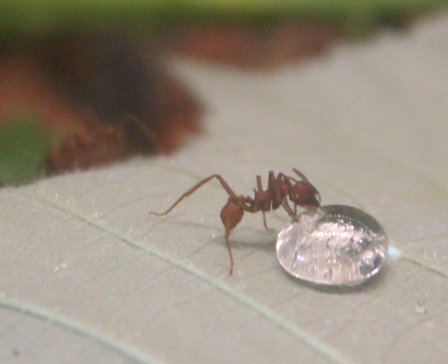 Wie man sieht ist die neue Kuppel beschlagen, was an der anderen nicht war. Ich denke daher schon, dass es eine Verbesserung ist. Über Nacht wurde der Eingang zugeschaufelt. Hätte ich mir denken können. Bei der anderen Abdeckung war es ebenso und sie gingen an der Rückseite durch einen kleinen Spalt in die Kuppel rein. Blätter wurden dazu waagerecht gelegt. Sie sind wieder am Schneiden. Dieses Mal konnte ich beobachten, dass sie auch am Stamm der Brombeere schneiden. Der große Tropfen von dem sie trinken ist Invertzucker. Die anderen Wasser. Durch den Lotus-Effekt bleibt der Tropfen unter Spannung. Sie tasten ihn auch immer wieder ab und bleiben nicht kleben.