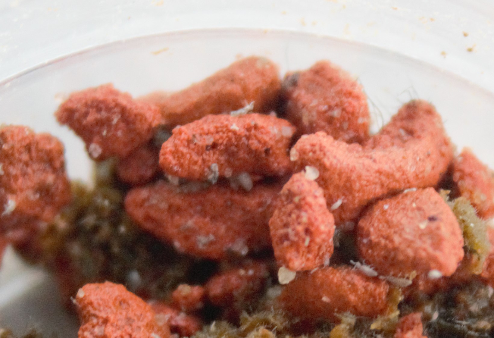 Heute habe ich gesehen, dass an einer Stelle der Pilzkuppel wohl etwas Müllhalde war der Ameisen. Dort tummelten sich recht viele der kleinen Untermieter. Hab da einiges abgeschöpft um sie etwas zu reduzieren. Morgen werde ich mal unter dem Mikroskop schauen. Bis dahin mal ein Bild davon. Die sind sehr klein und sehr schnell. Wie man es auch von UFOs kennt gibts halt nur unscharfe Bilder