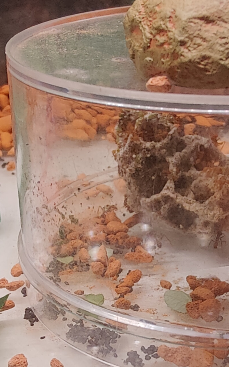 Immer mal sind auchLarven in den Kammern zu sehen und mir sind auch immer wieder mal hellere Arbeiterinnen aufgefallen. Aktuell möchte ich nur gerne den "Milestone" erreichen, die Pilzglocke entfernen zu können. Gerade was Fotos betrifft, wäre das dann wesentlich einfacher.