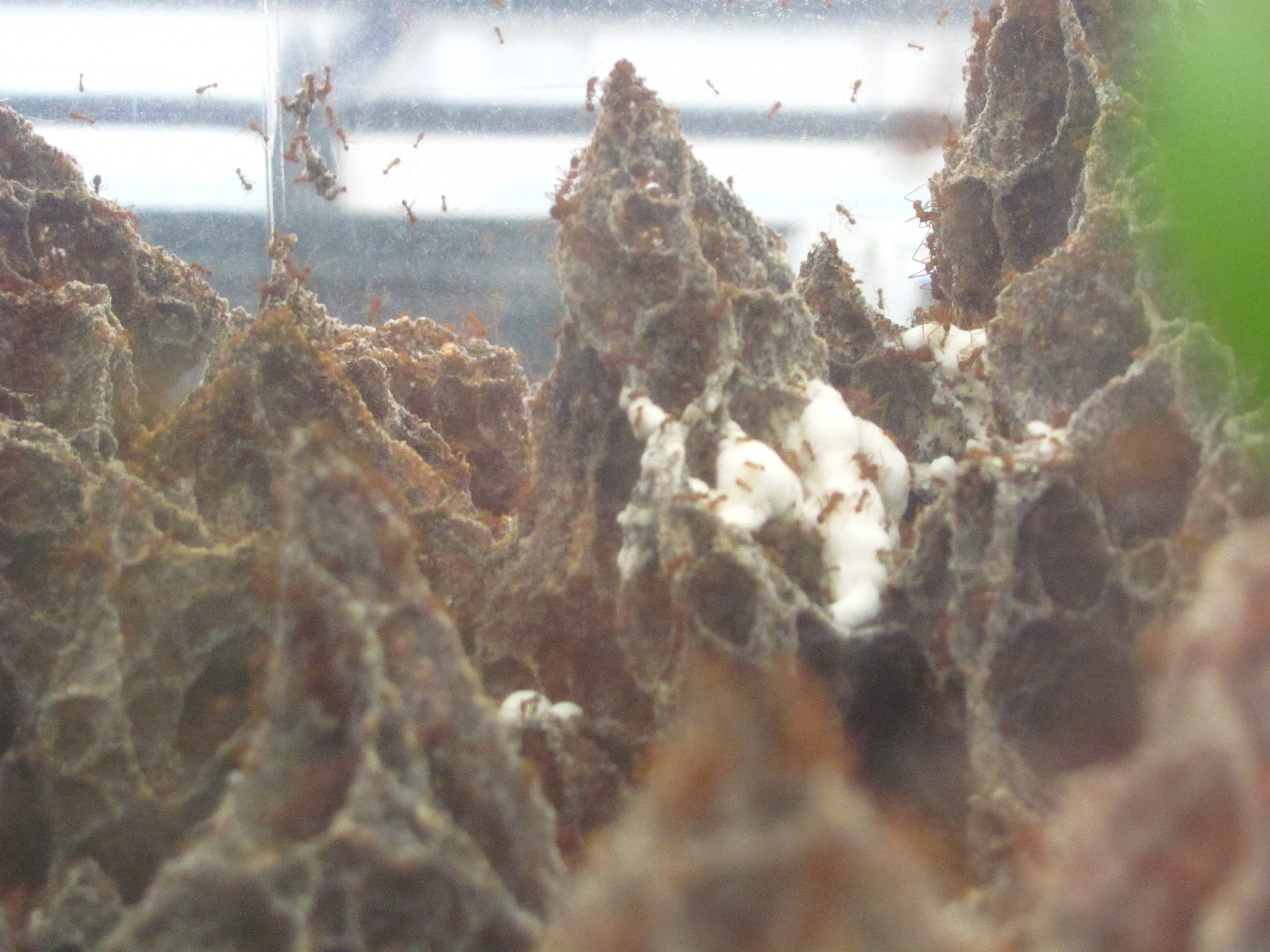 Meine Attakolonie kämpft mit einem wuchernden weissen Pilz im Nest. Dieser bildet schnell wachsende weisse Knollen und nimmt rasch grosse Teile des Nestes ein, wenn man nichts dagegen tut. Ich musste den Pilz schon mehrmals rausschneiden. Ob es der eigene Pilz ist, der übermässig wächst, oder ob sich ein fremder Pilz breit macht im Nest, kann ich nicht sagen.