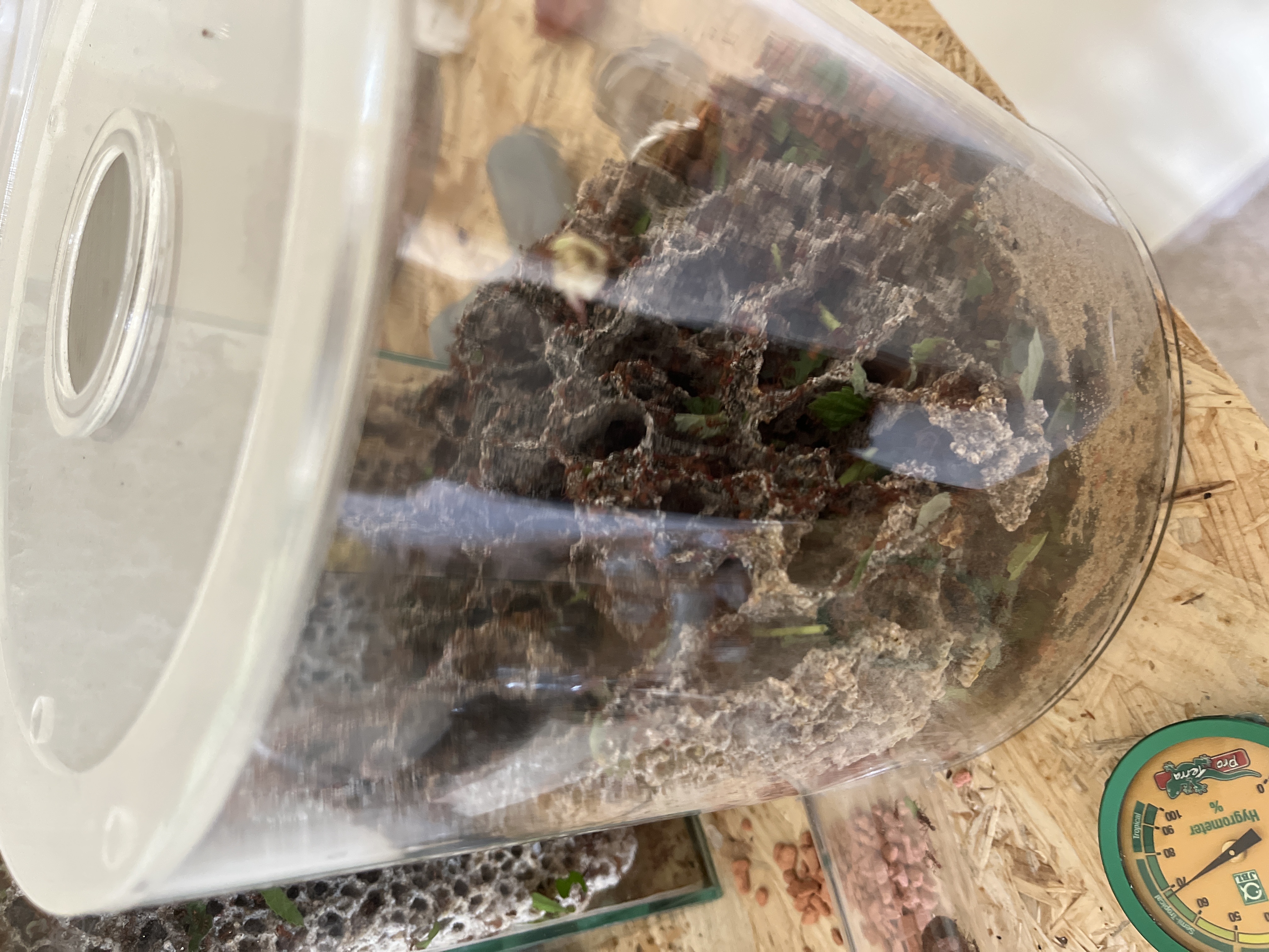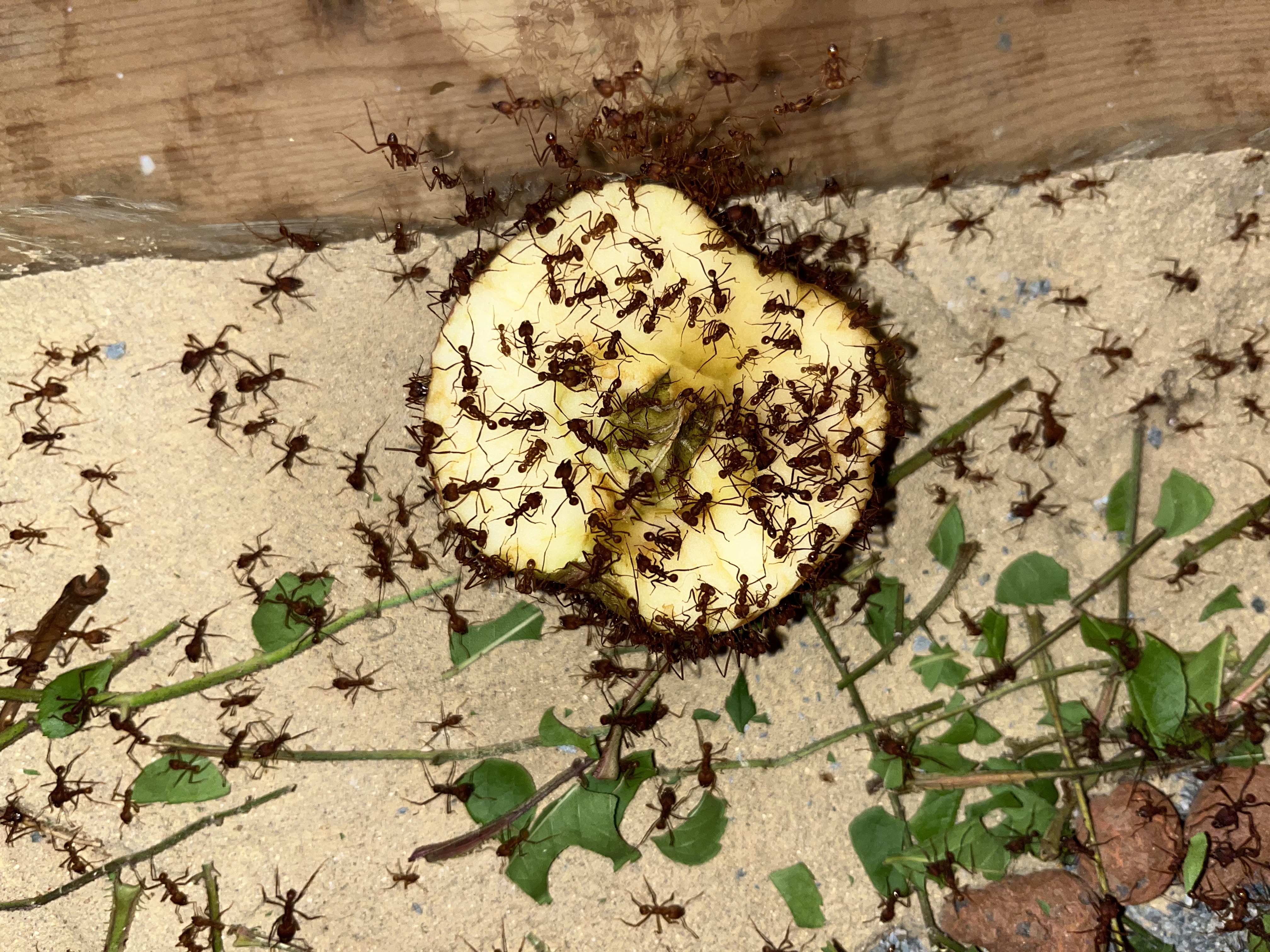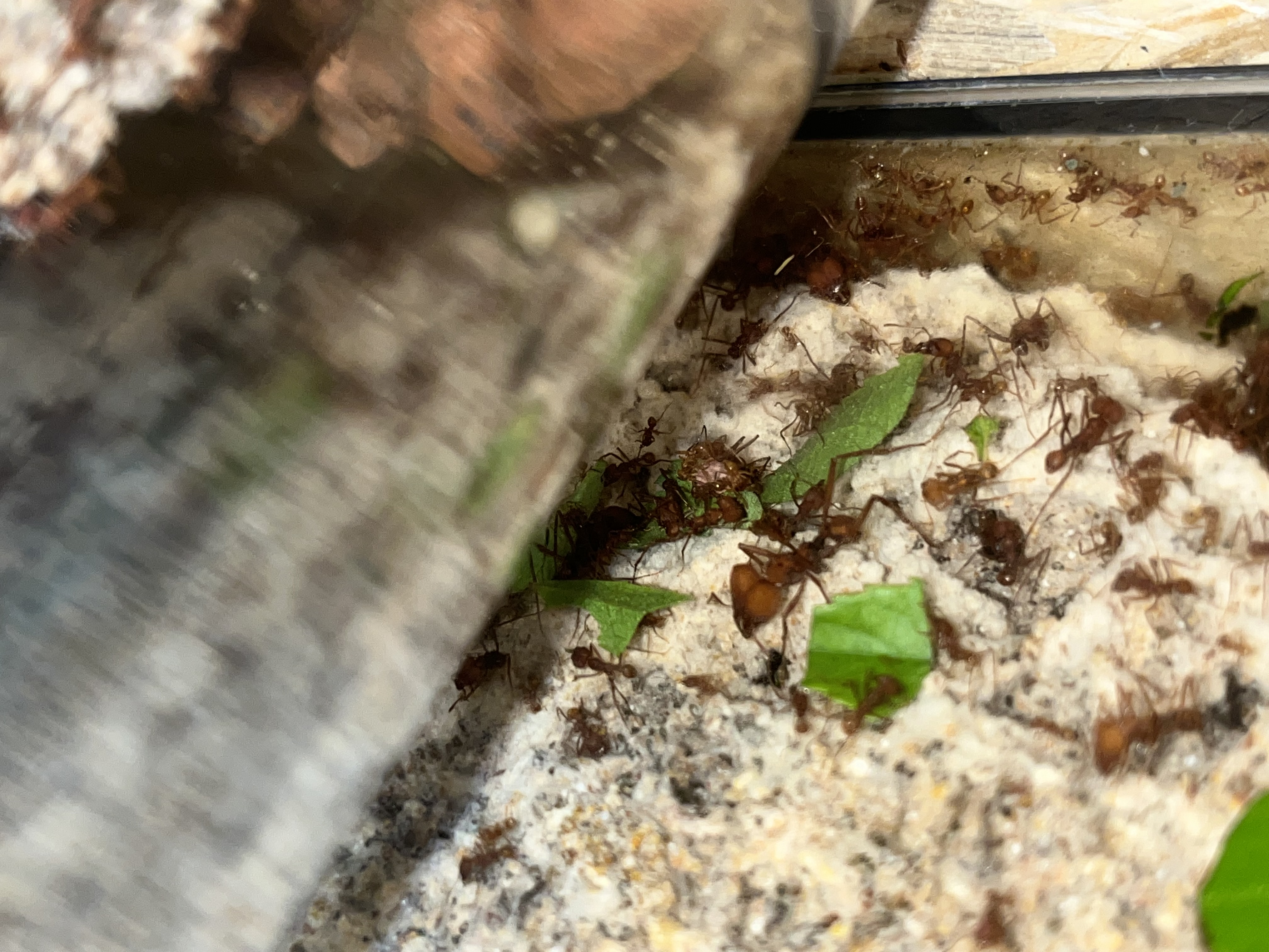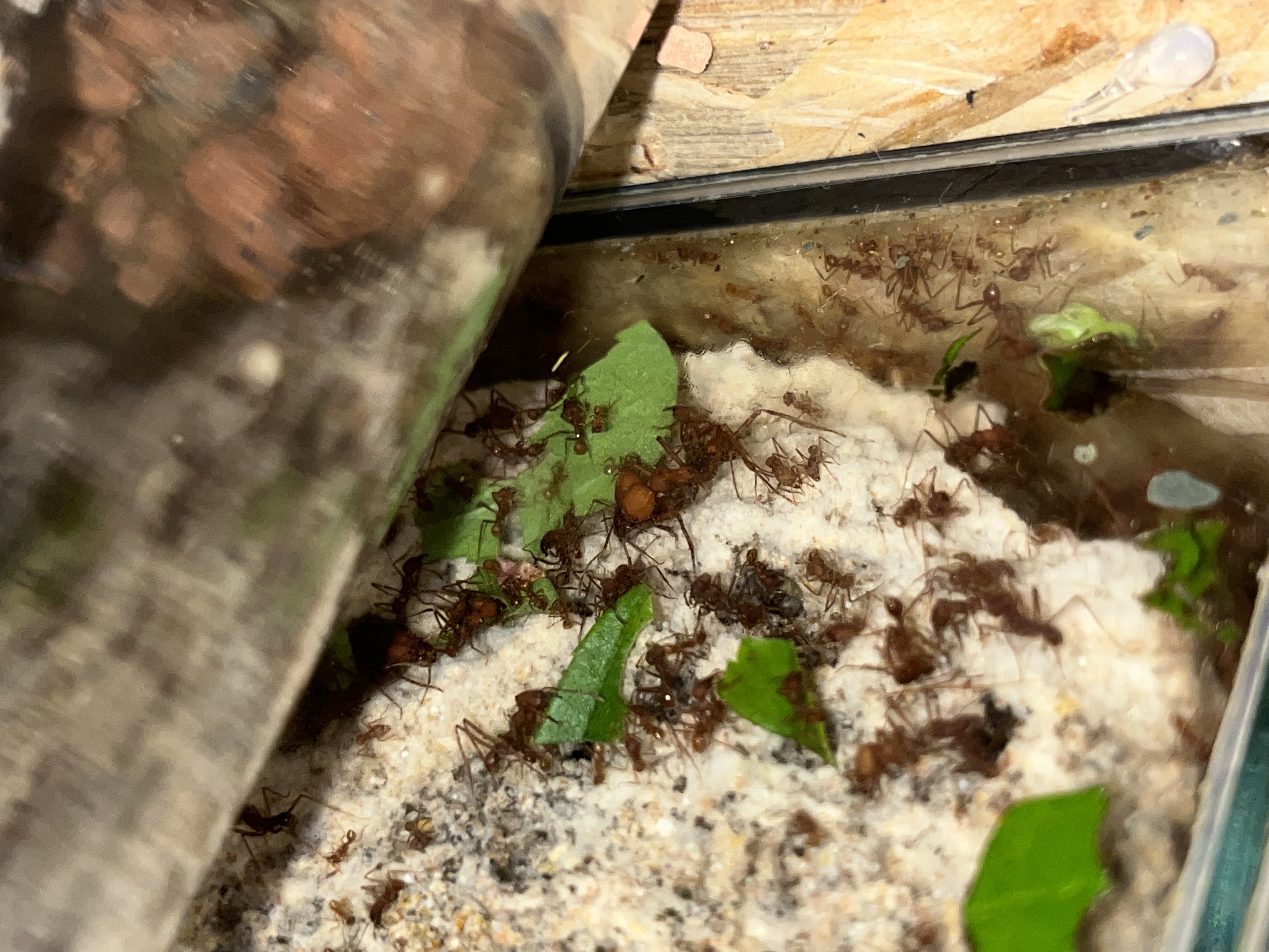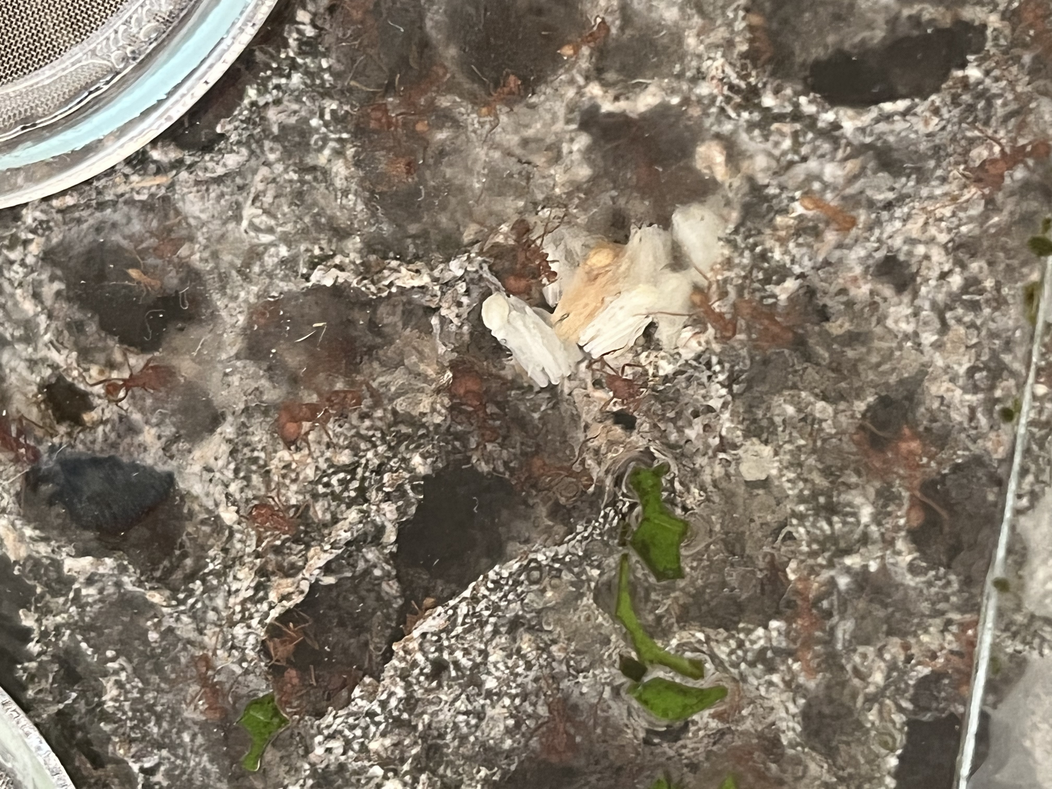 Hier der groĂe Pilz: Da die Arena voll ist, habe ich ein kleines StĂŒck von dem Pilz genommen und in den Zylinder gesetzt. Mein Vorgehen wurde bestens angenommen und der Pilz im Zylinder wĂ€chst richtig gut. Die Zahl der Arbeiterinnen nimmt auch exponentiell zu. Seit Anfang Juni ist es echt extrem geworden. Die ersten gröĂeren Ameisen kann ich auch schon bald begrĂŒĂen in ihrer kleinen Welt, hier mal ein Bild: Heute gab es mal ein StĂŒck Apfel, die streiten sich regelrecht darum.