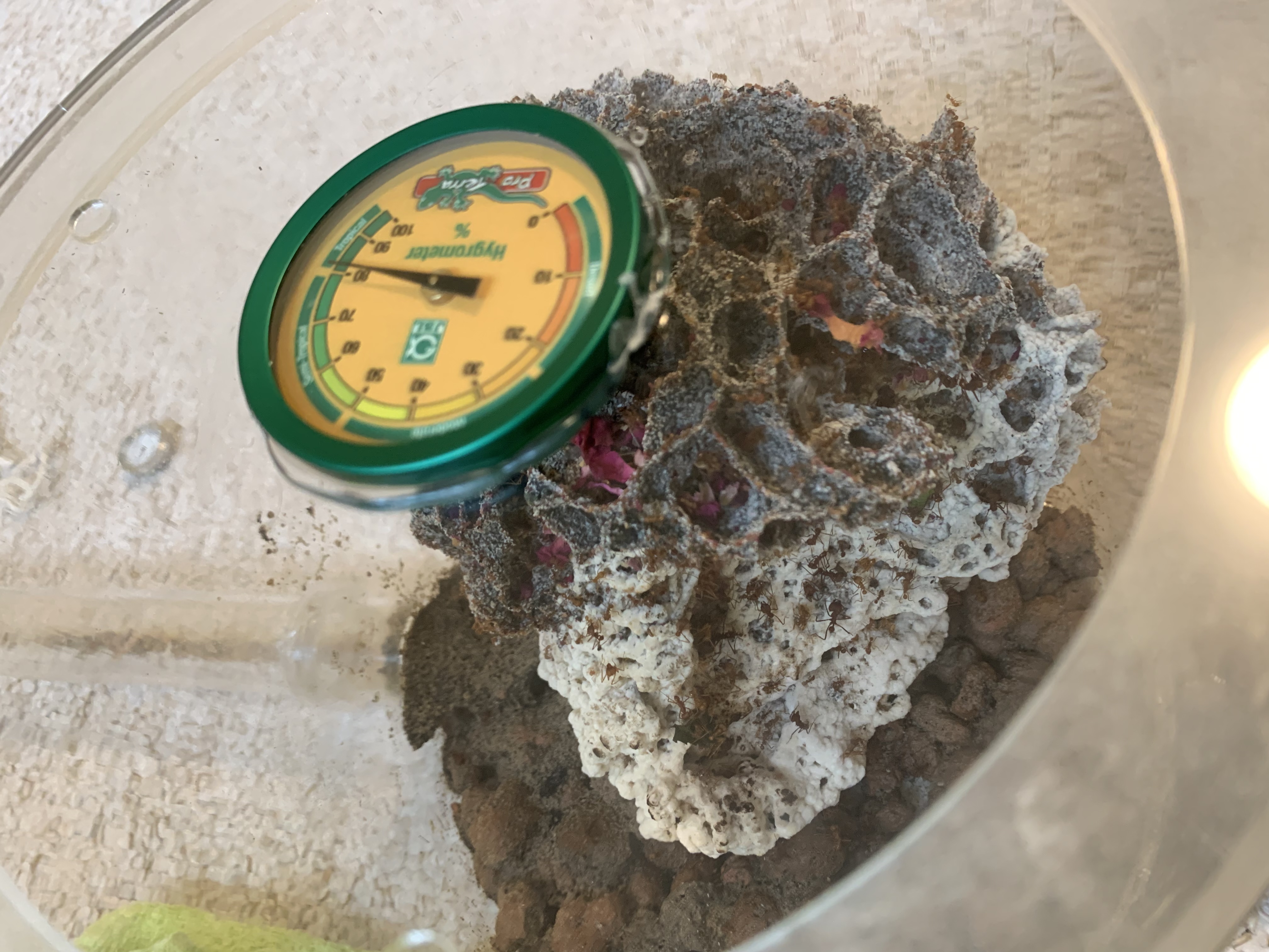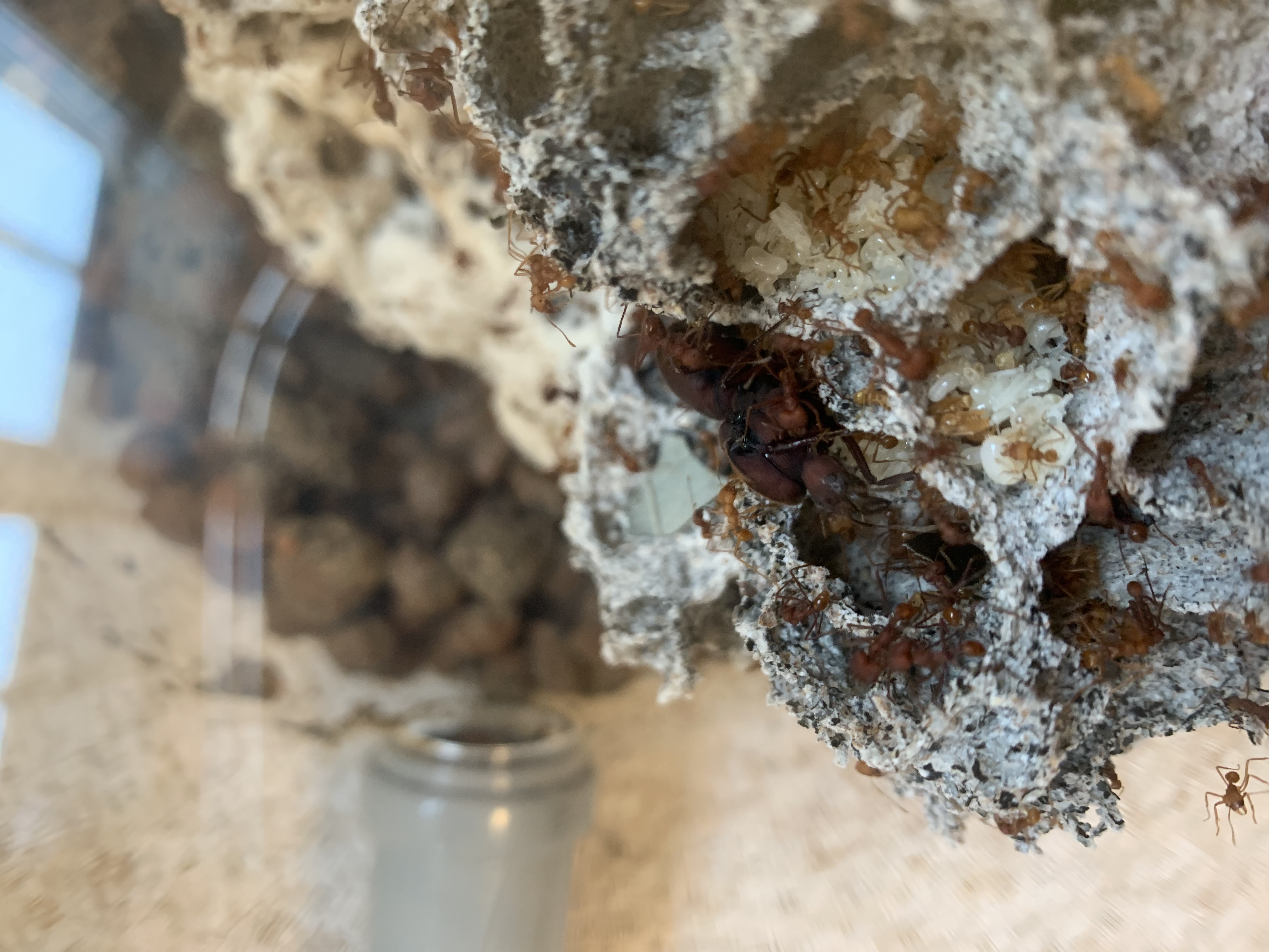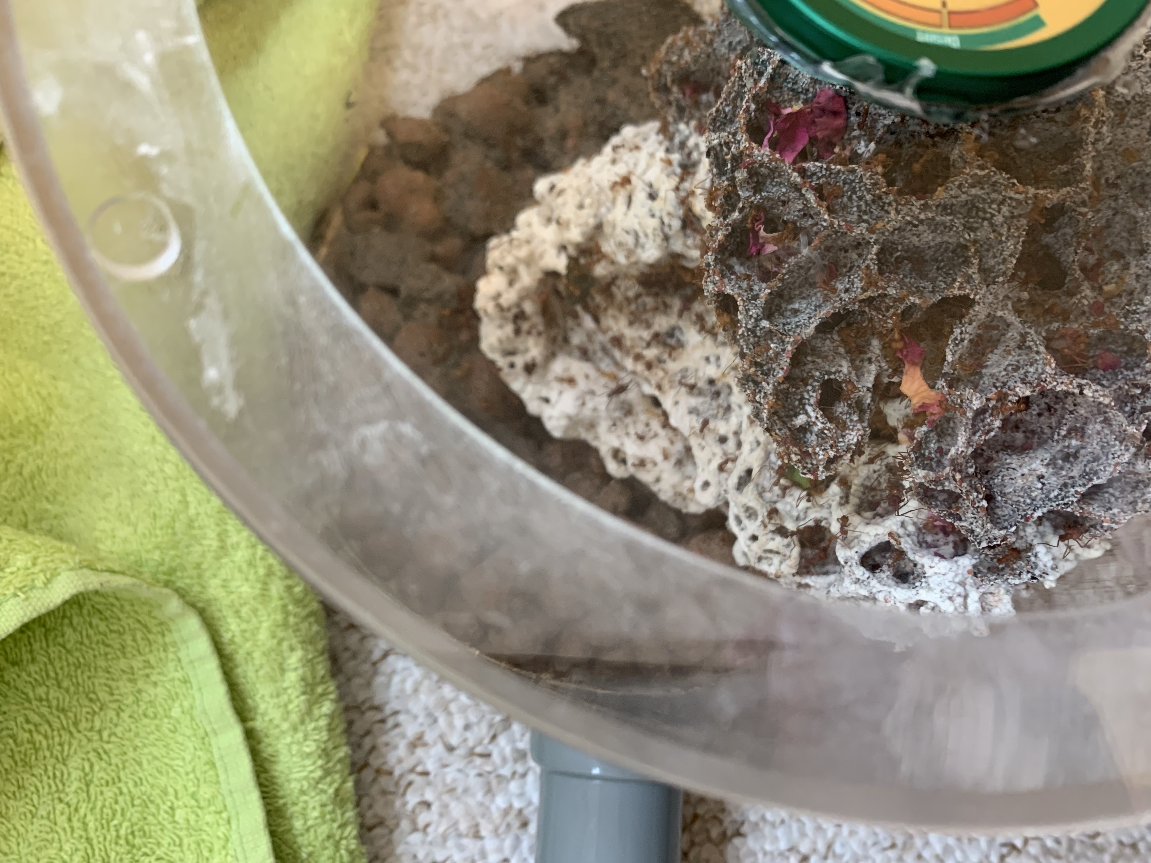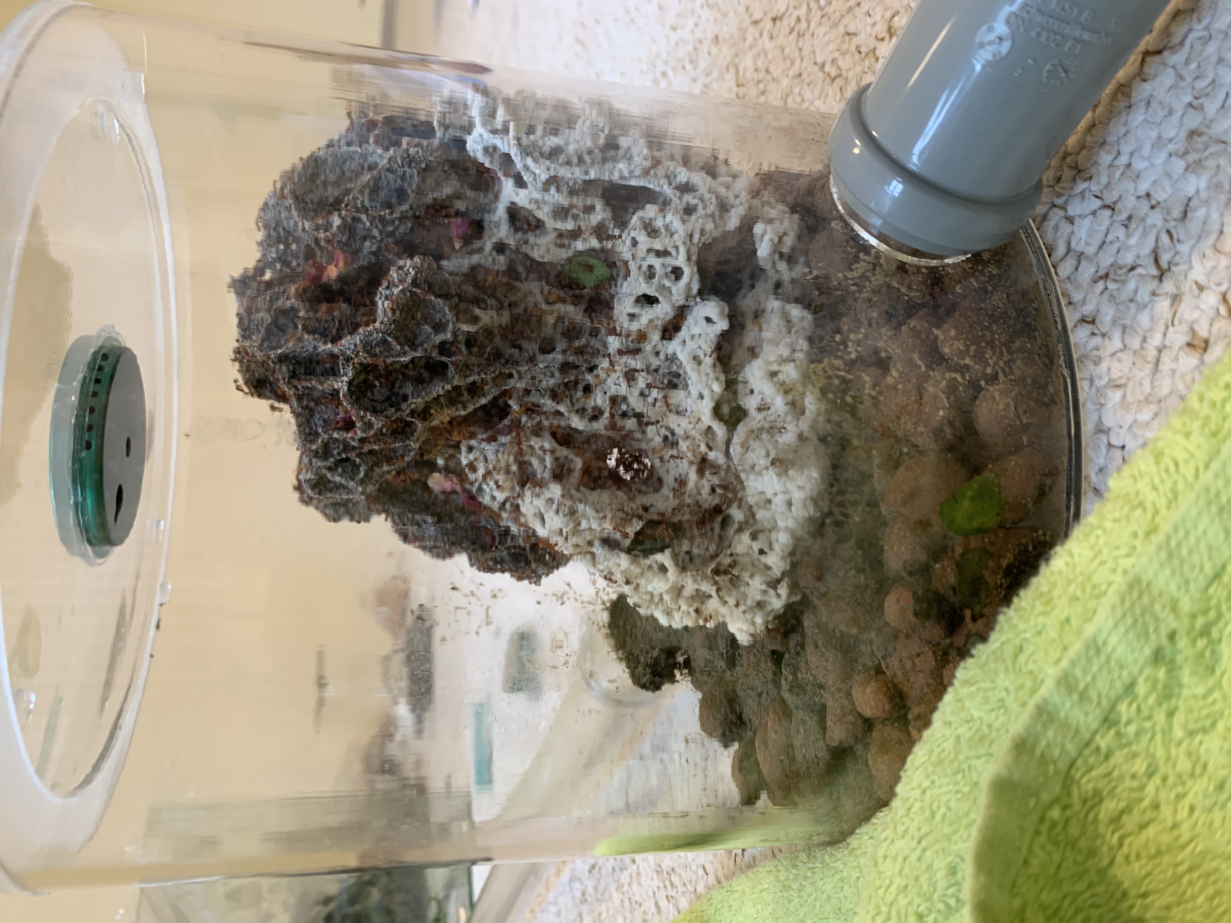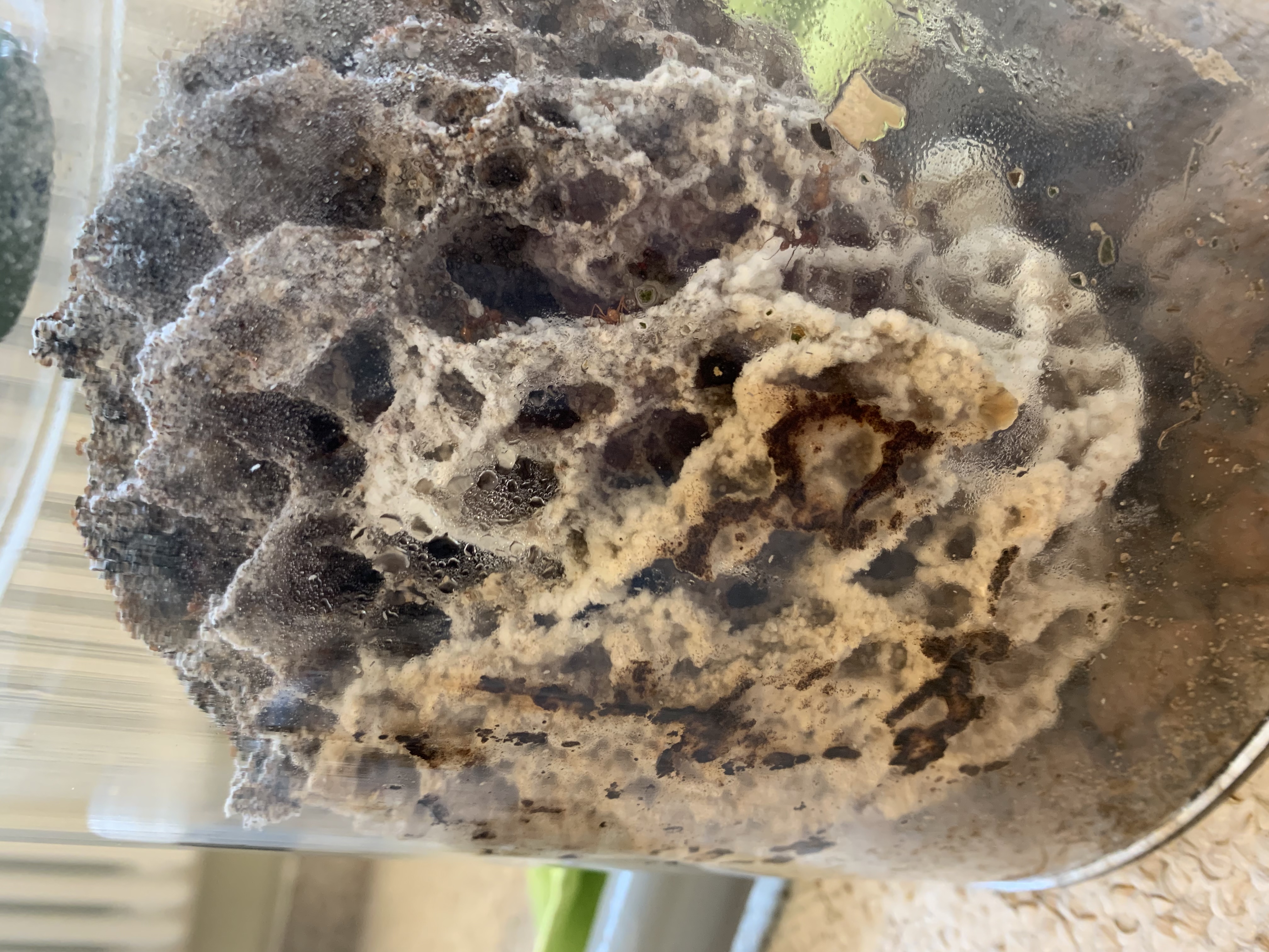 Zu den Atta: Der Pilz wächst sehr gut und die Kolonie ebenso. Das Problem mit den schwarzen Stellen am Pilz hat sich gelegt, da der Pilz umgefallen ist und von den angeschlagenen Stellen der Scheibe weg ist. Seit dem der Pilz umgefallen ist kann man beobachten wie 10-20 Ameisen die kleinen Tröpfchen an der Scheibe trinken.