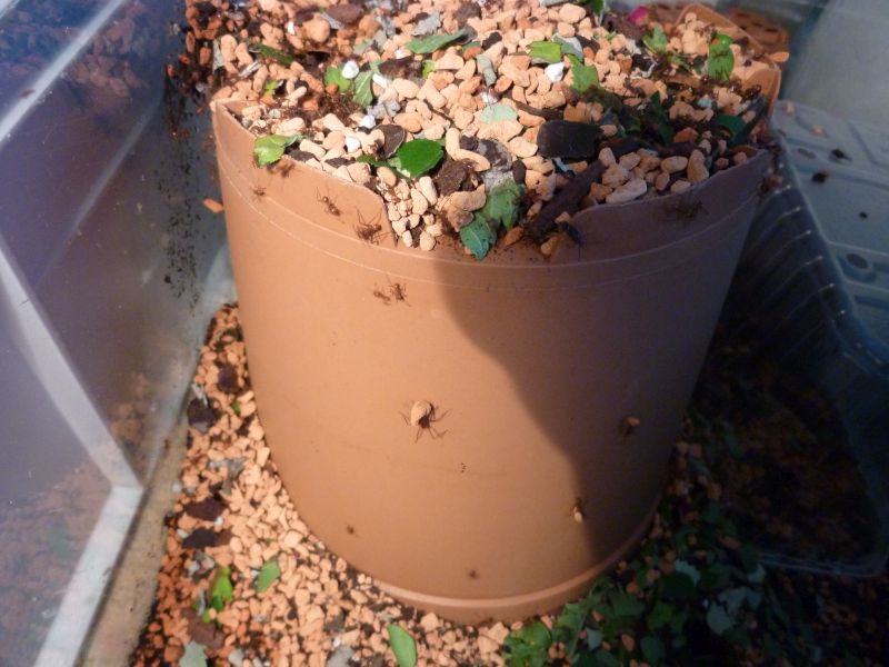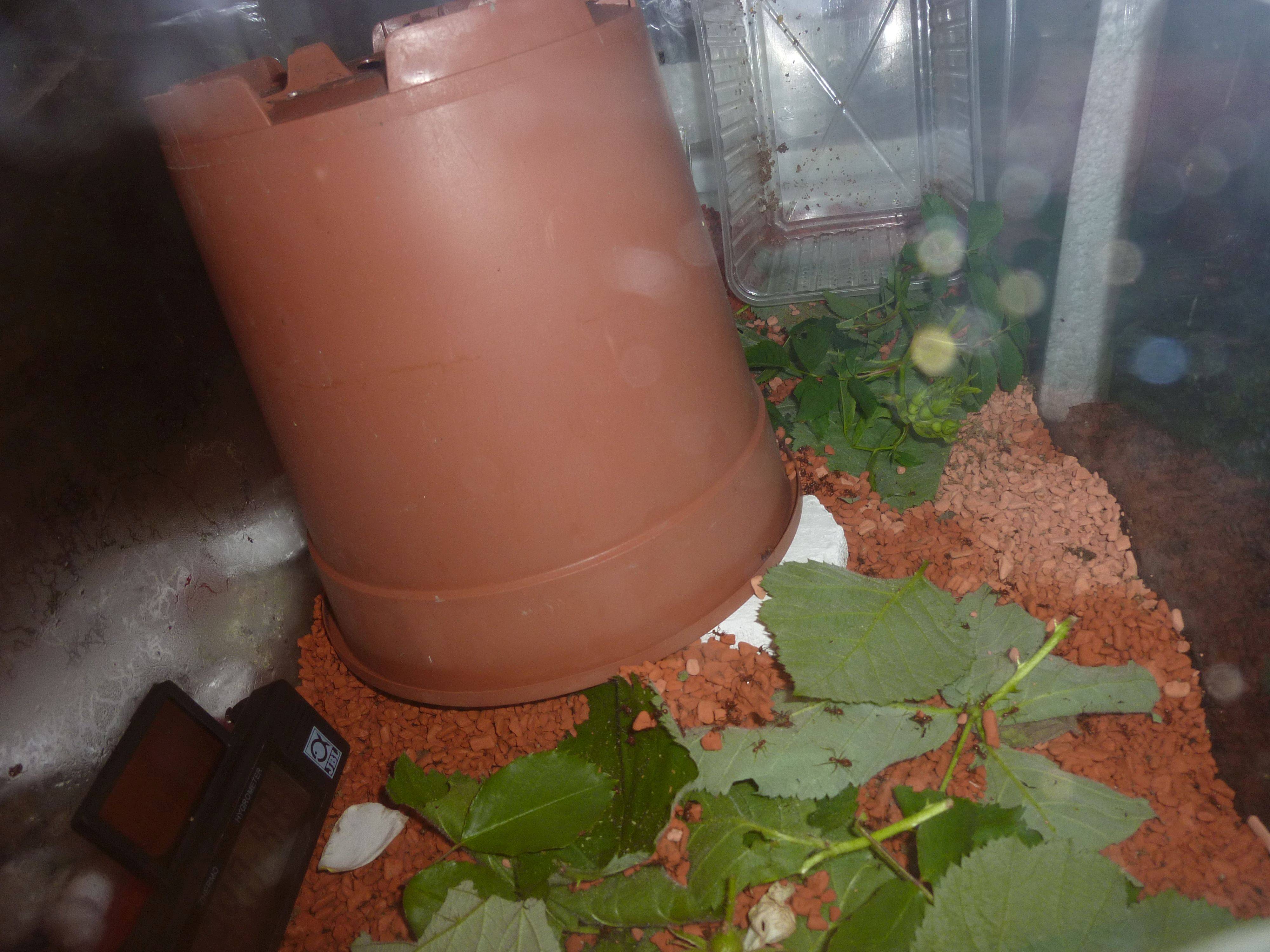 Die Kolonie braucht also nun einen 2. Pilz deswegen habe ich einen 2. Blumentopf und eine Plastickbox in der Pfirsich mal war in das Nestbecken gelegt mit der Hoffnung, dass sie darunter ebenfalls einen weiteren Pilz züchten werden.