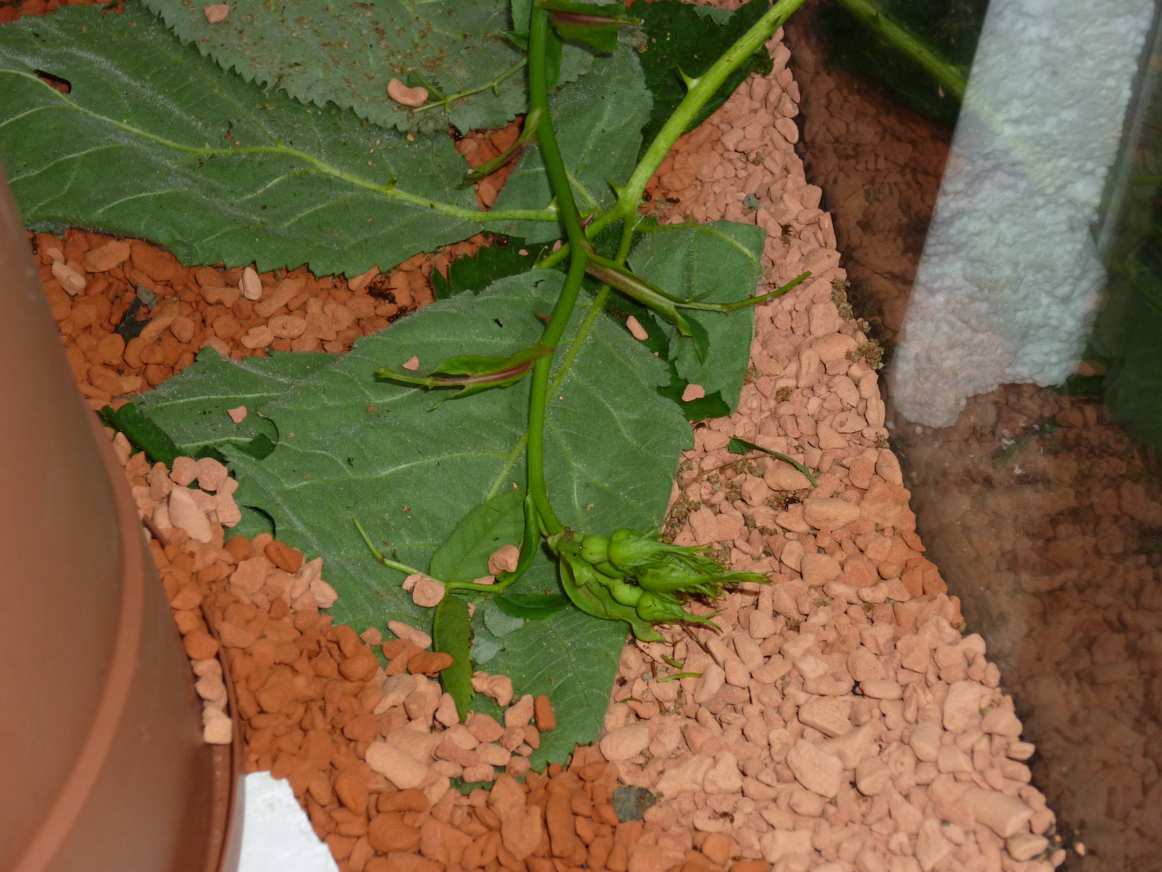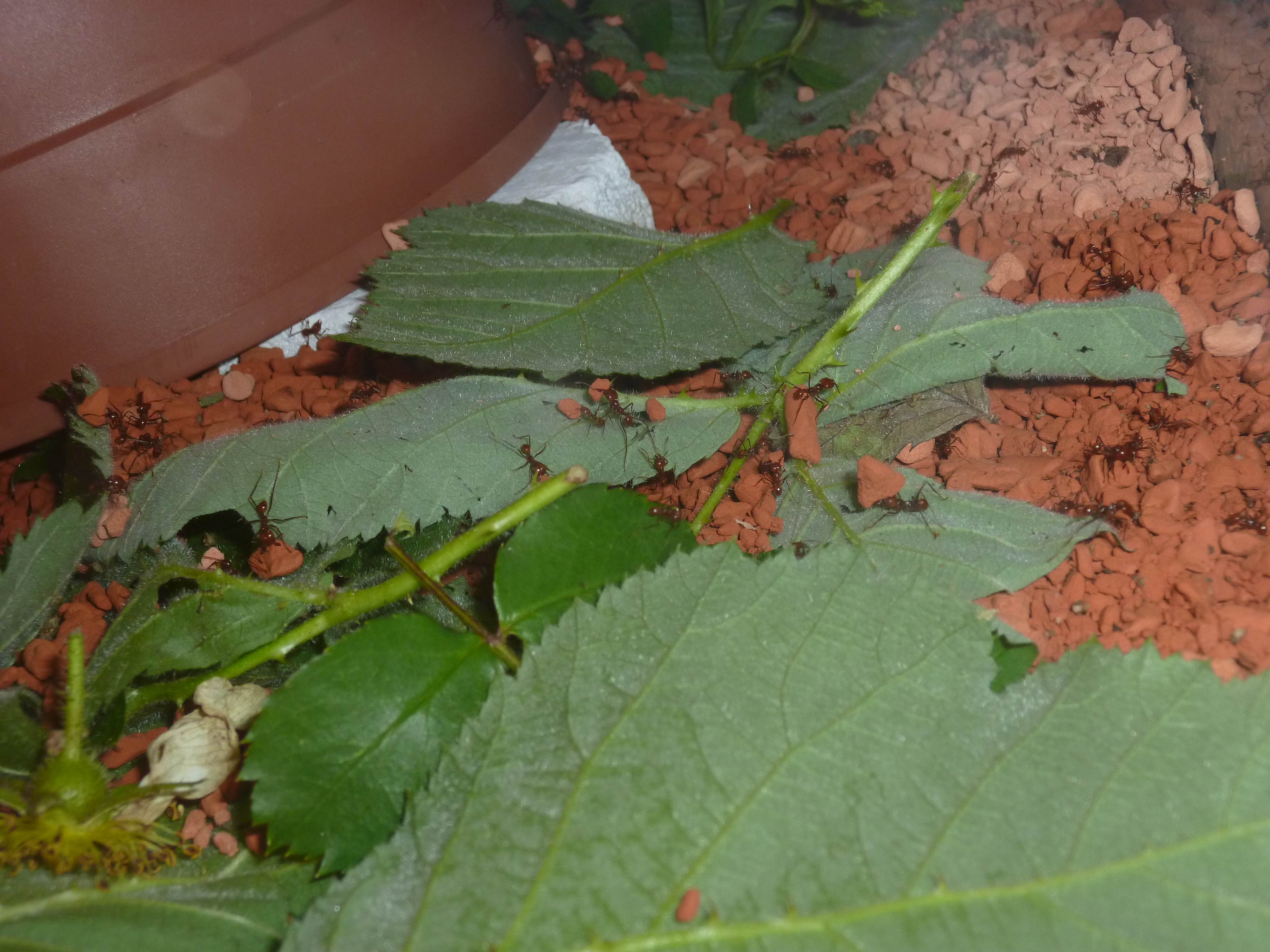 Meine Atta cephalotes (bicolor) haben nun den gesamten Blumentopf befüllt, ich schob heute vorsichtig die Seramissteine und Blattstücke beiseite um durch die Löcher nach dem Pilz zu schauen, ganzer Blumentopf ist voller Pilz.